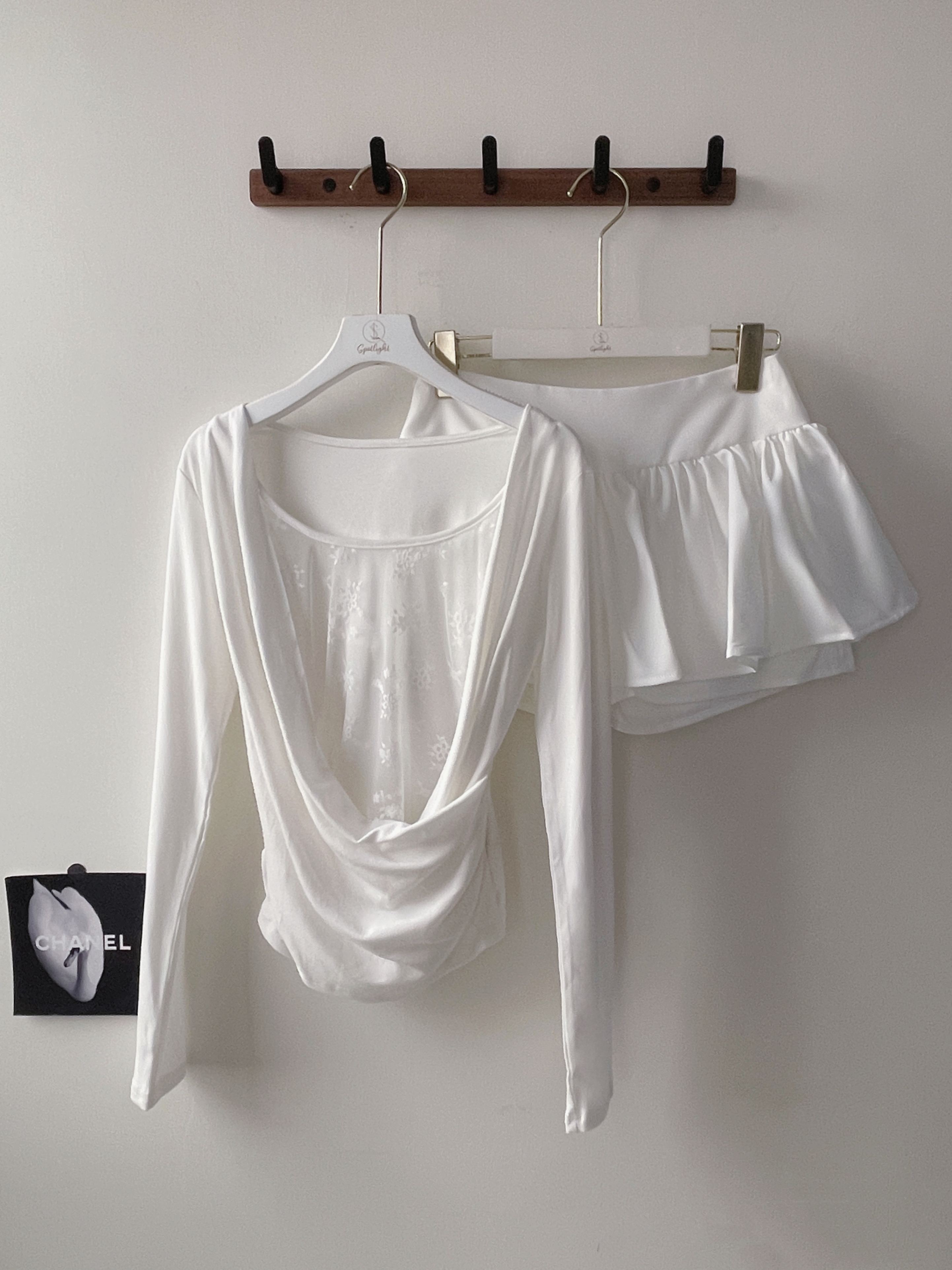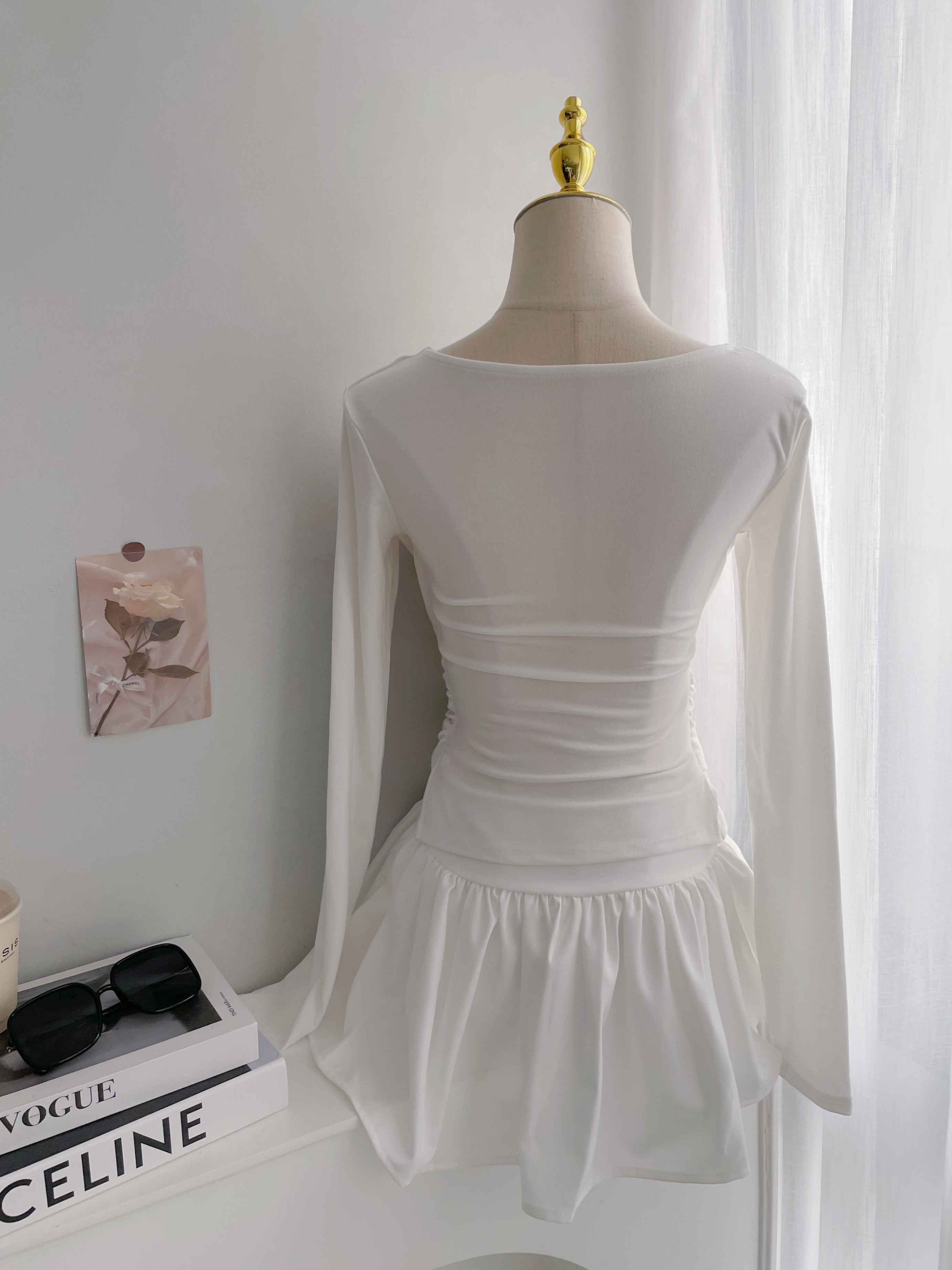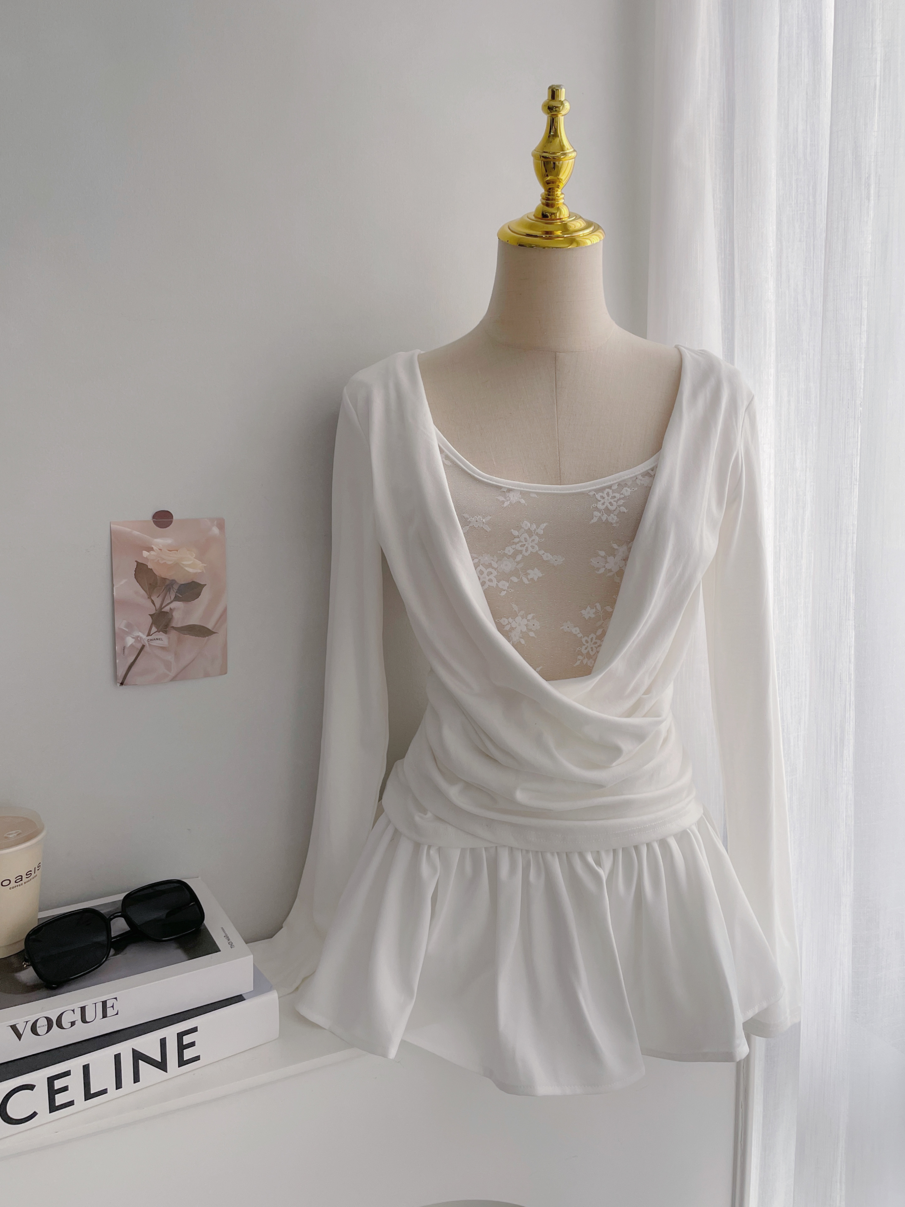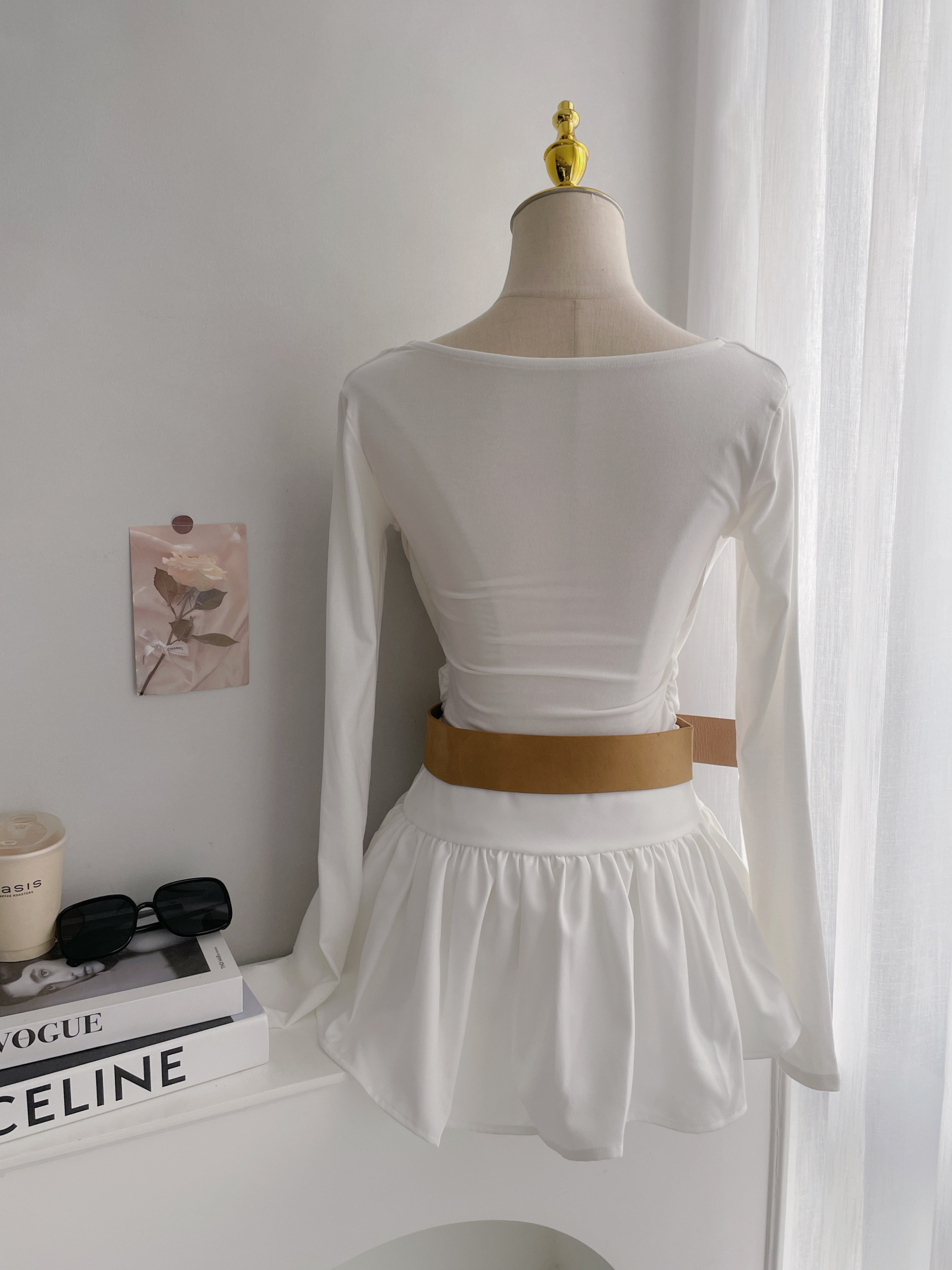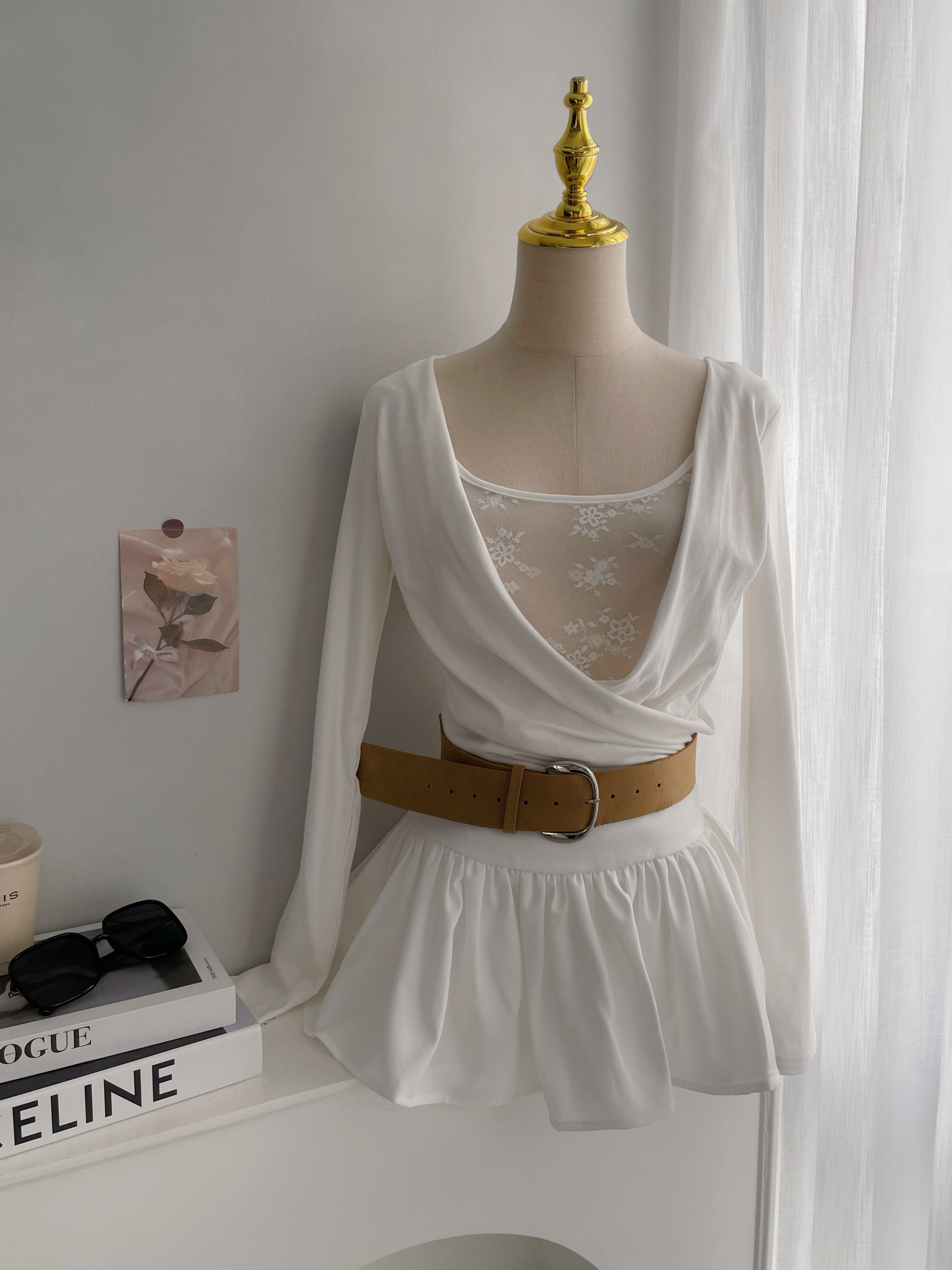【SET】清純若現 蕾絲垂墜U領側抓皺長袖+泡泡百褶短裙附麂皮腰帶