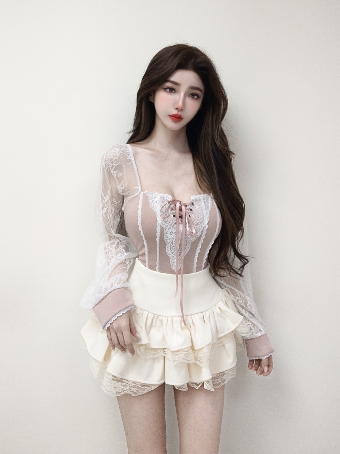 輕舞蕾絲 撞色拼蕾絲綁帶上衣