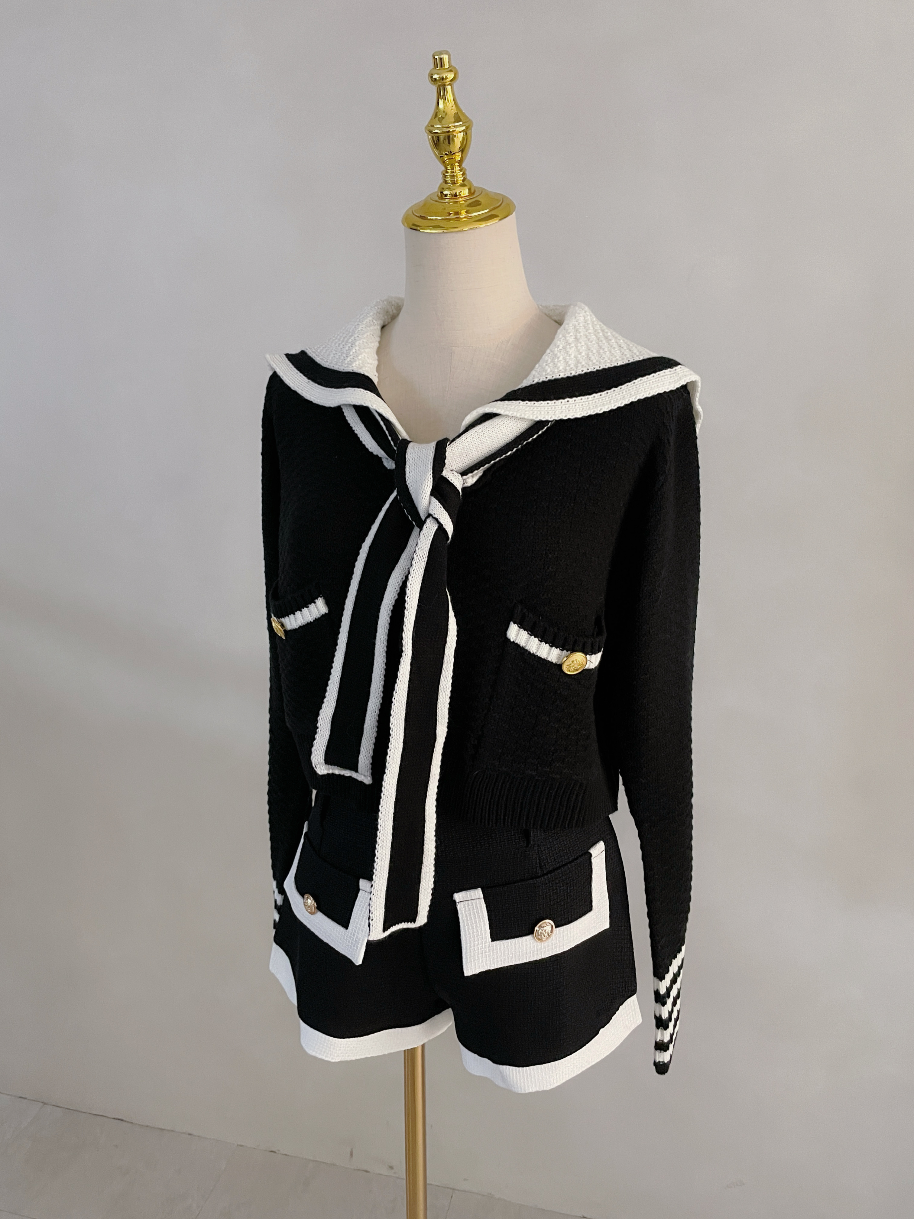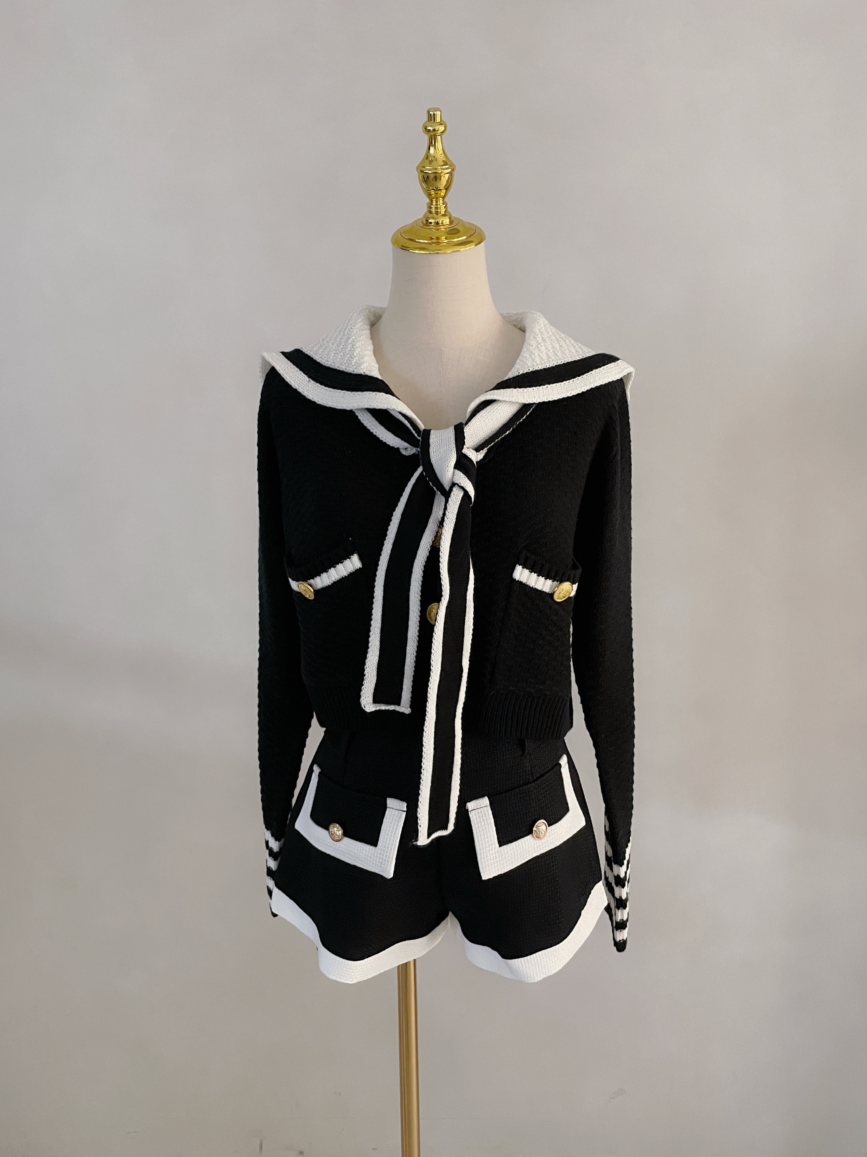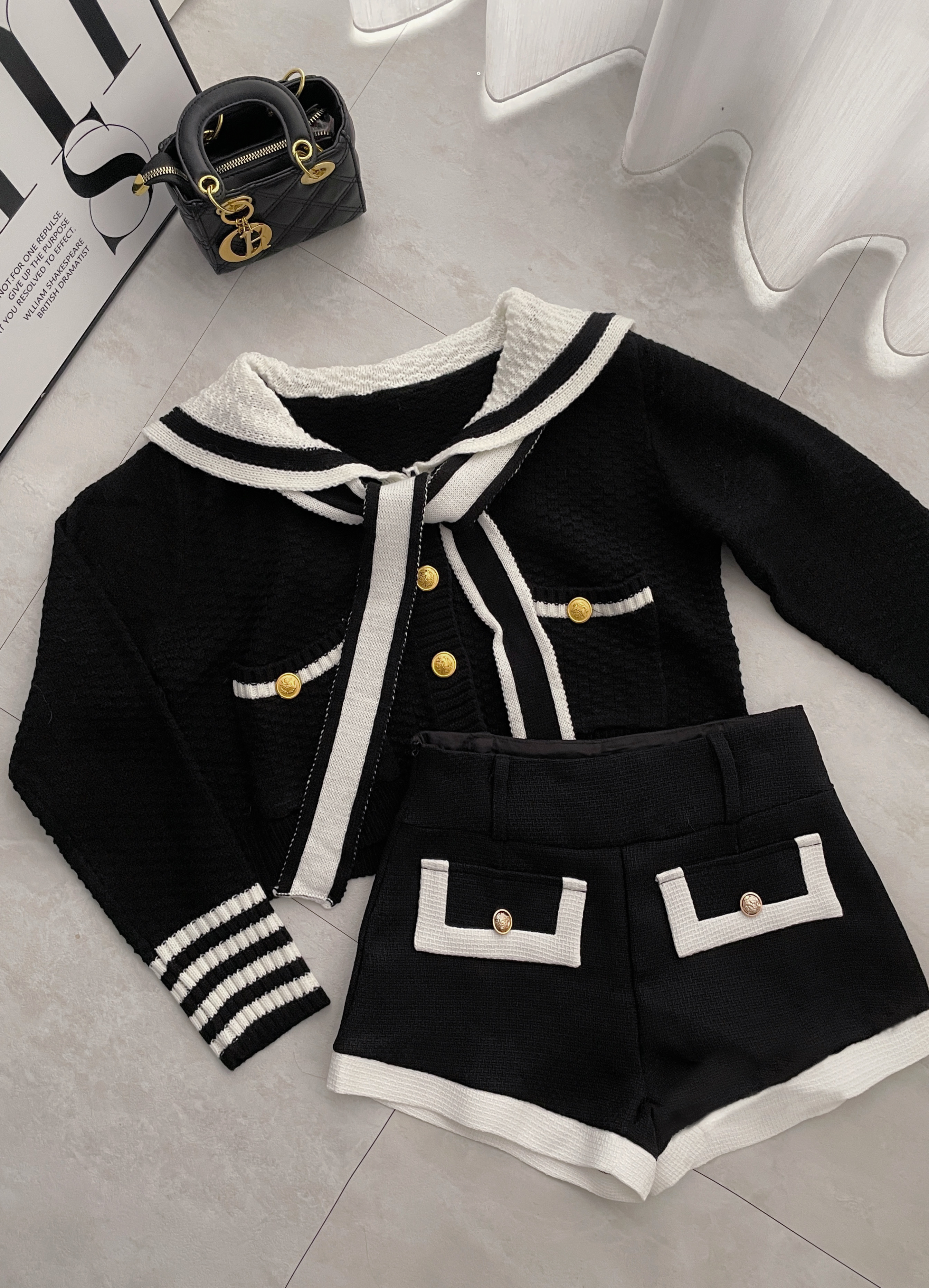 【SET】撞色金釦海軍領針織上衣+小香短褲