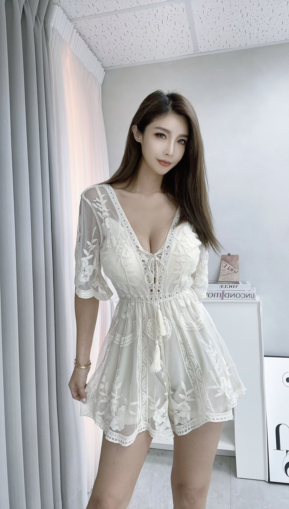 整件服裝以細膩的刺繡設計為主,讓透紗材質看起來輕盈又浪漫,非常適合春夏季節。