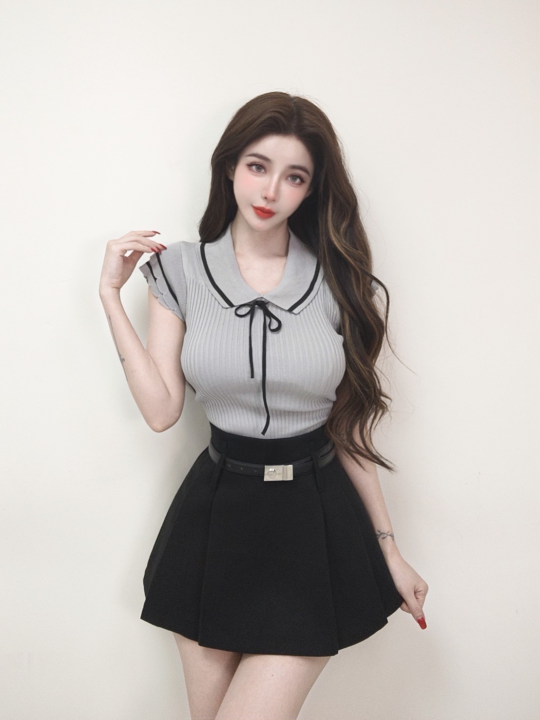 毛呢附方塊腰帶百褶裙