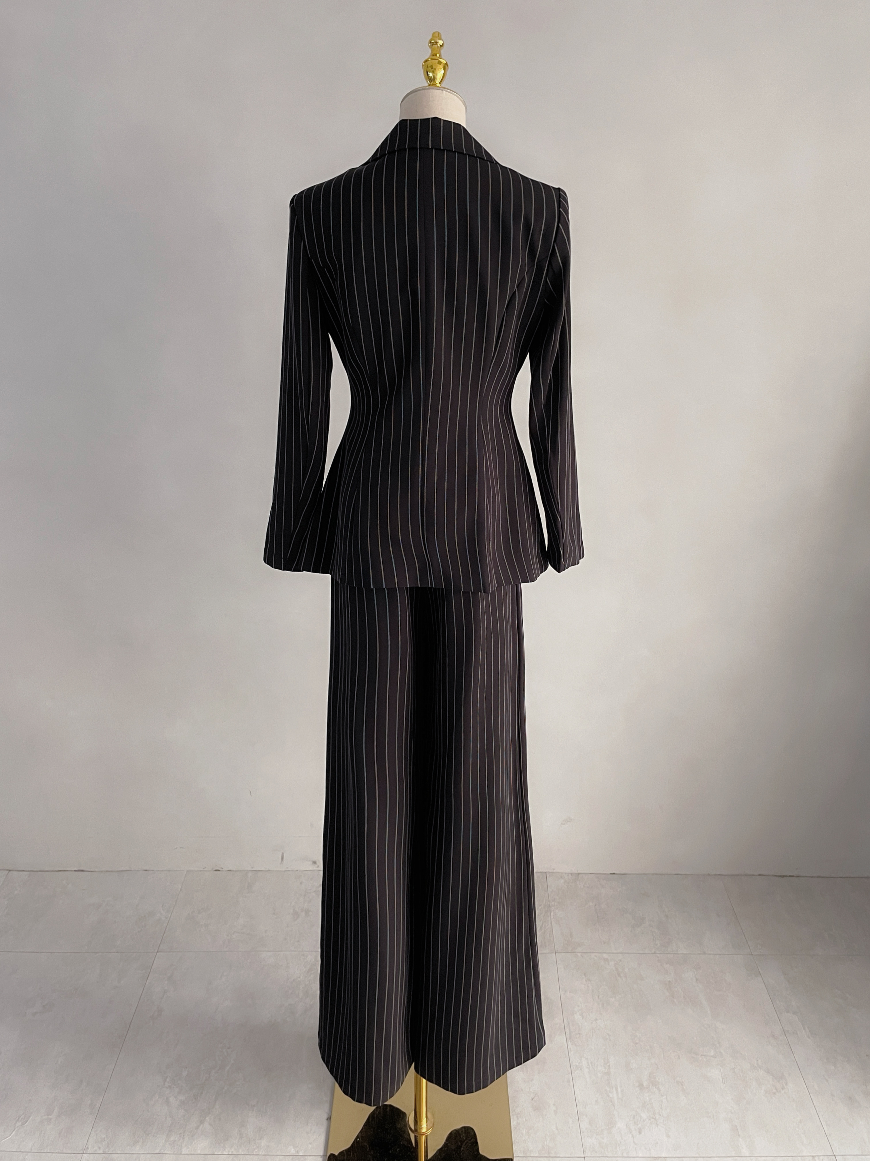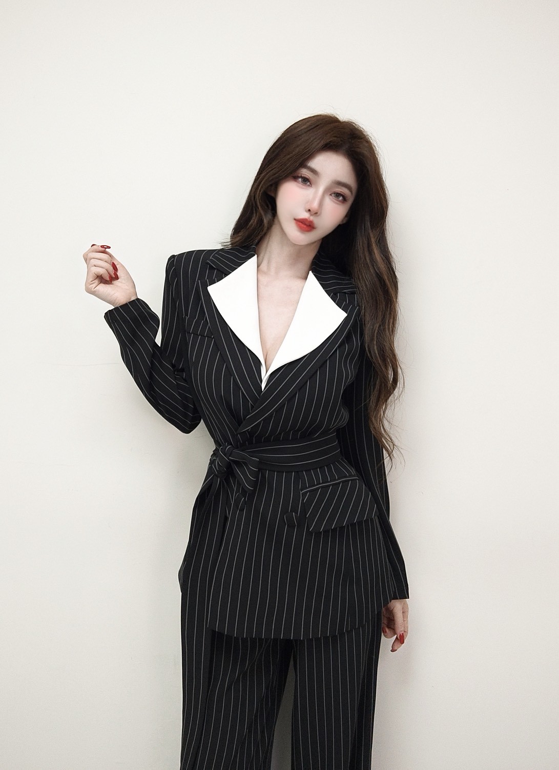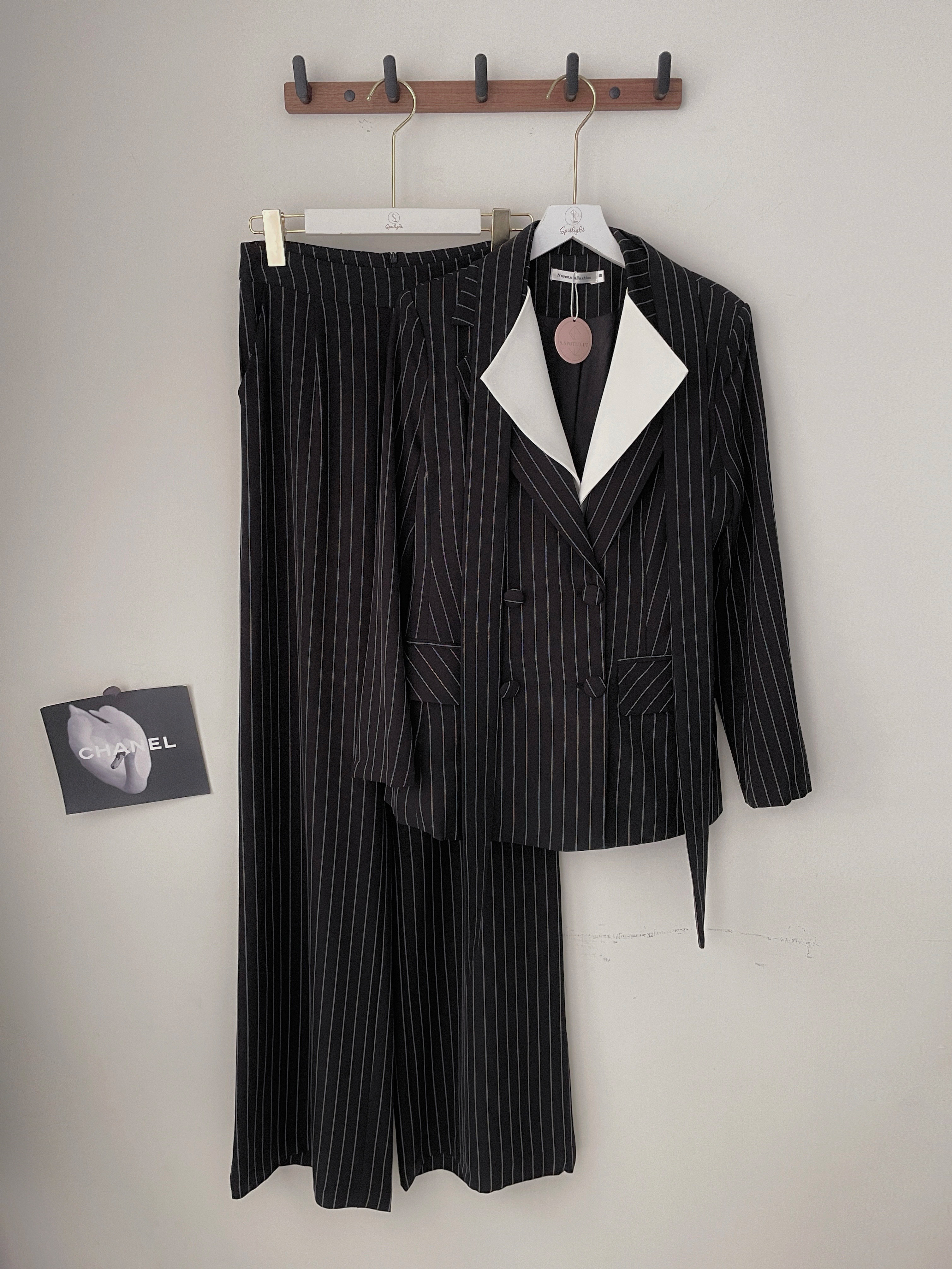 【SET】俐落氣場 翻領直條紋撞色西裝+長寬褲