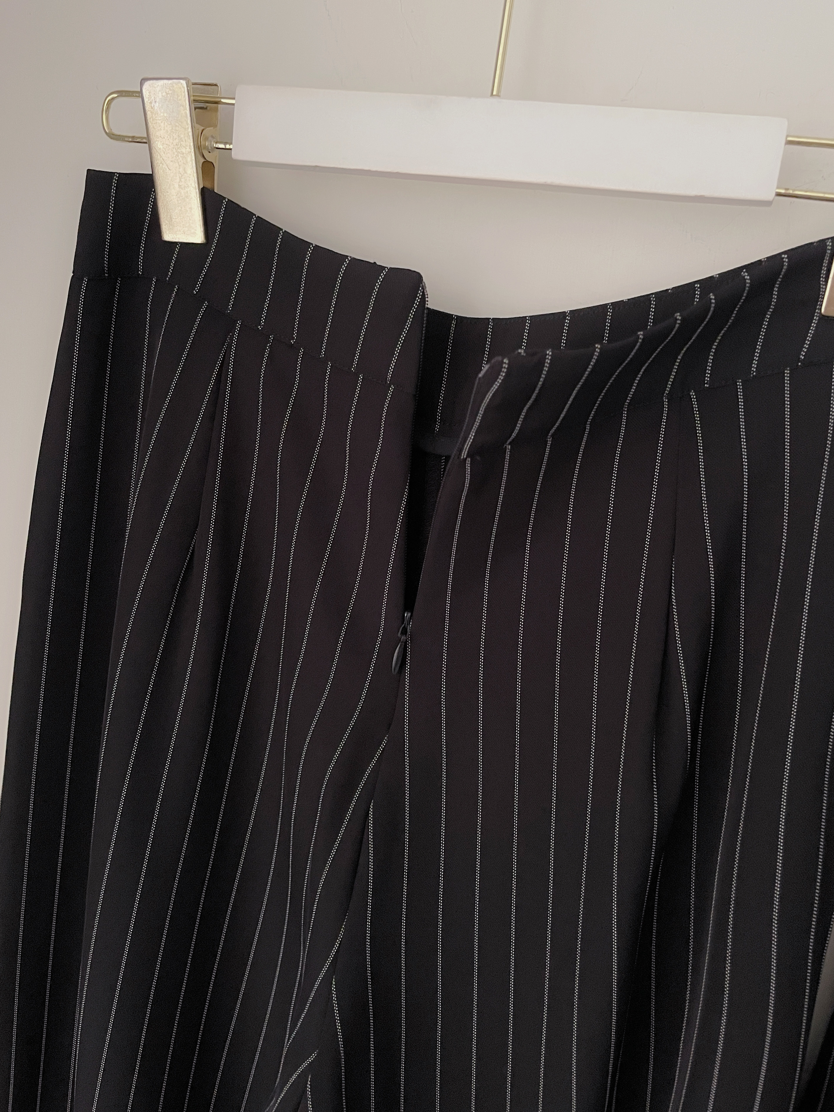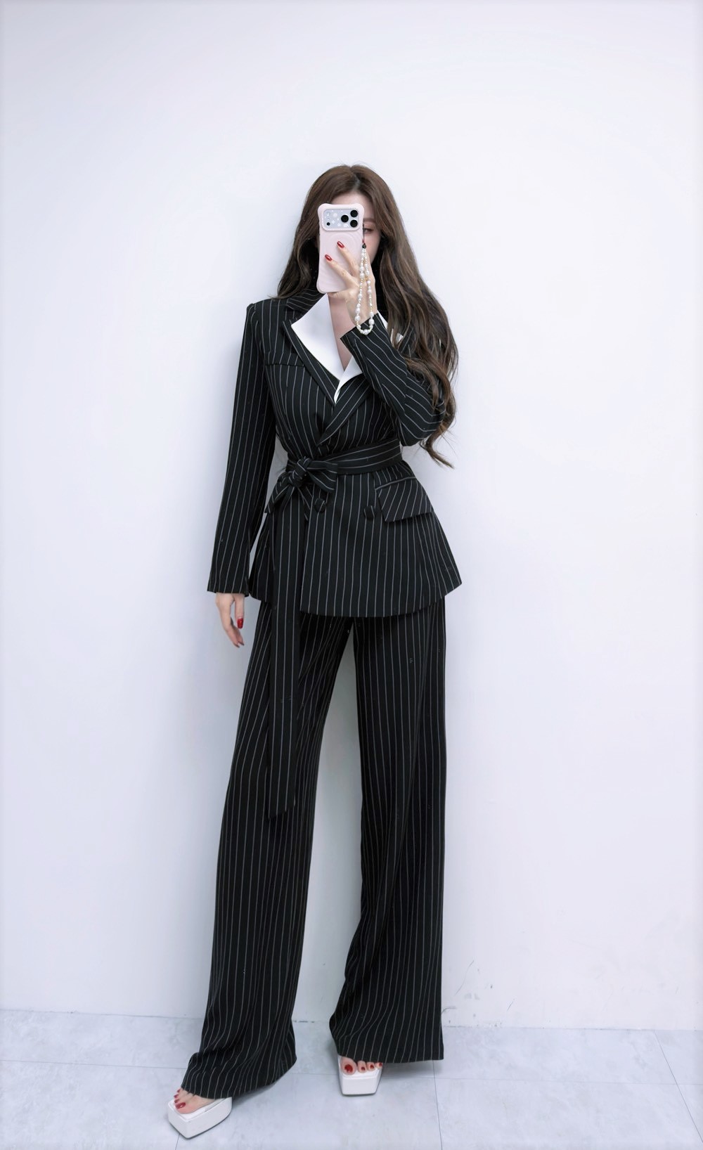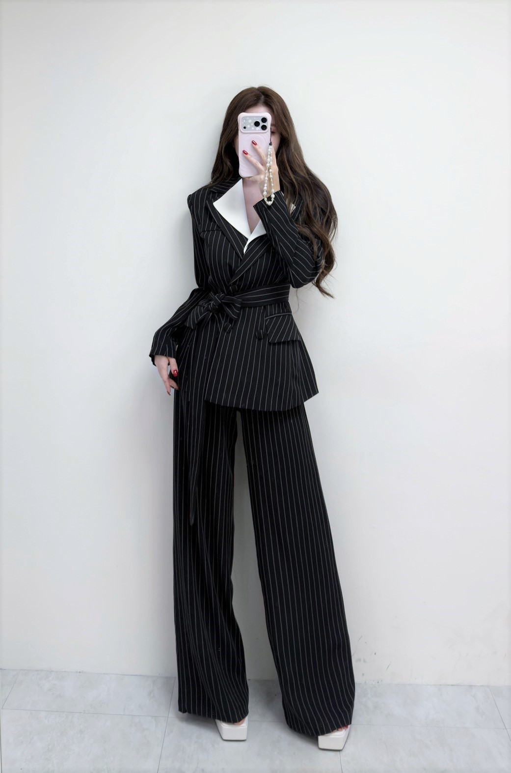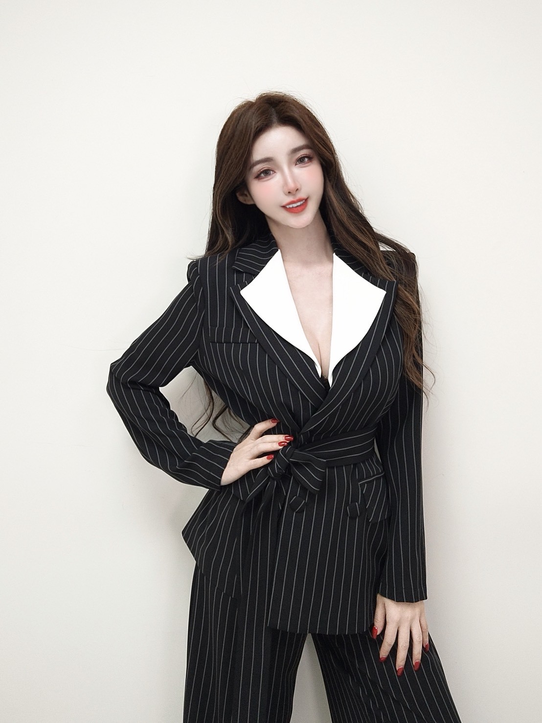 【SET】俐落氣場 翻領直條紋撞色西裝+長寬褲