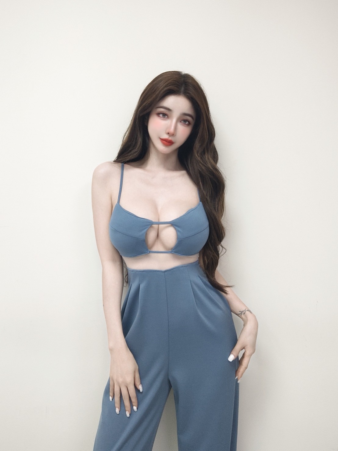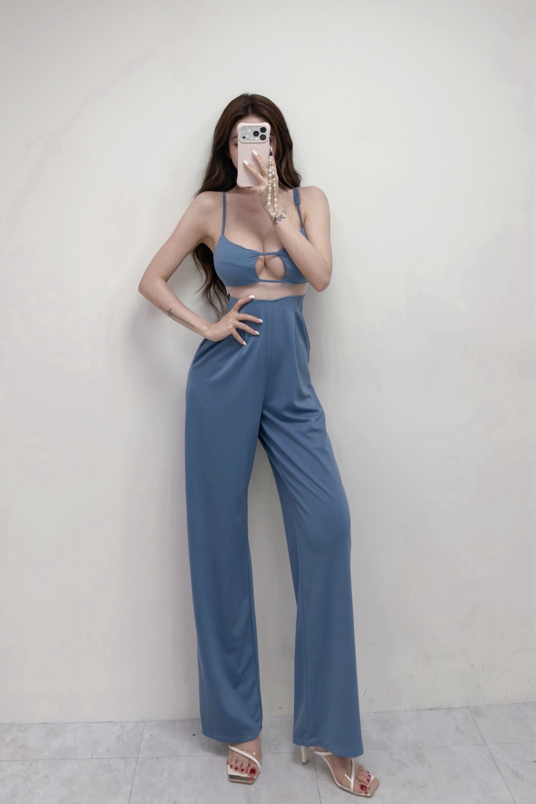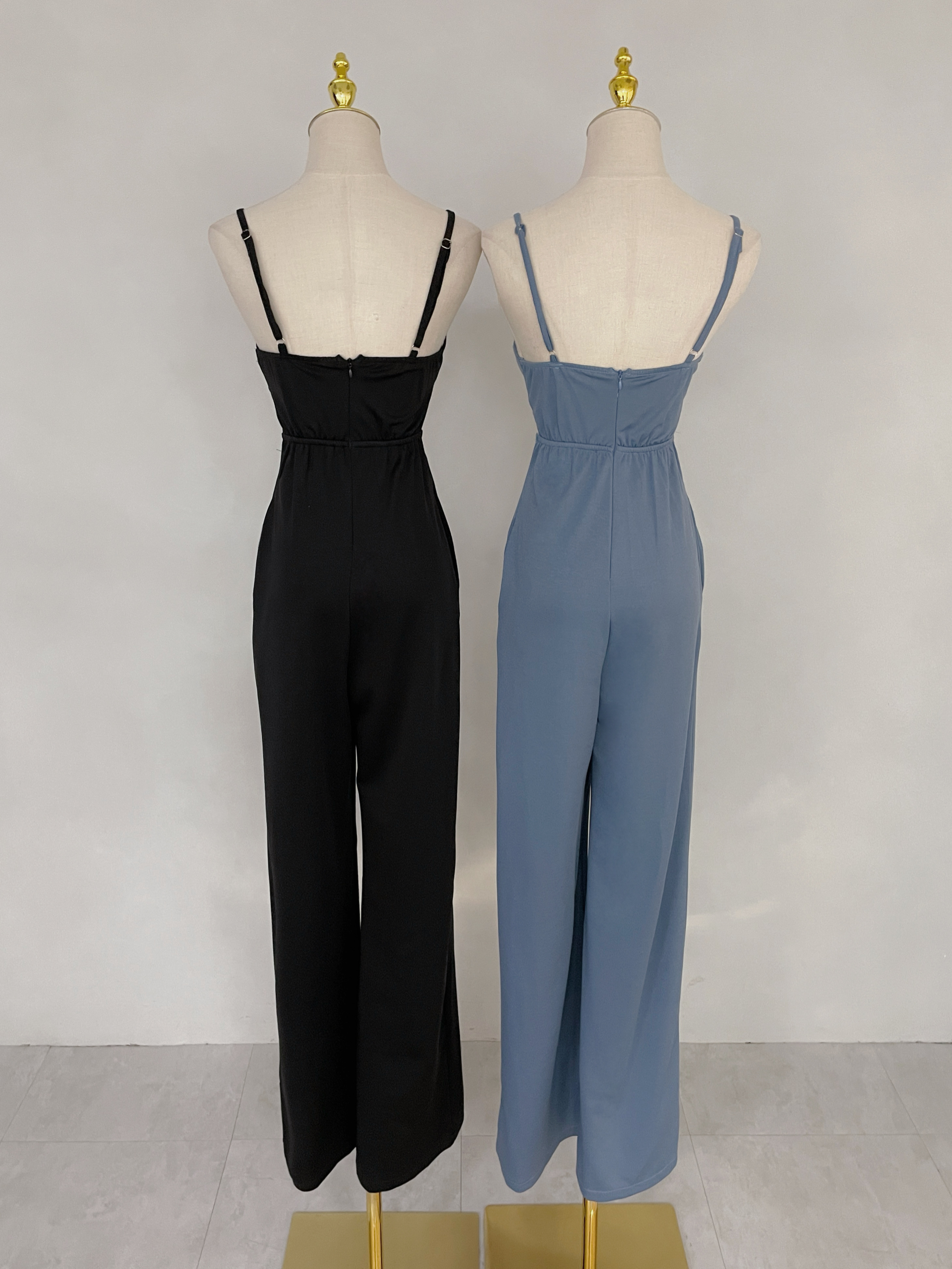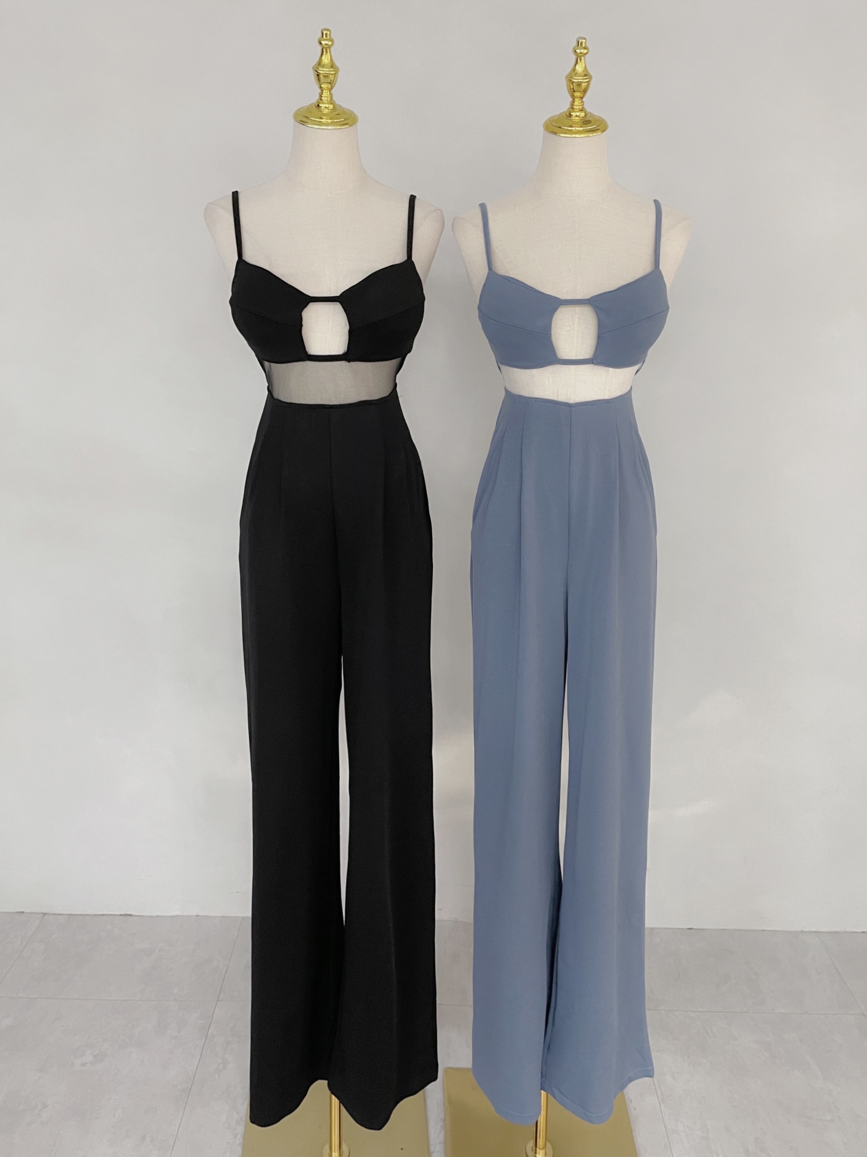 朦朧拼接腰紗細肩帶連身長褲