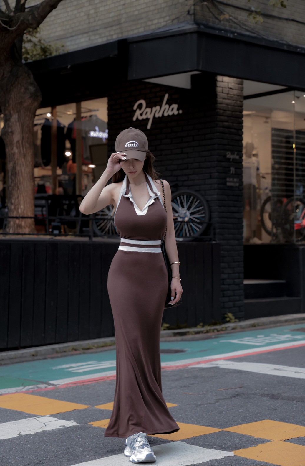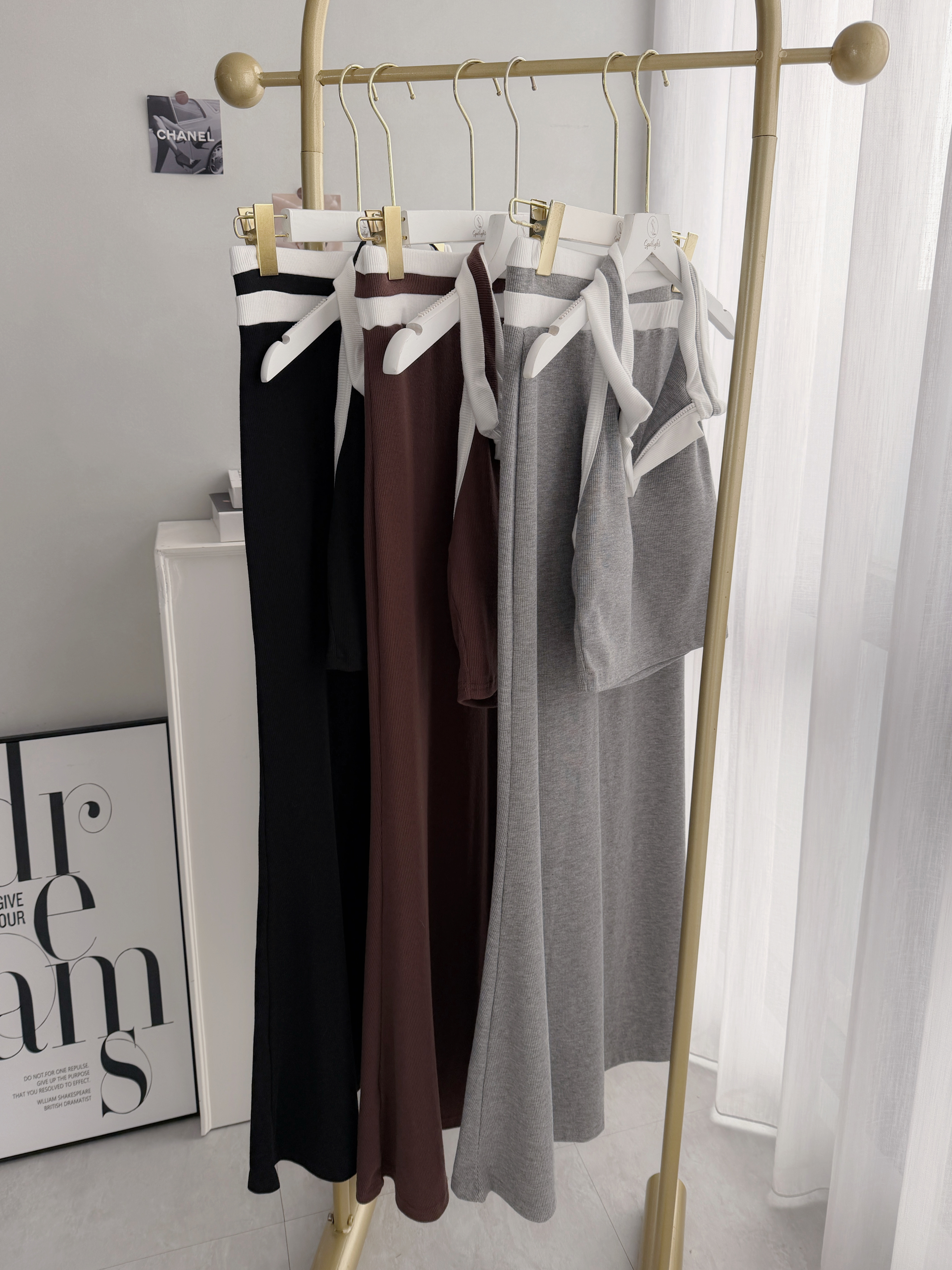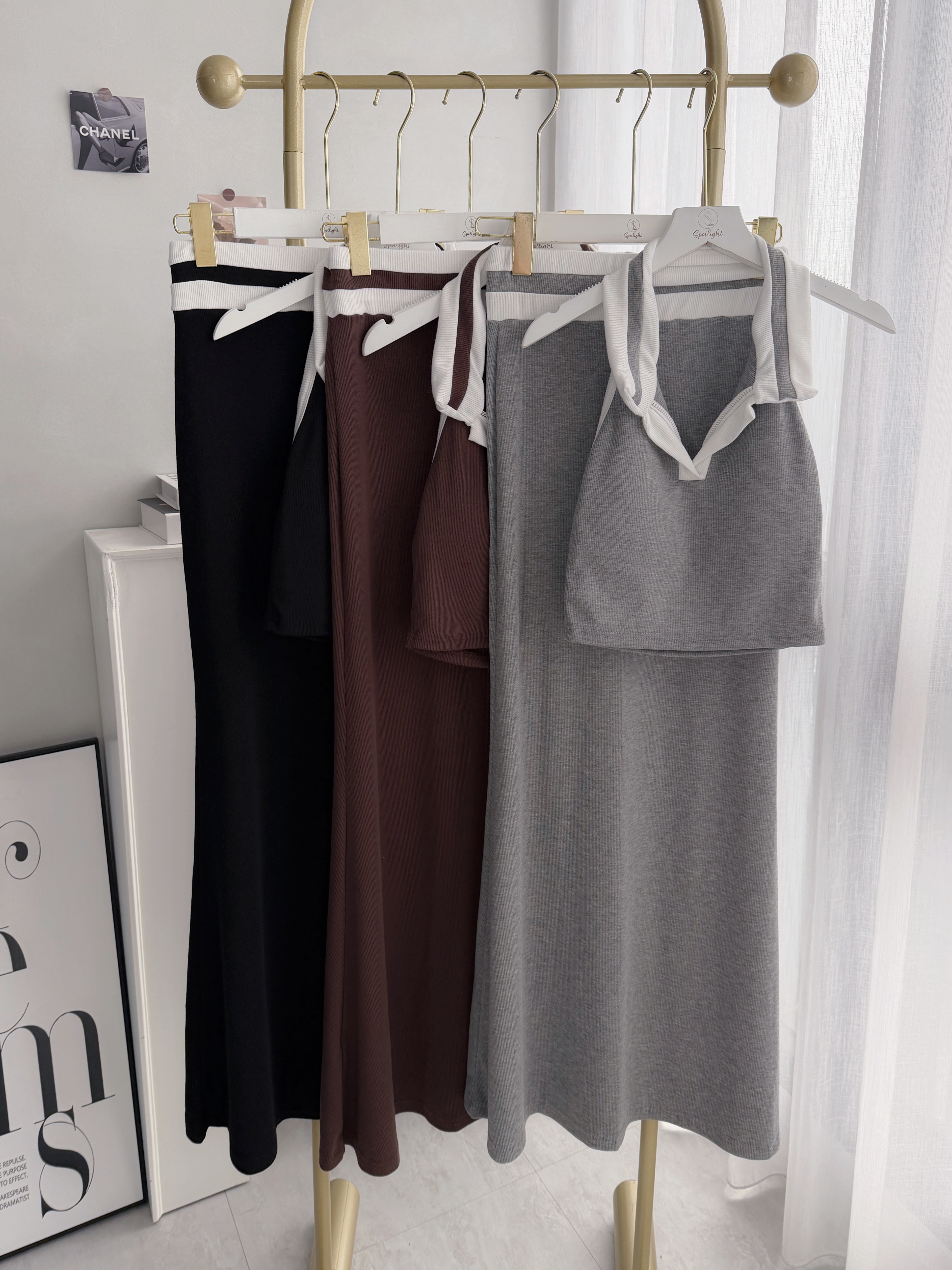 【SET】法式休閒撞色削肩V領一字美背上衣+羅紋後開衩長裙