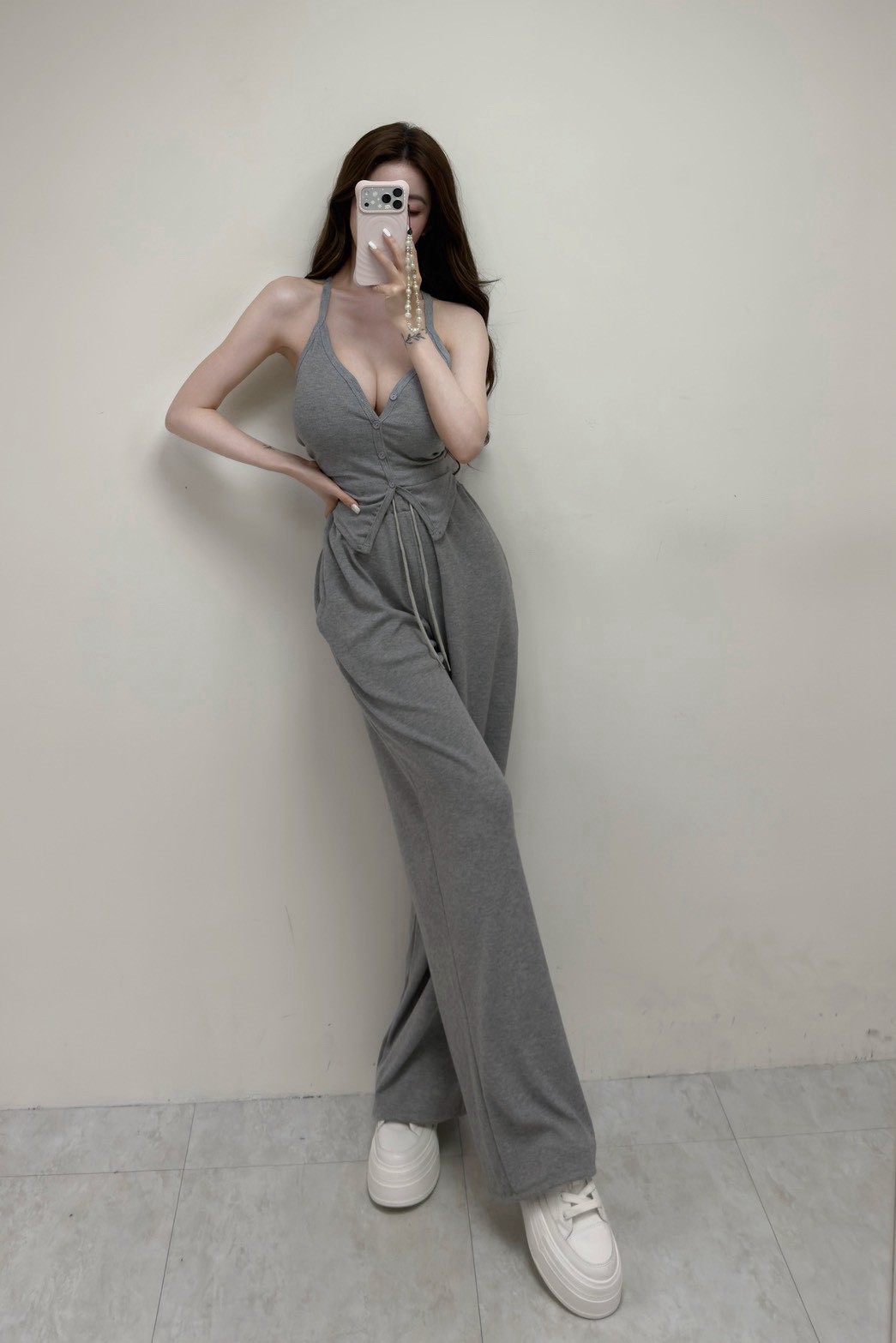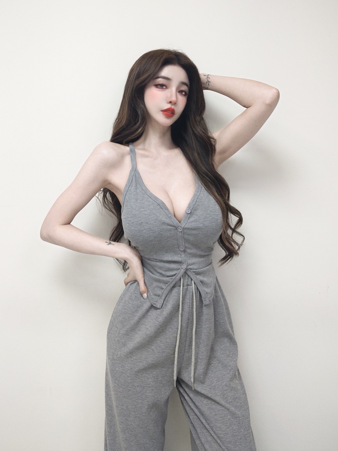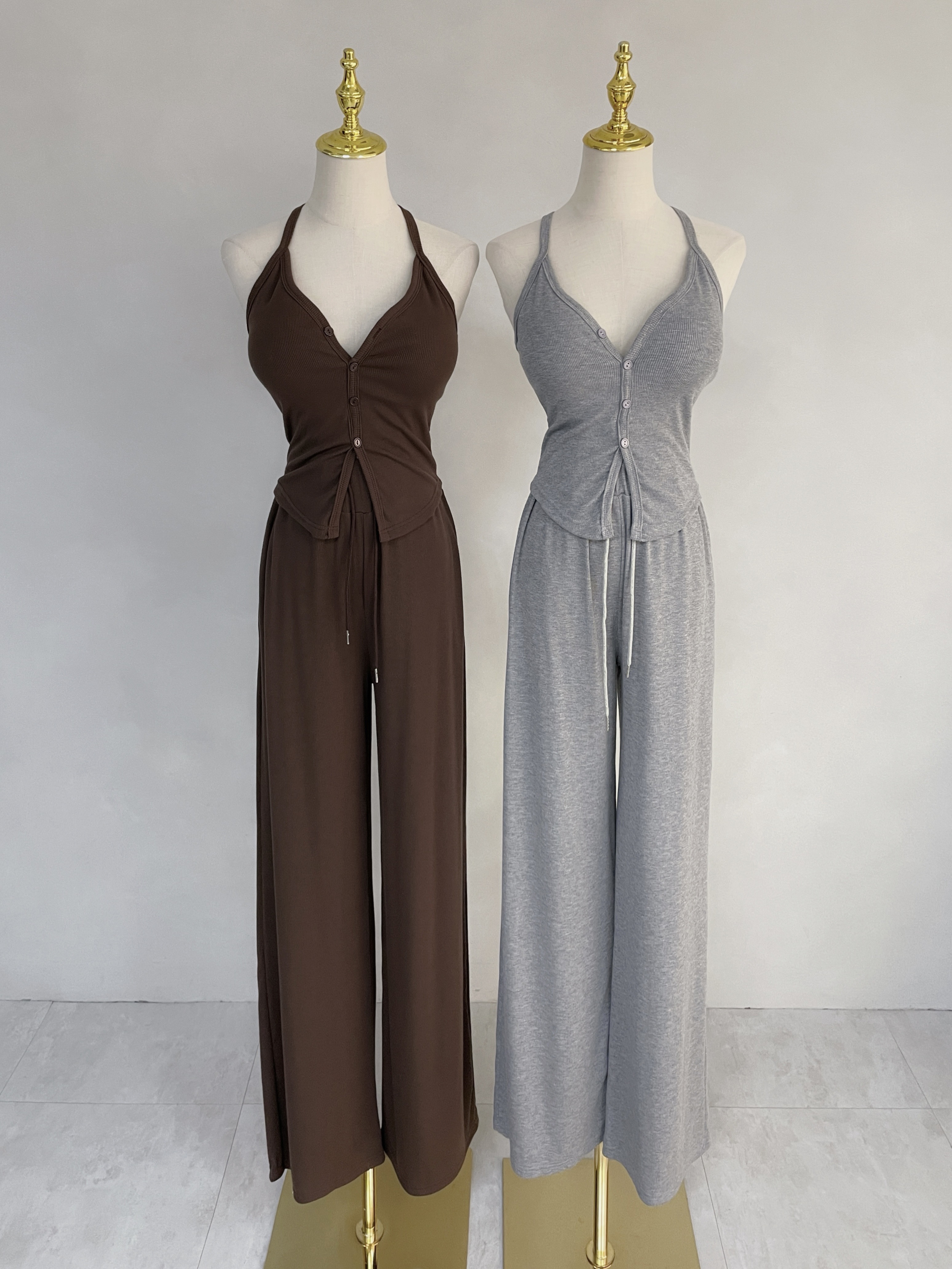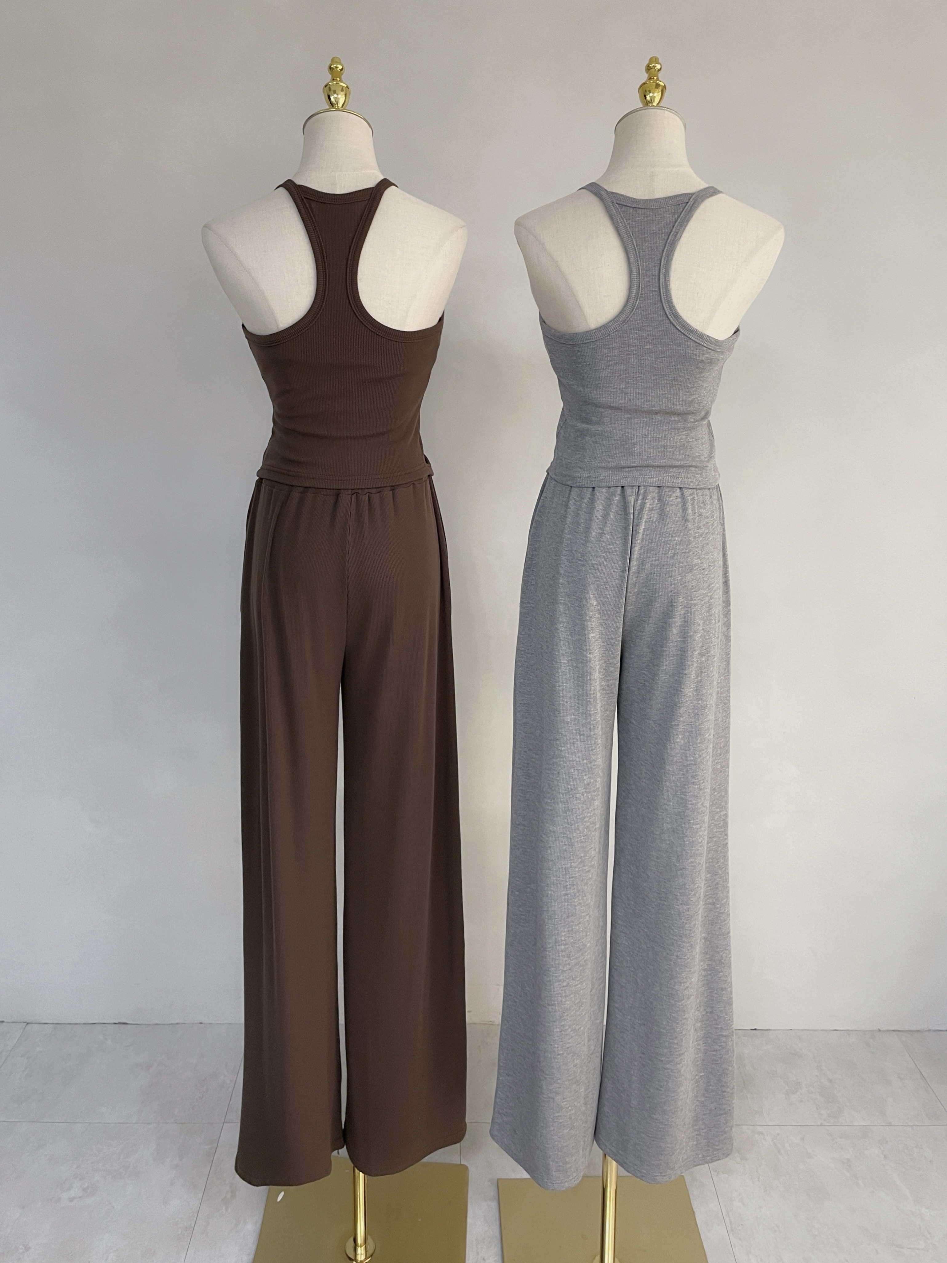 【SET】羅紋排釦挖背背心+抽繩棉褲