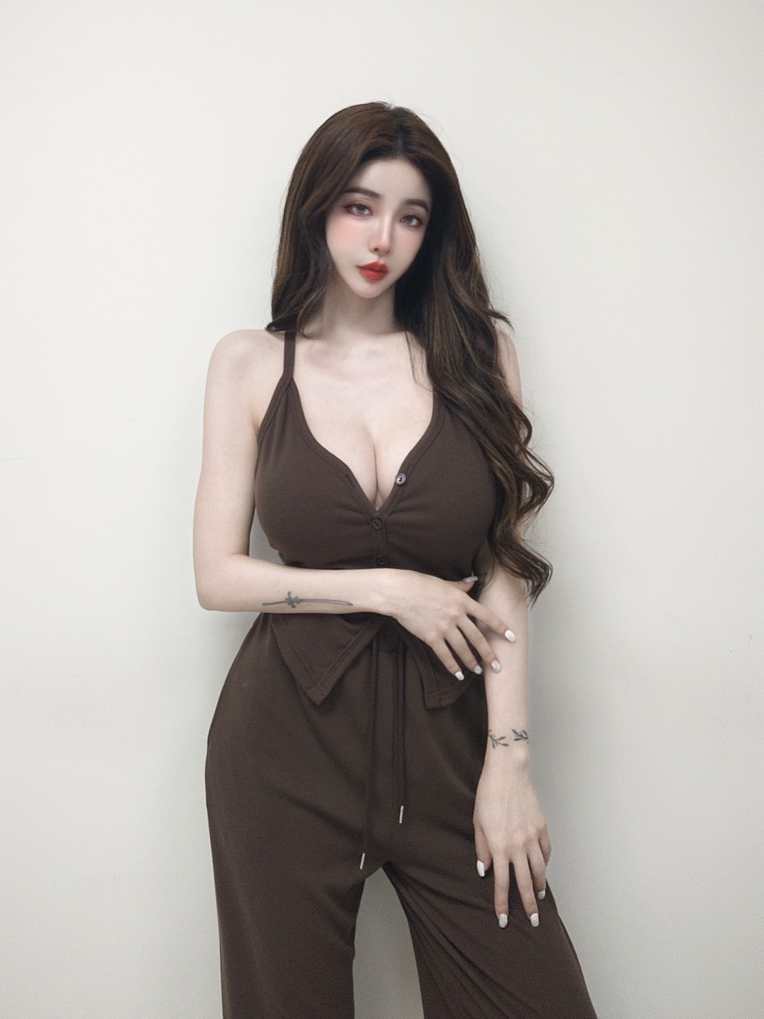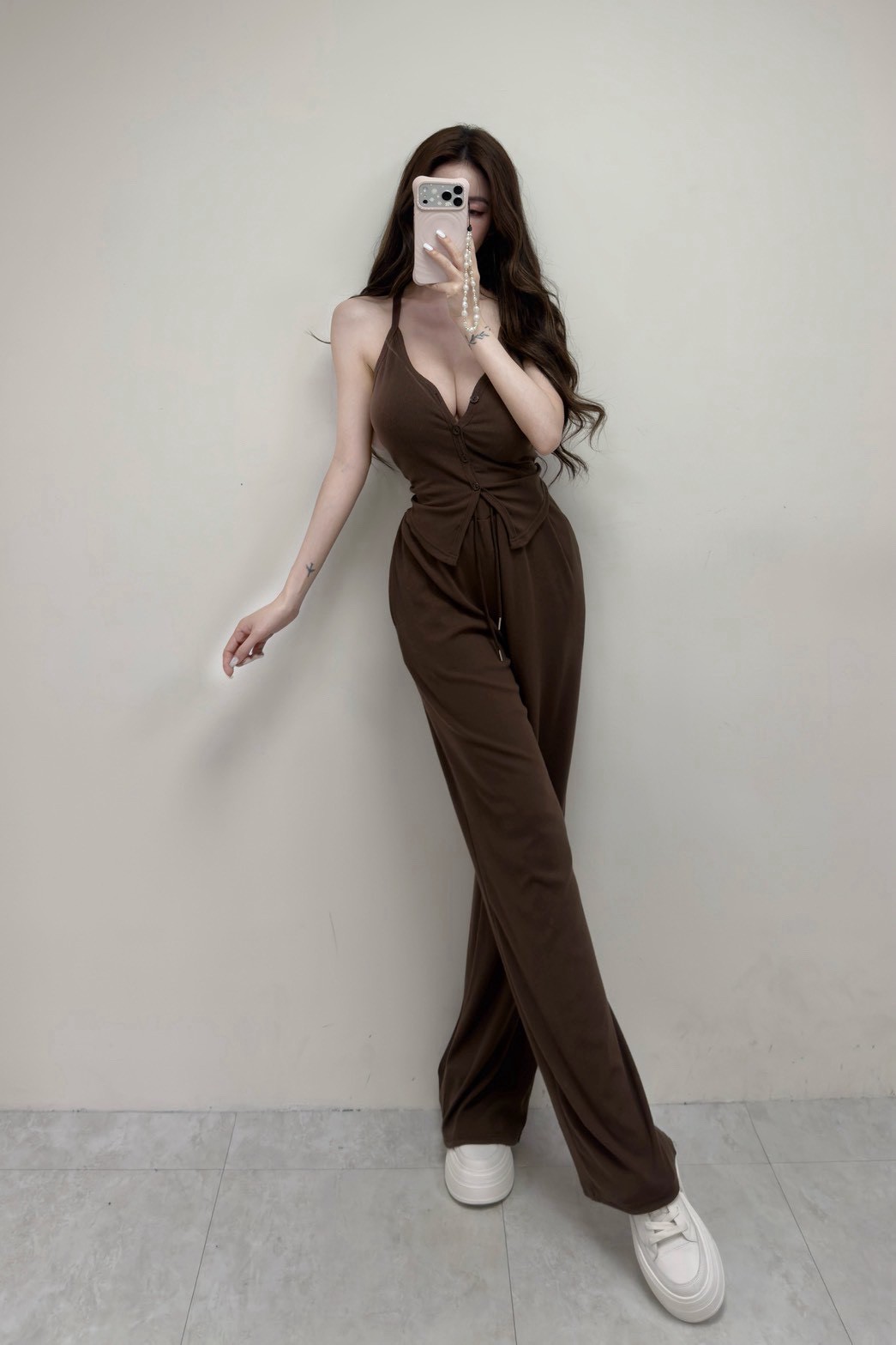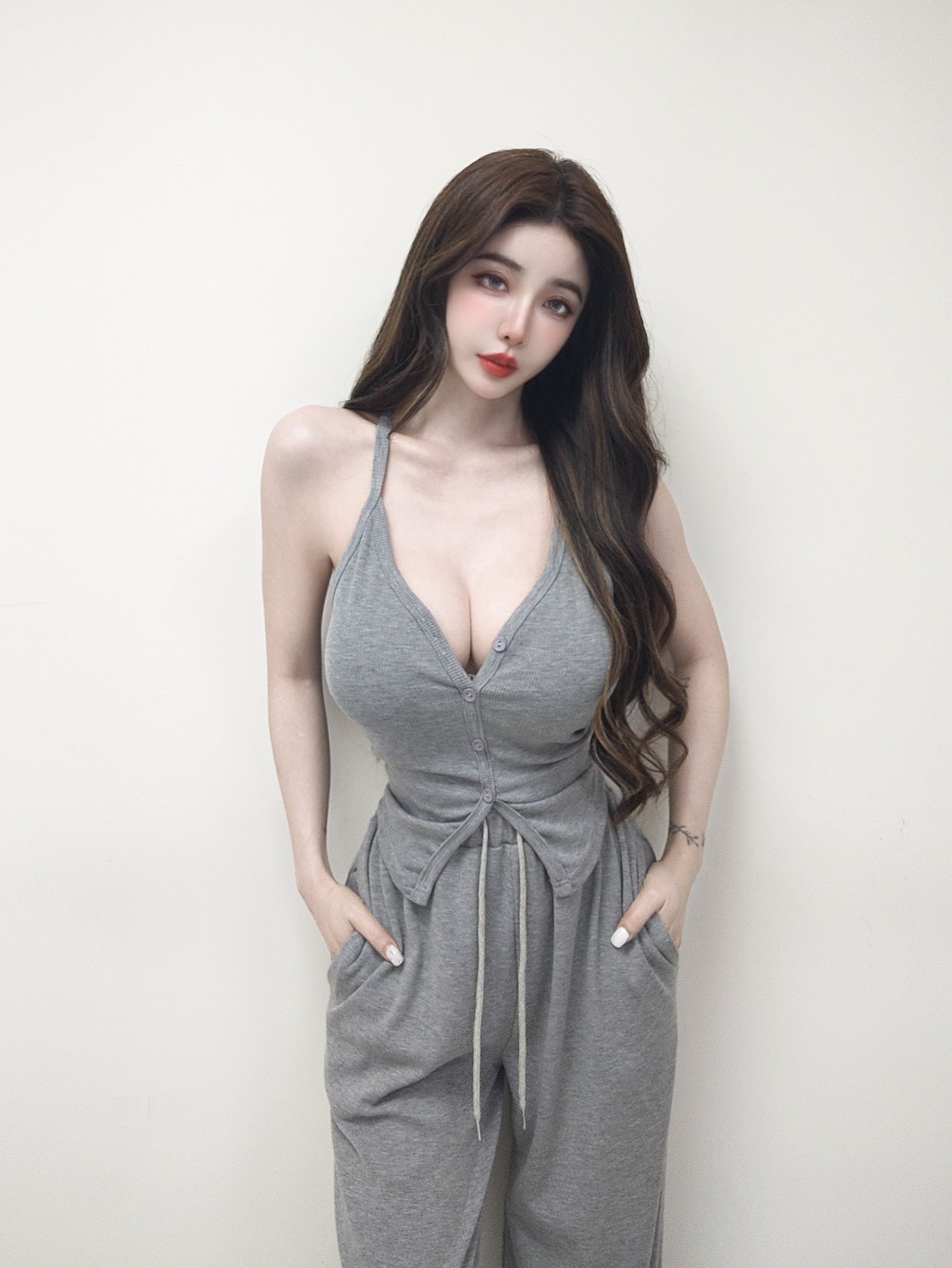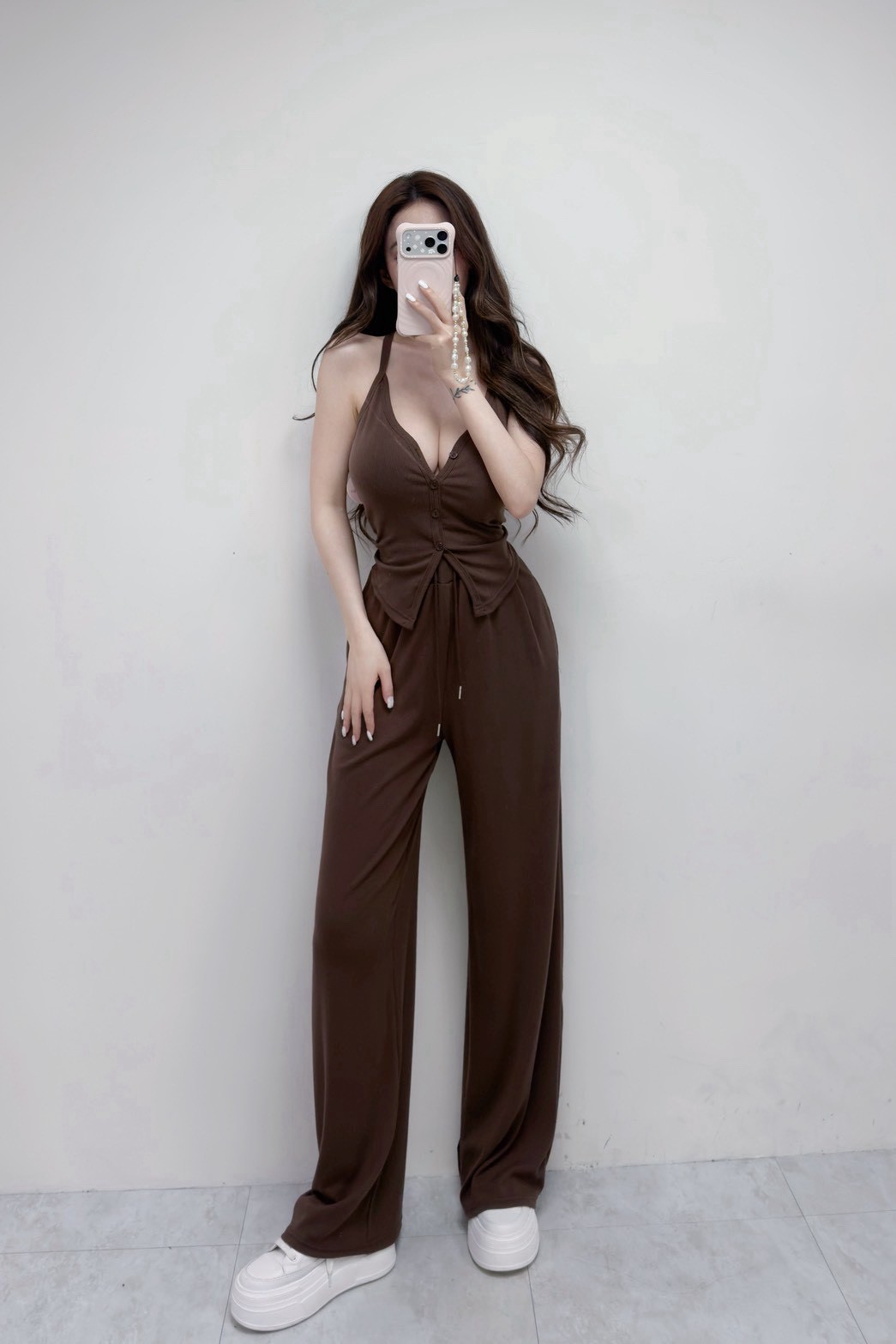 【SET】羅紋排釦挖背背心+抽繩棉褲