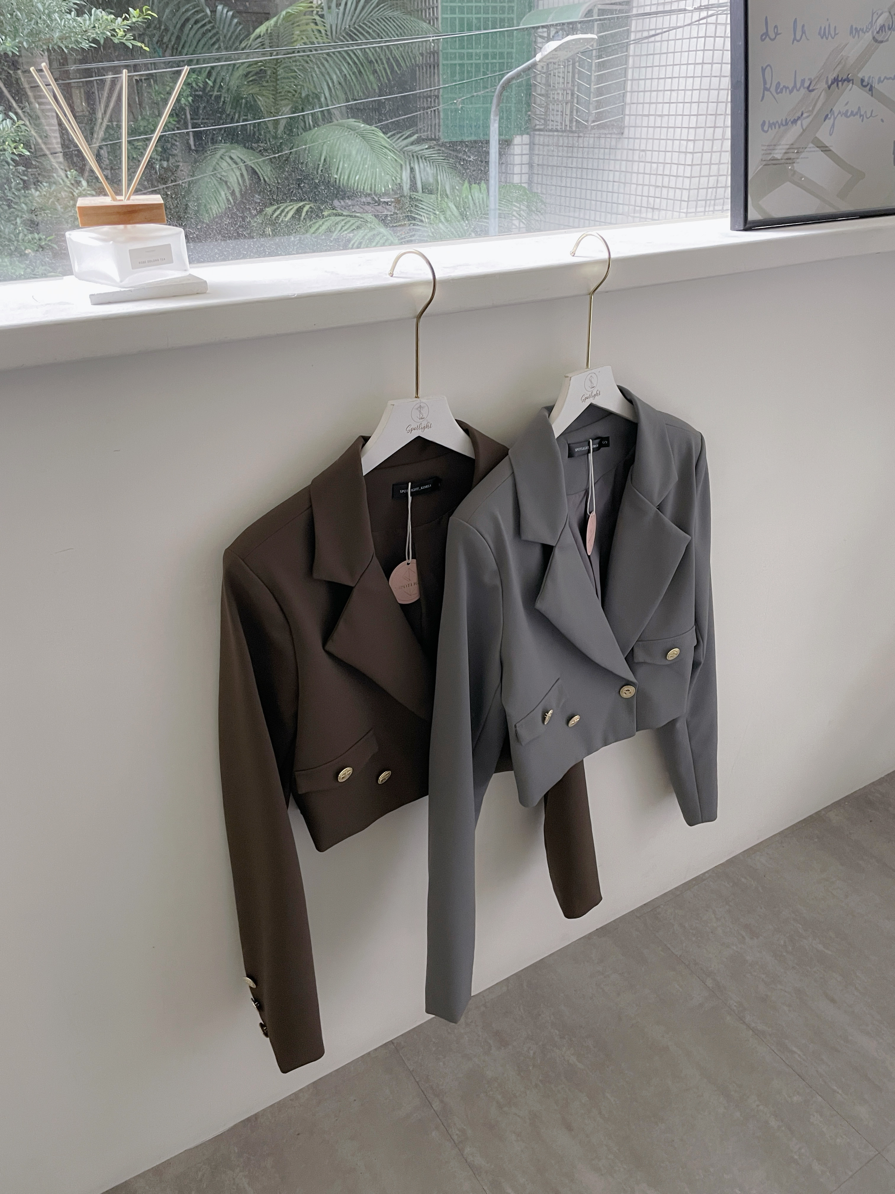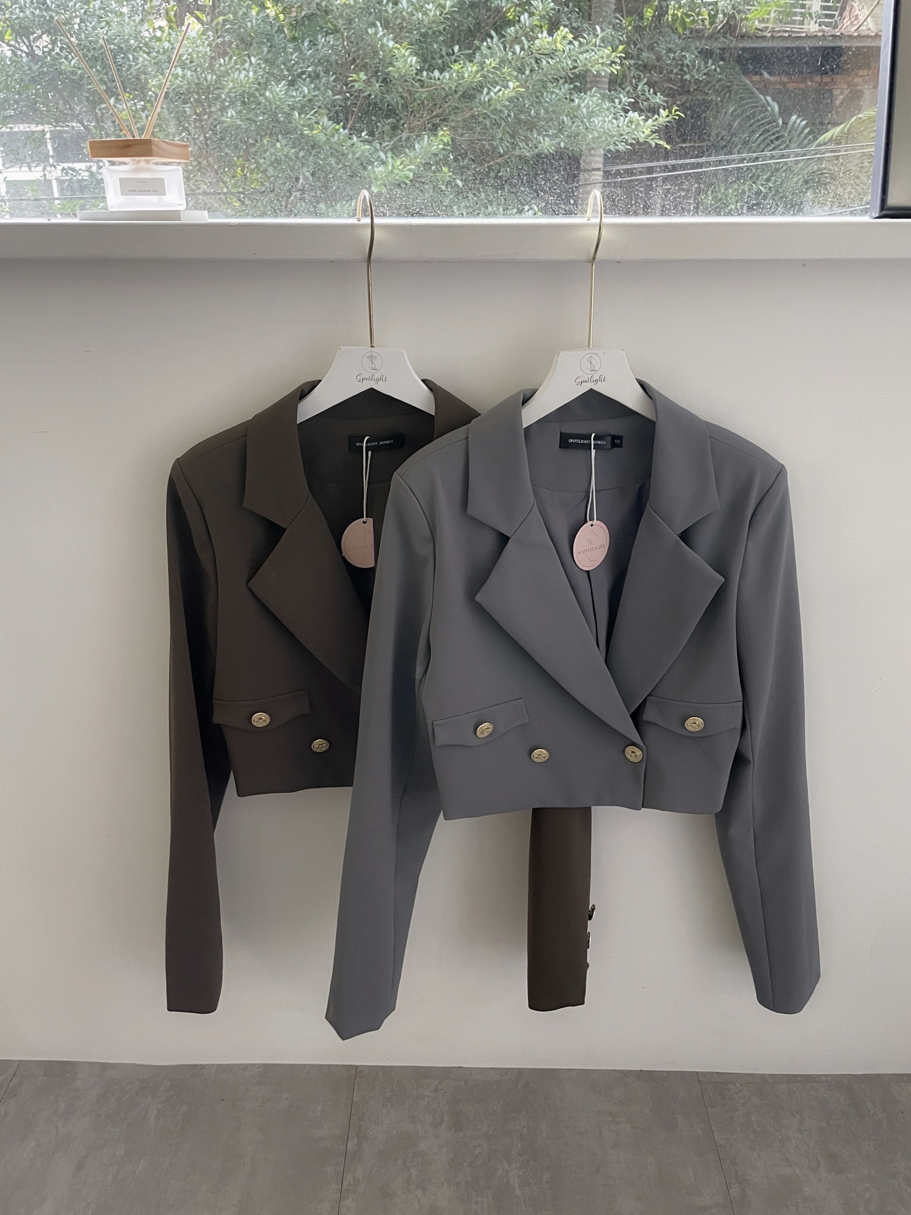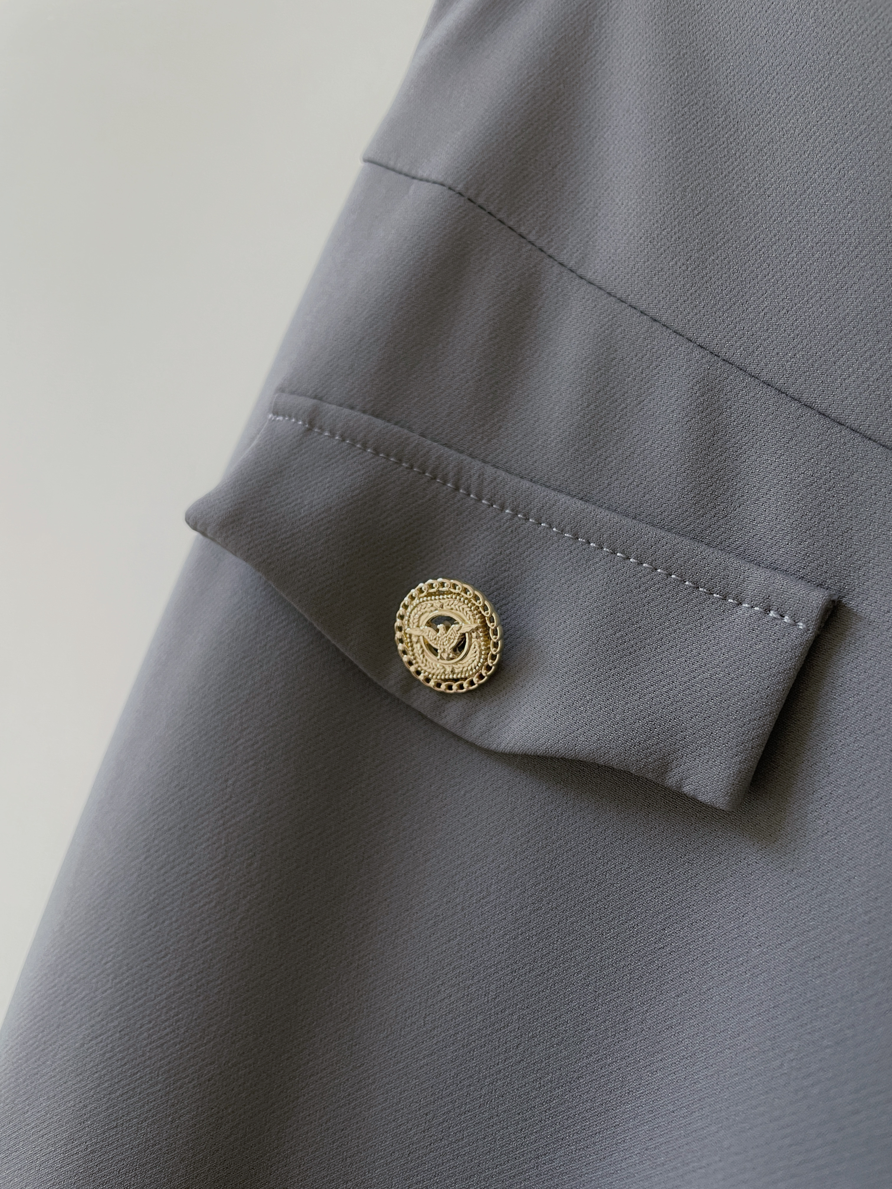 經典西裝翻領搭配精緻裝飾金釦,整體更顯高級質感。