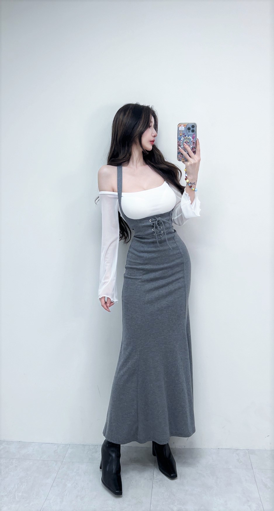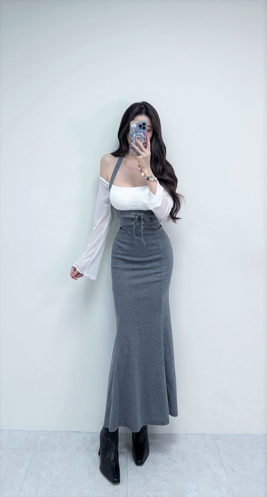 【SET】質感語錄 透紗袖上衣+穿繩綁帶長裙
