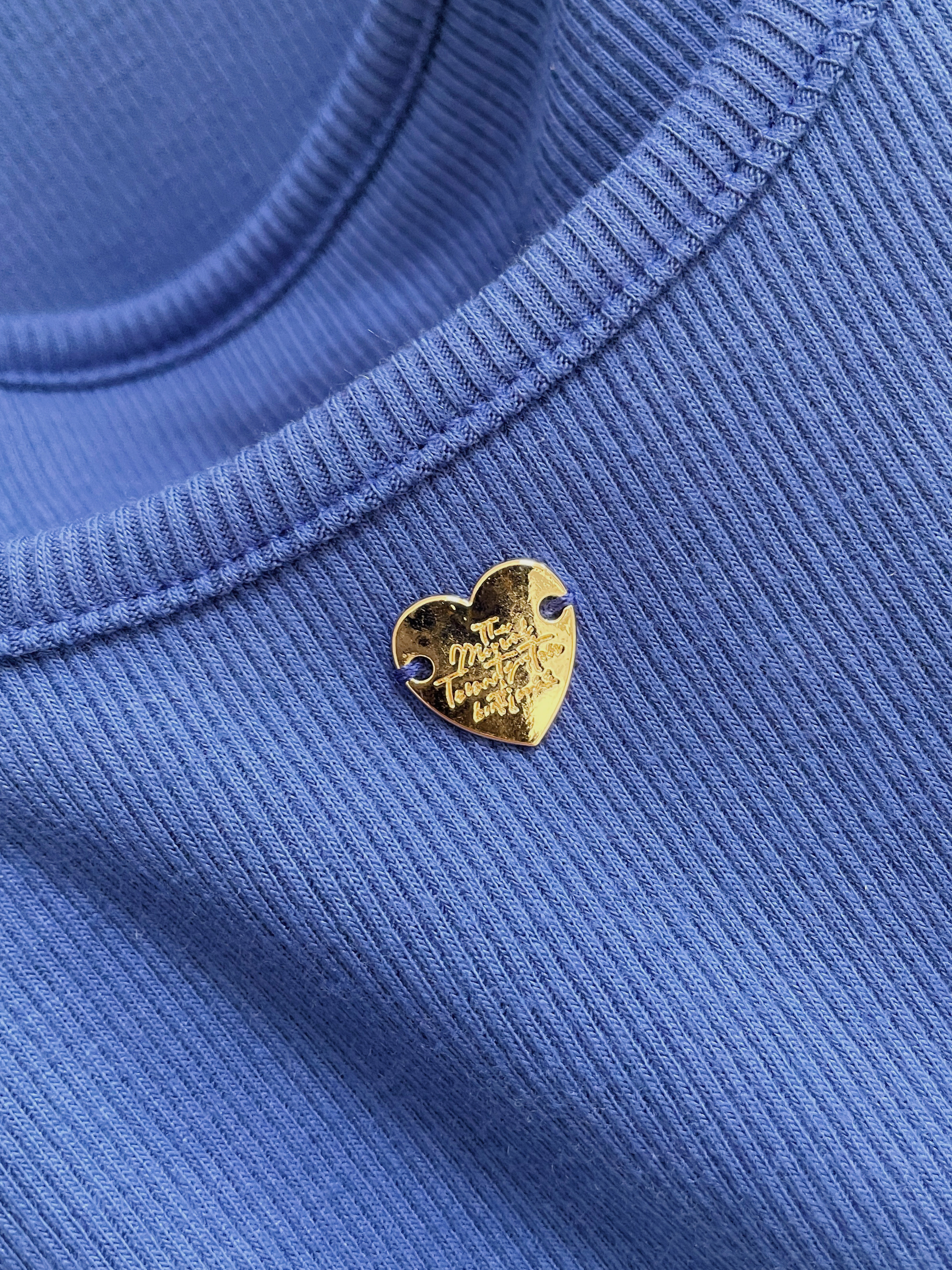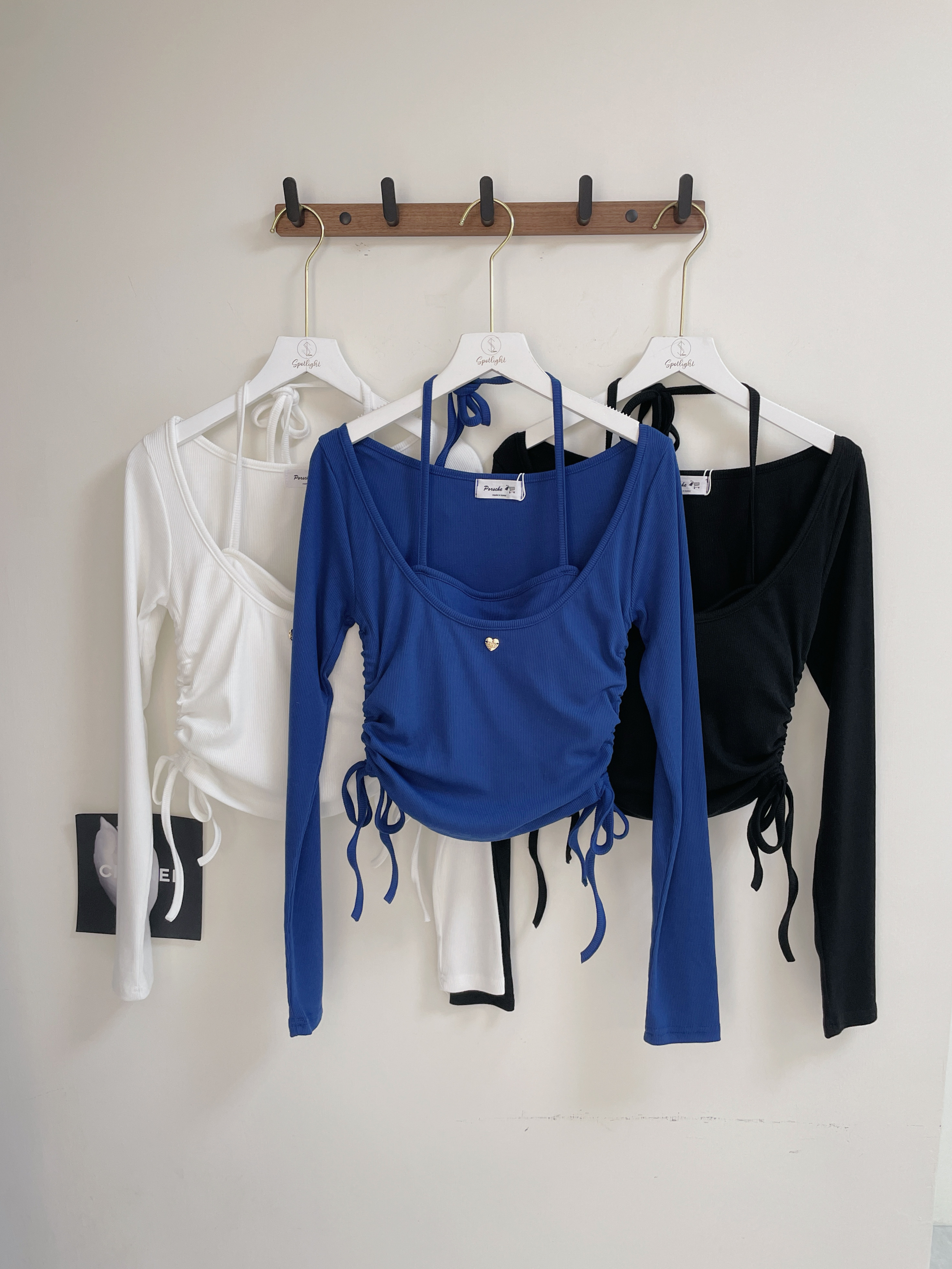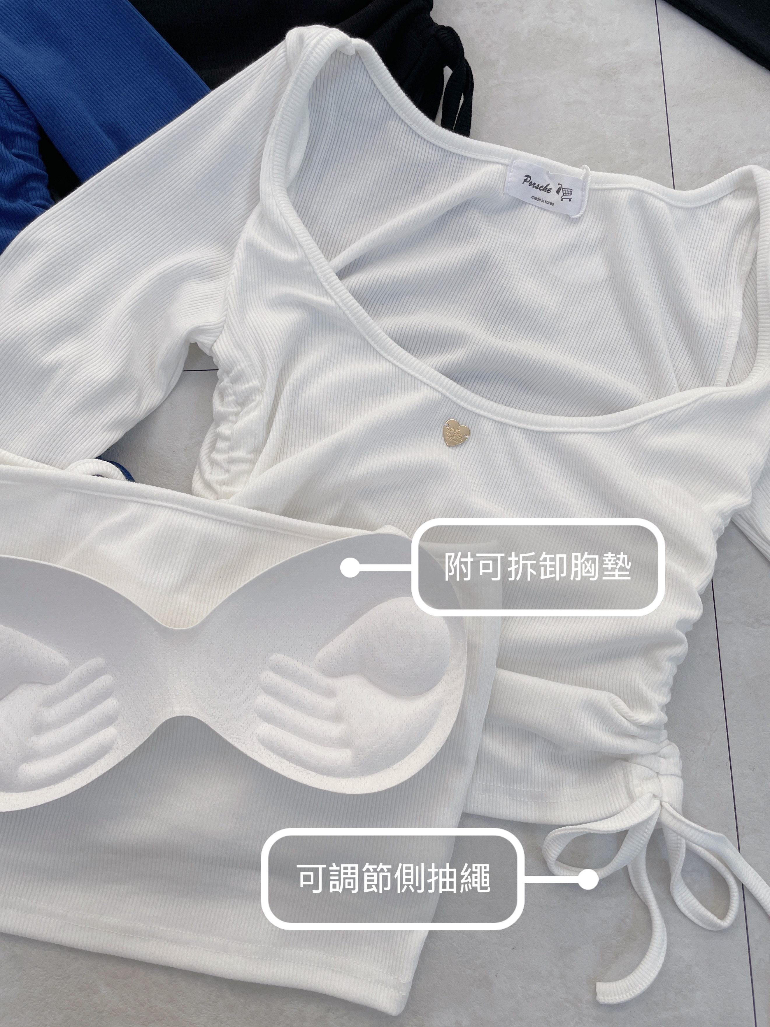 上衣: U領剪裁搭配金標愛心點綴,側抽繩設計可依喜好調整皺摺與長度,甜美中帶有俏皮氛圍。