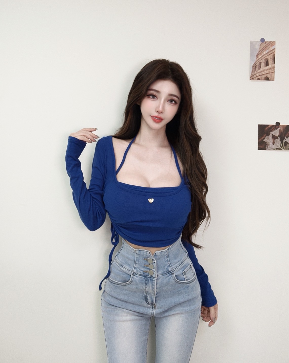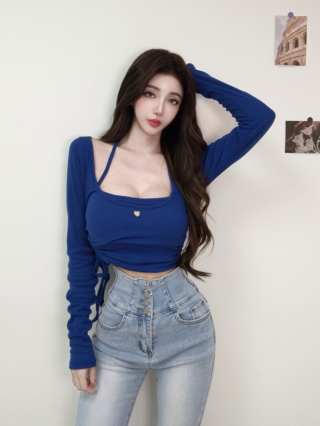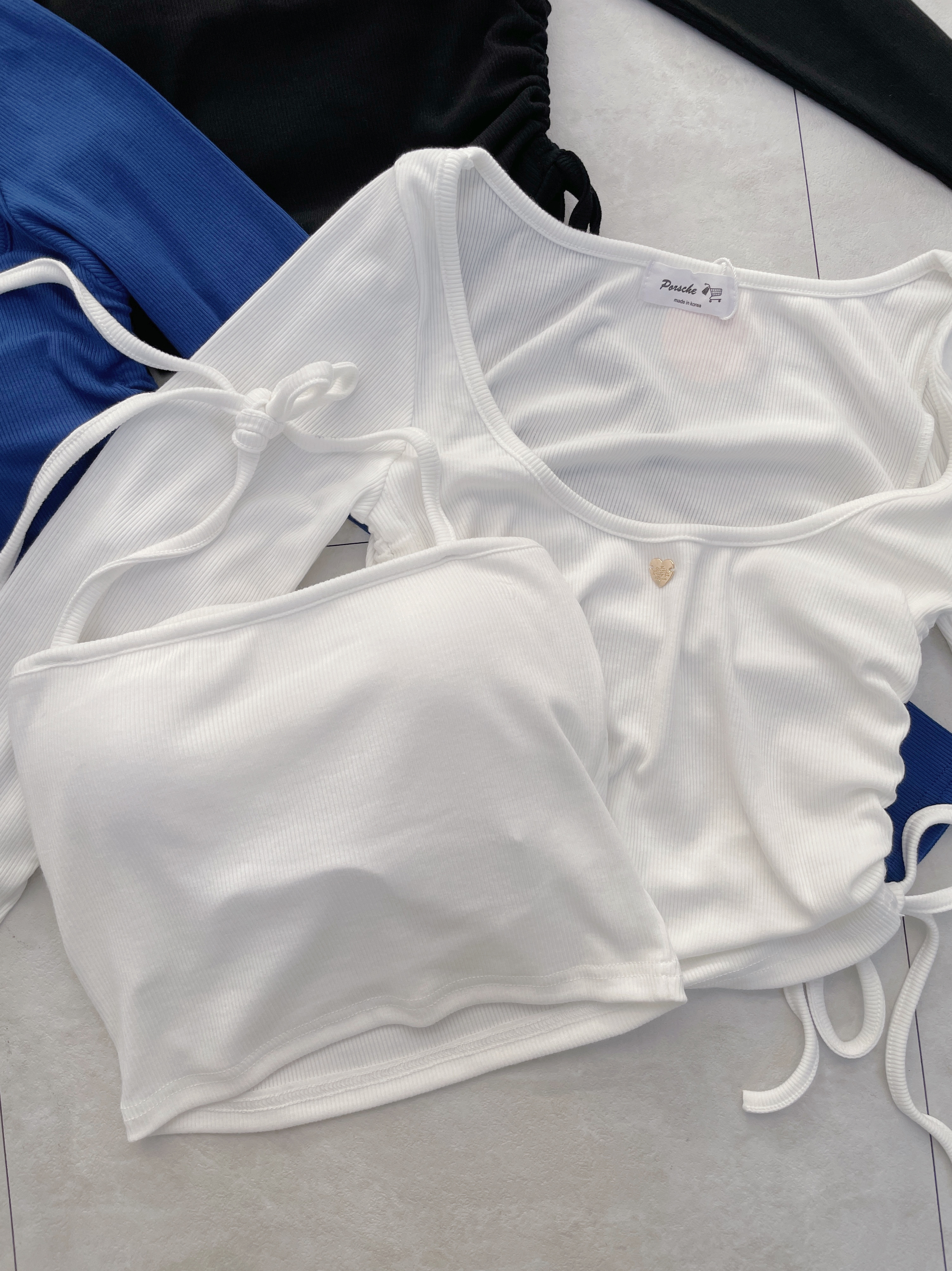 【SET】韓國平口繞脖背心+愛心羅紋抽繩上衣