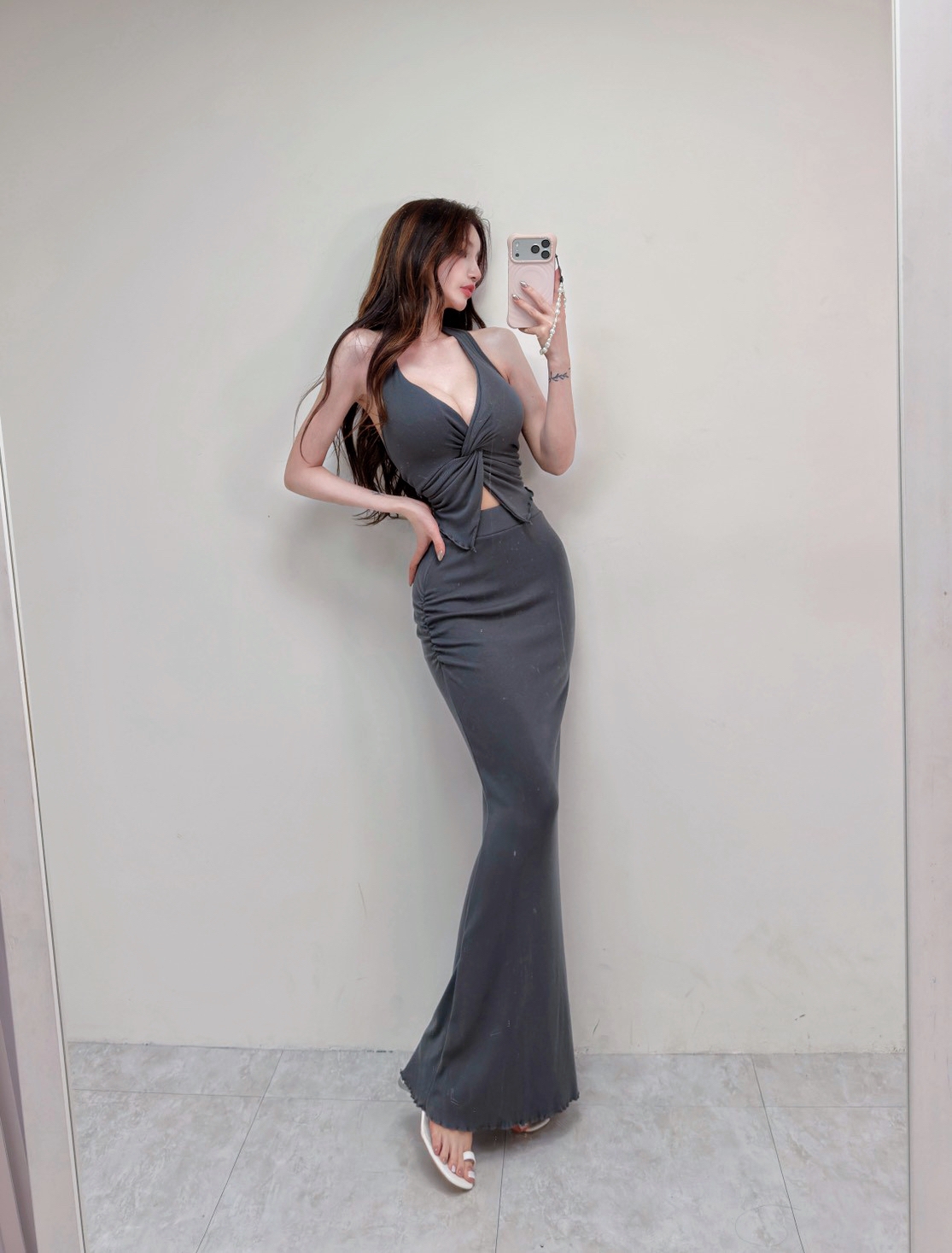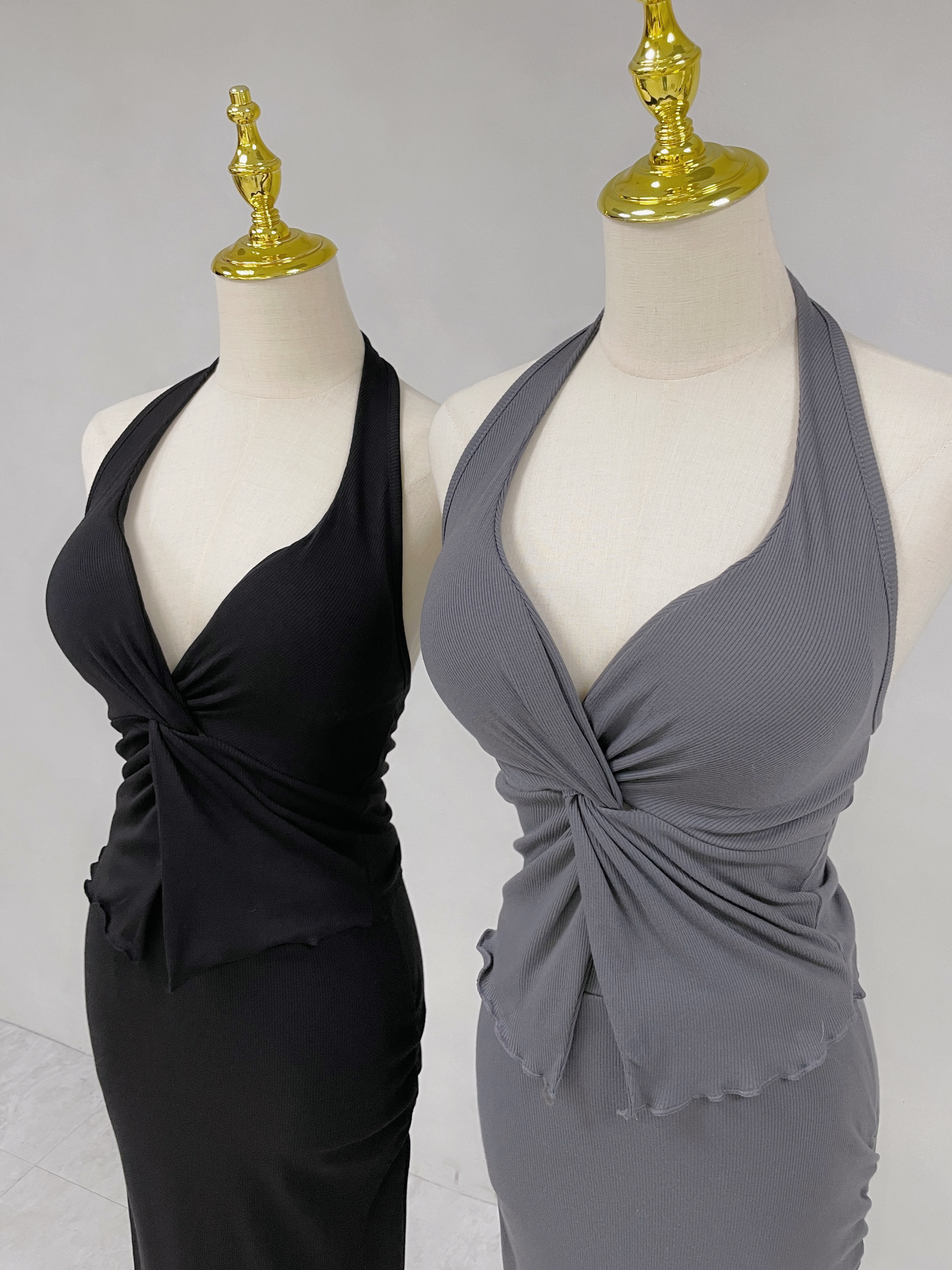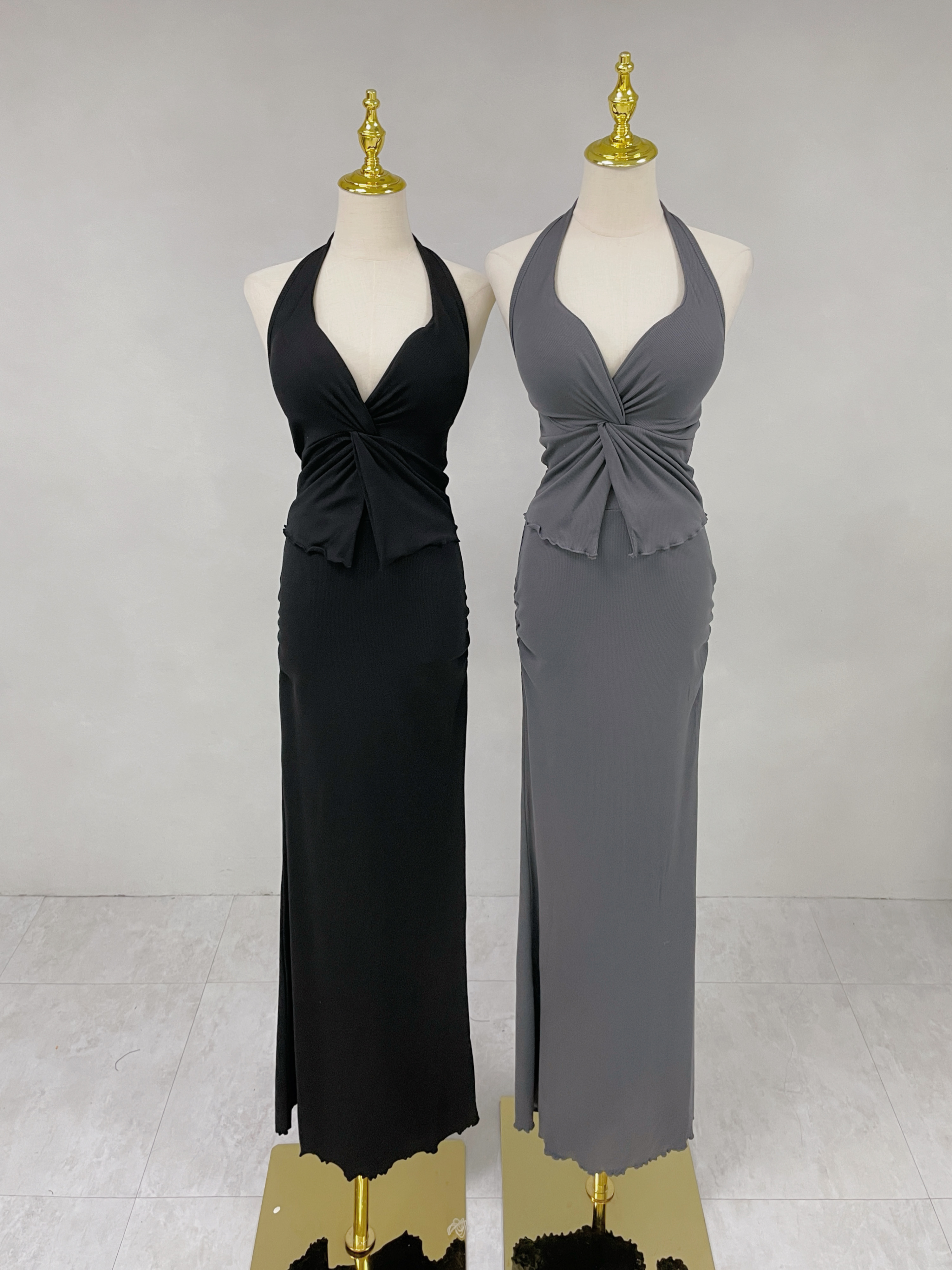 【SET】韓國木耳邊繞脖羅紋紐結上衣+側抓皺長裙