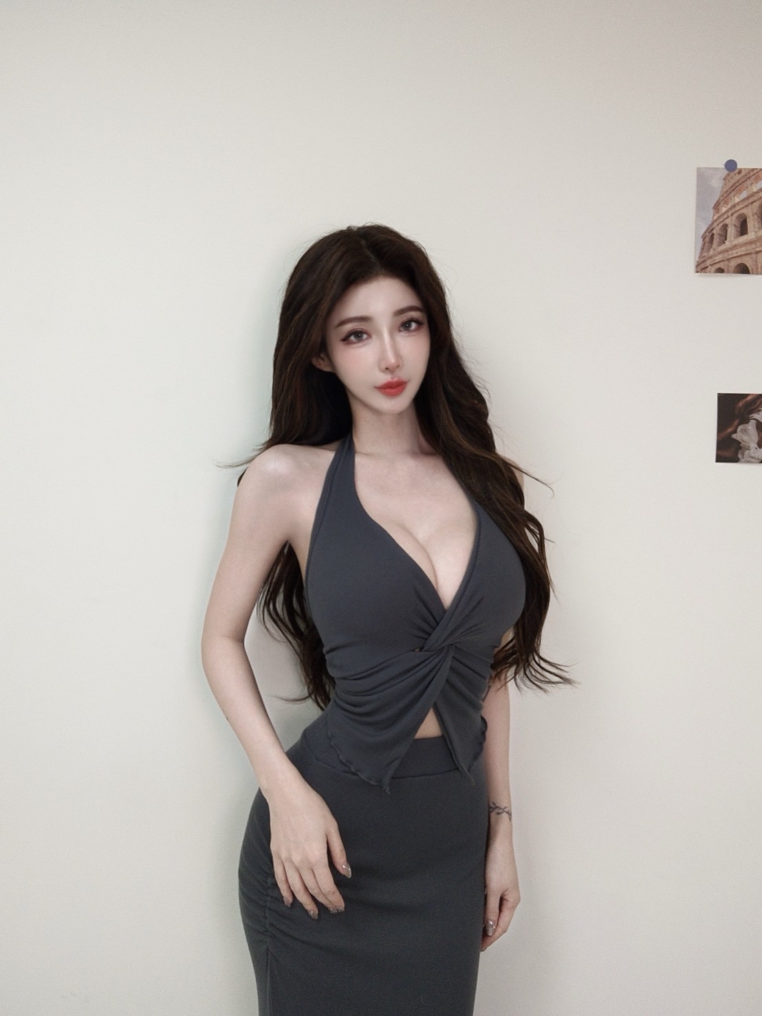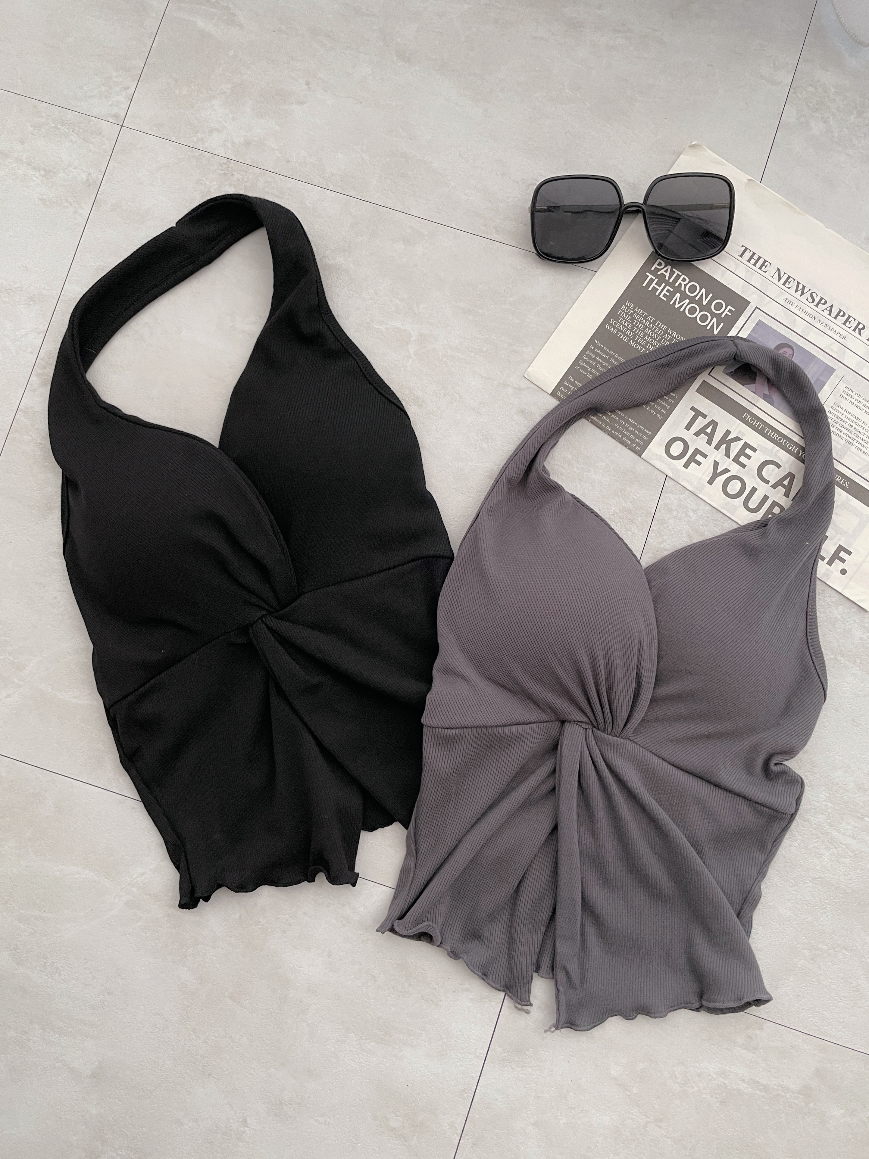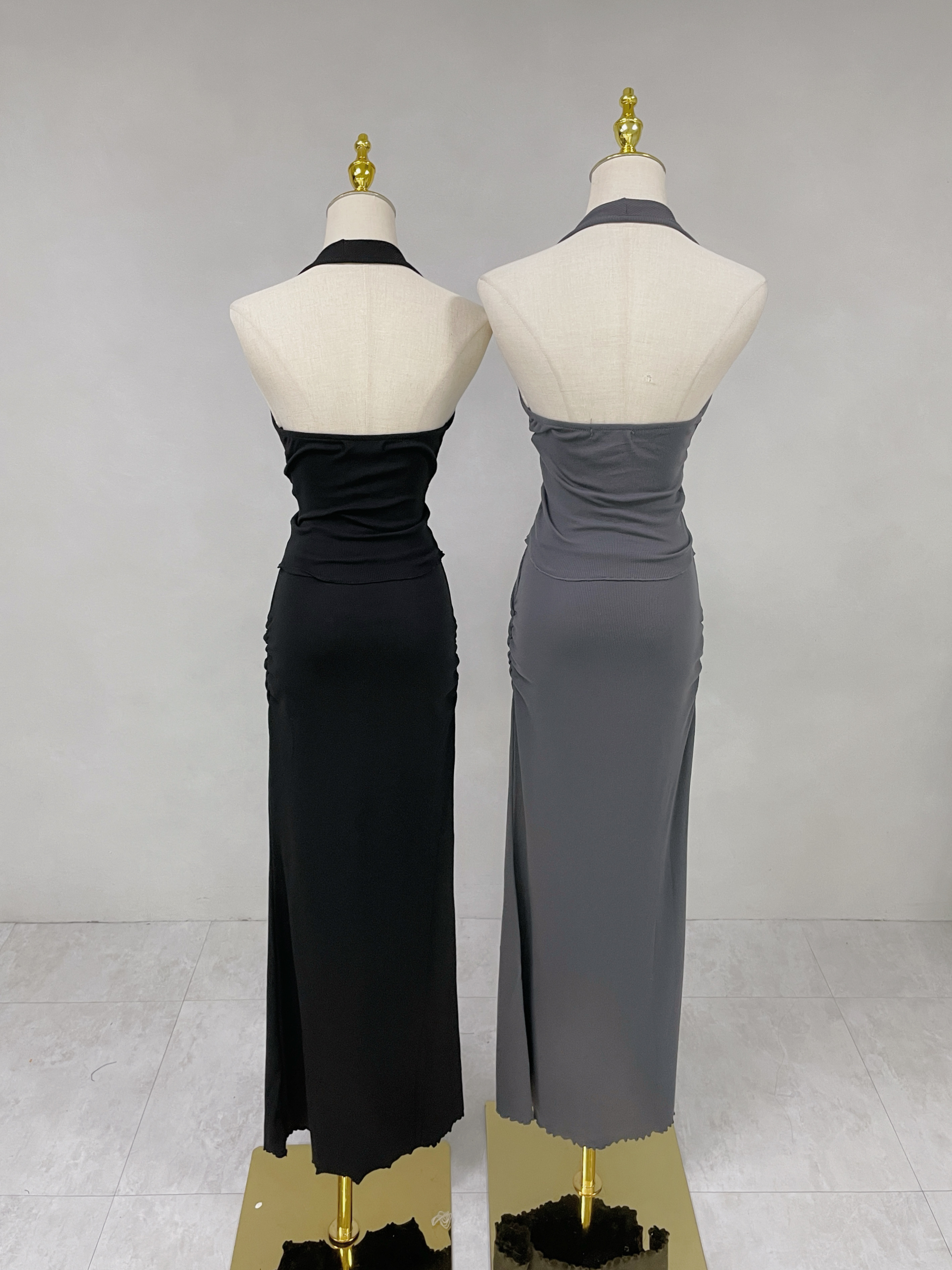【SET】韓國木耳邊繞脖羅紋紐結上衣+側抓皺長裙
