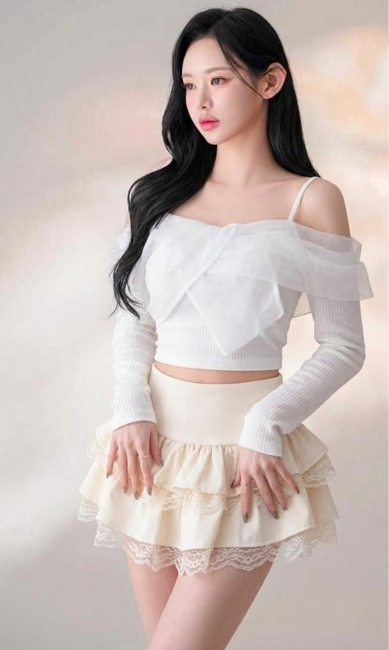 擋不住的浪漫 韓國一字雪紡挖肩羅紋長袖上衣