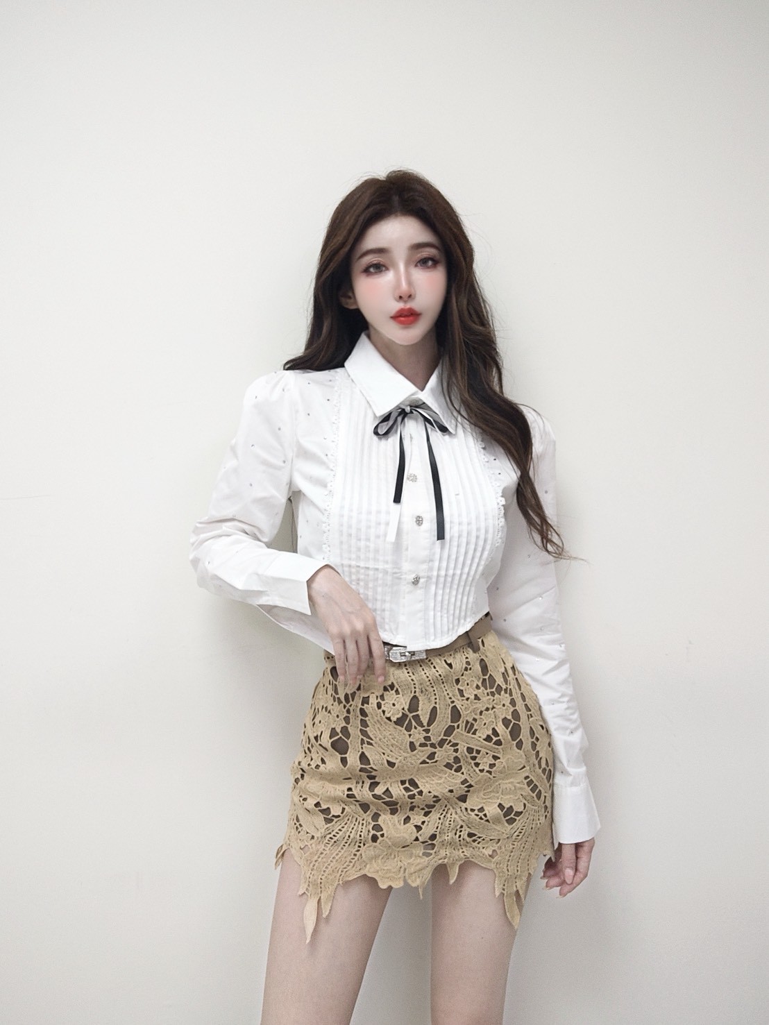 滿鑽幸運草雙色綁帶襯衫