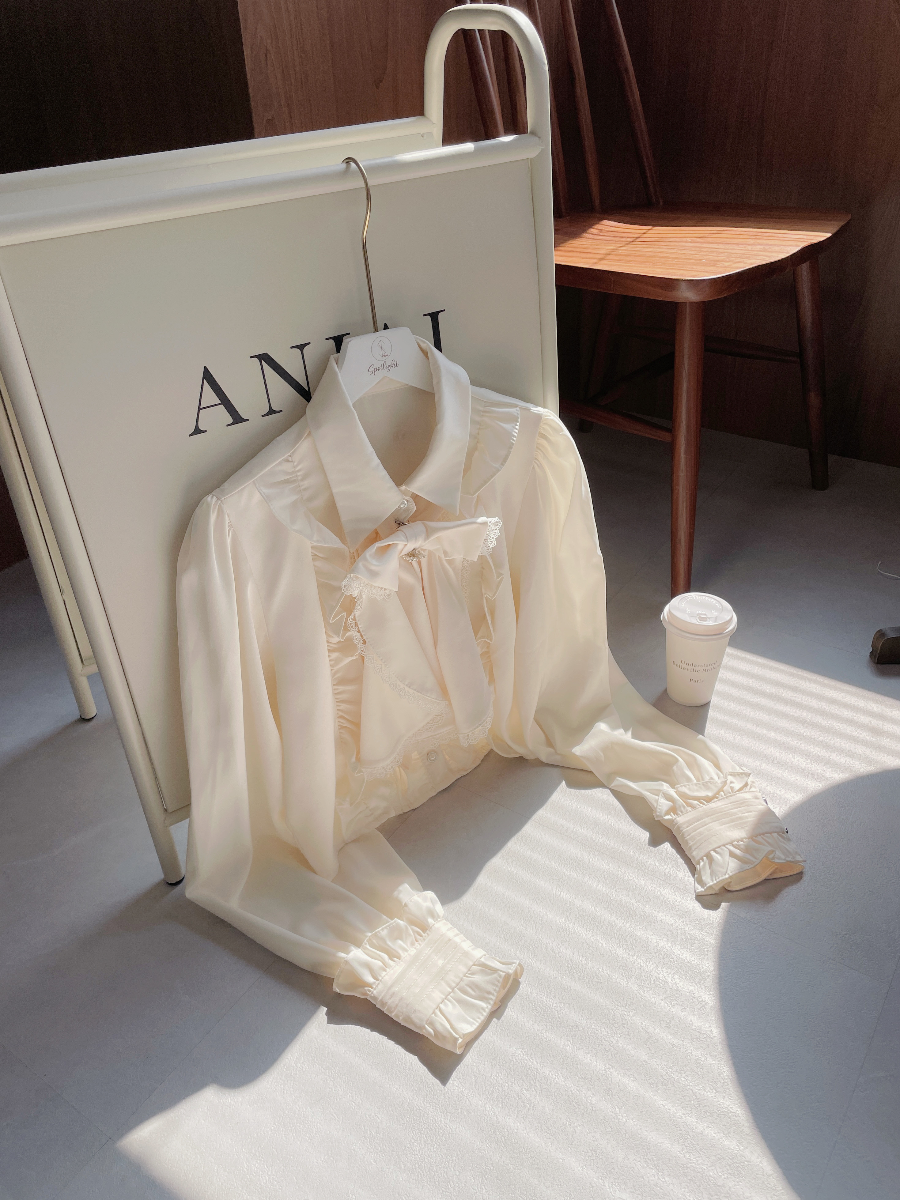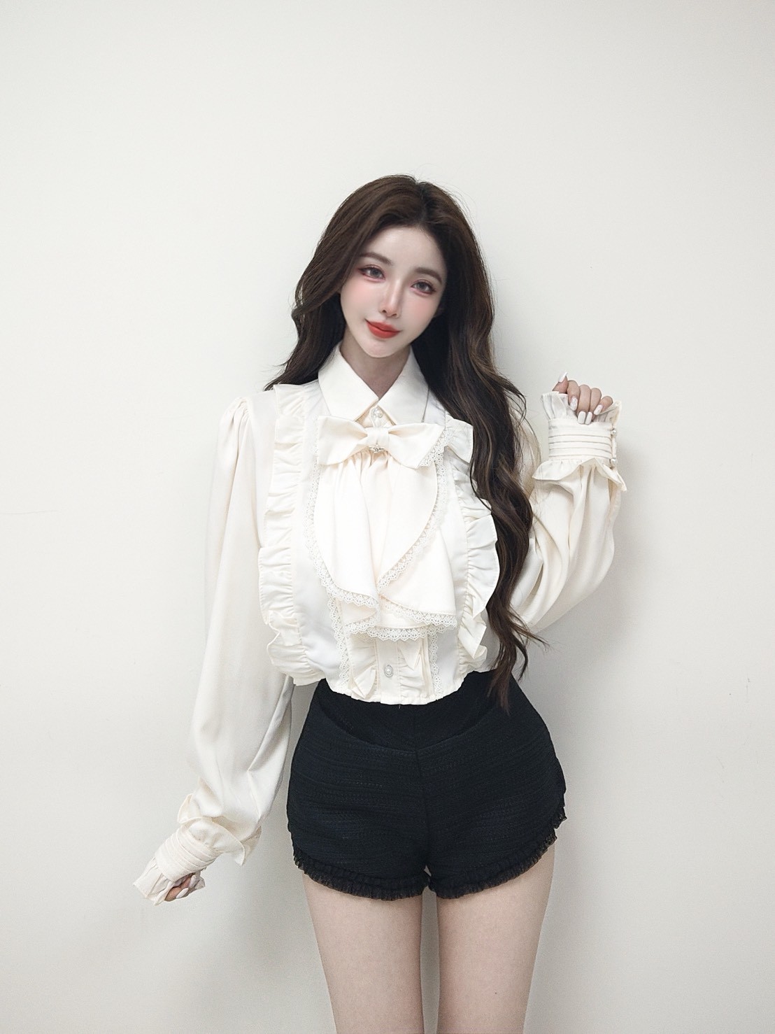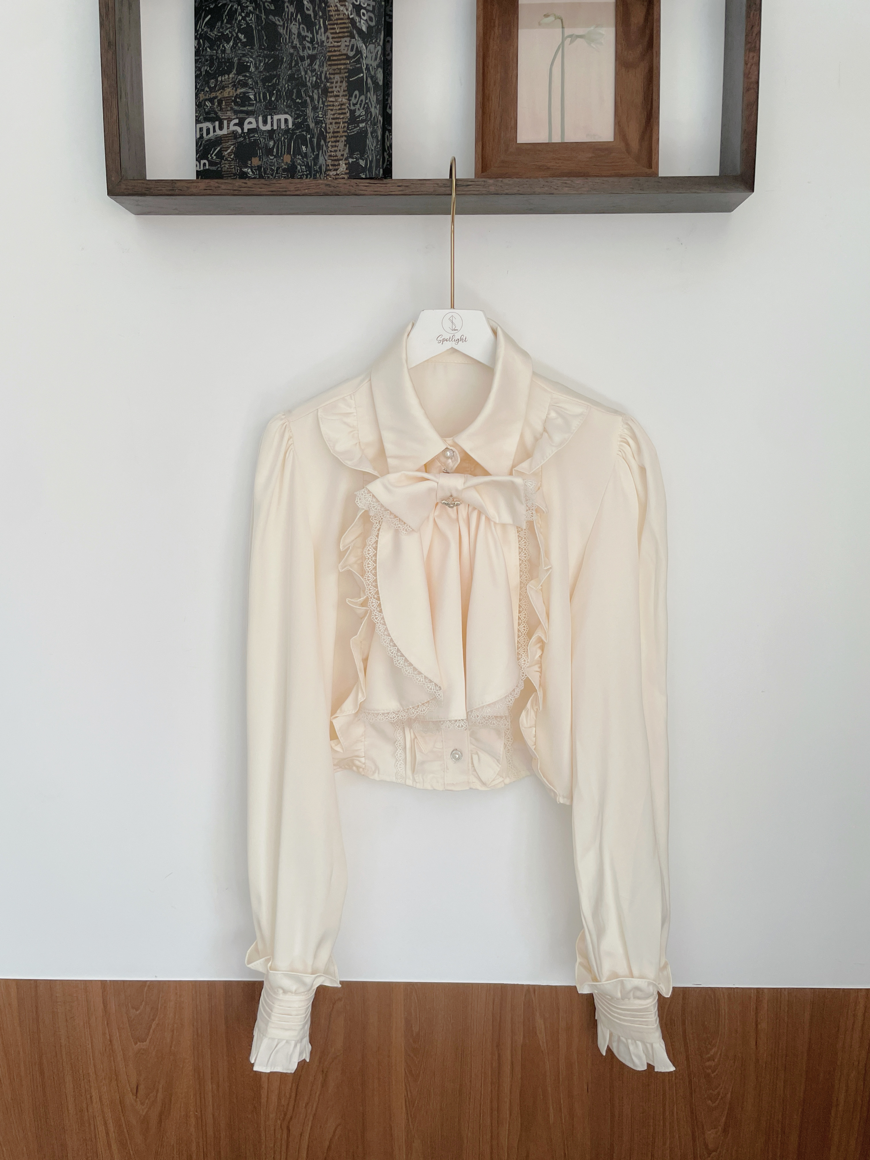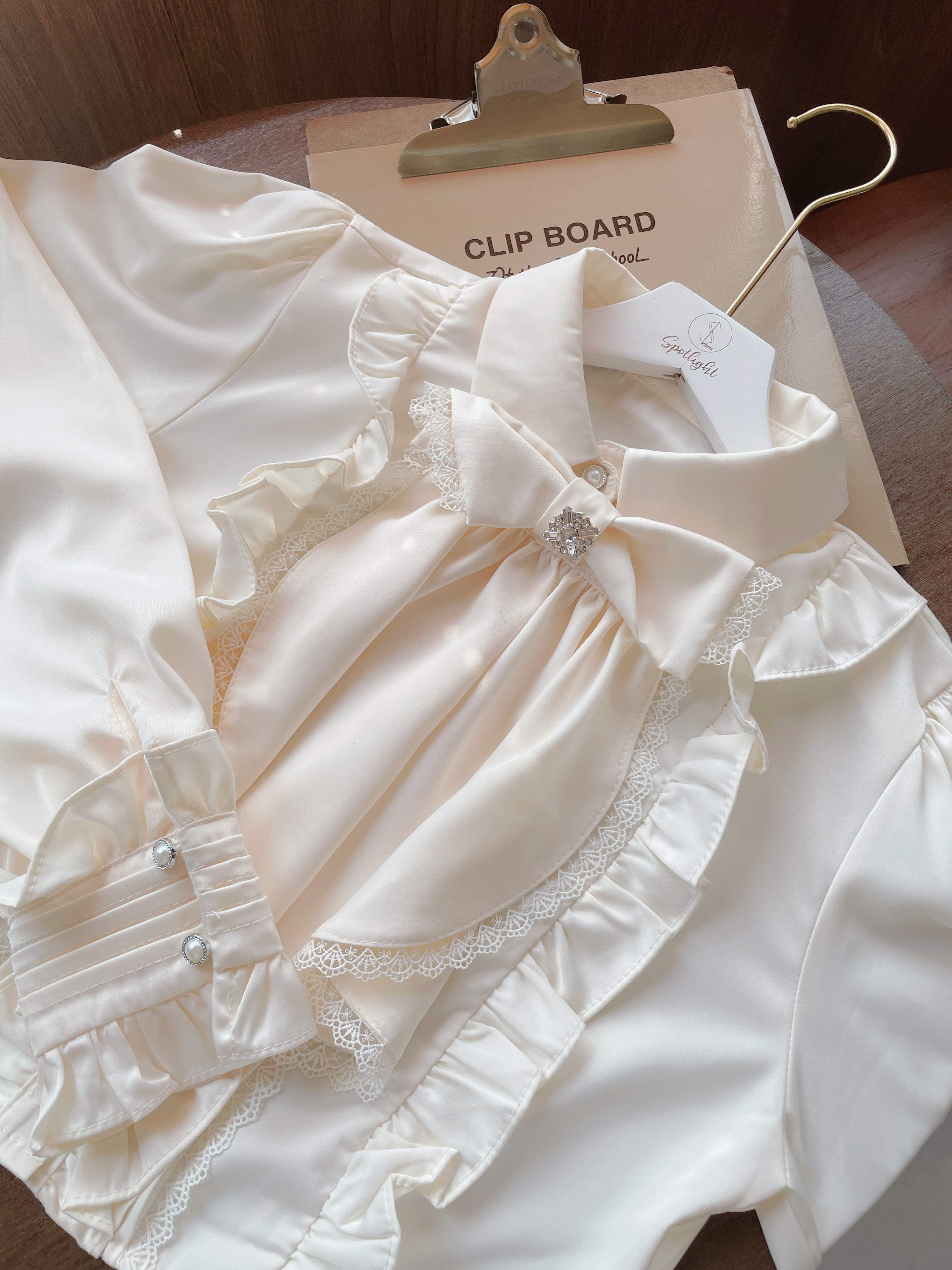 蘿莉蝴蝶結別針緹花滾邊襯衫