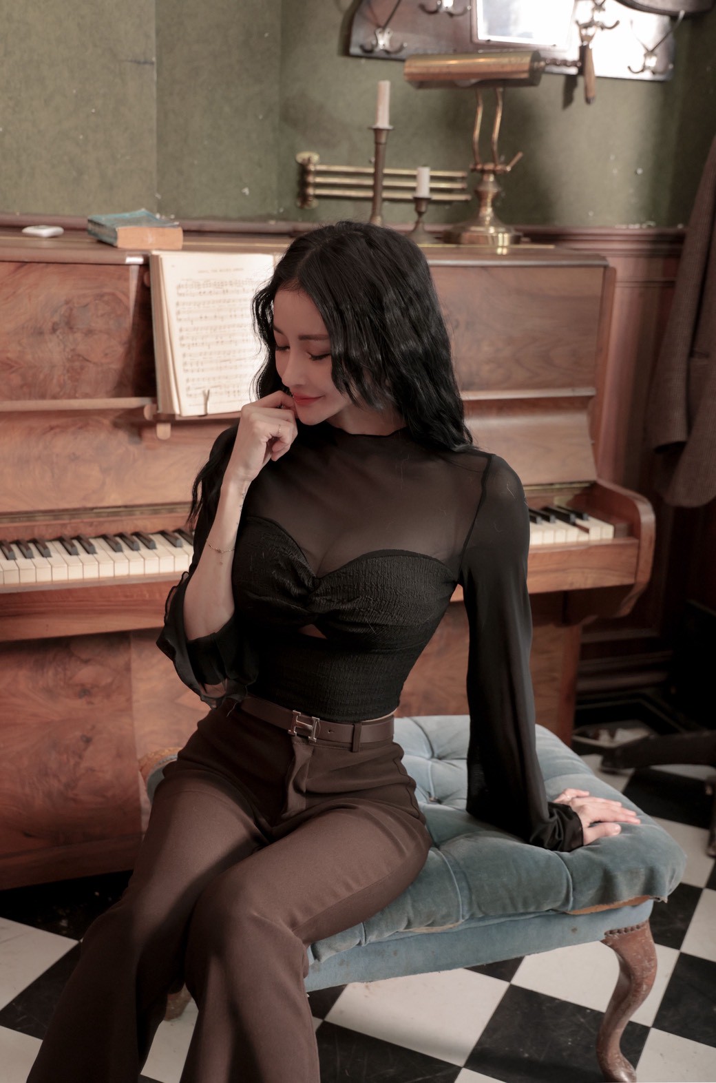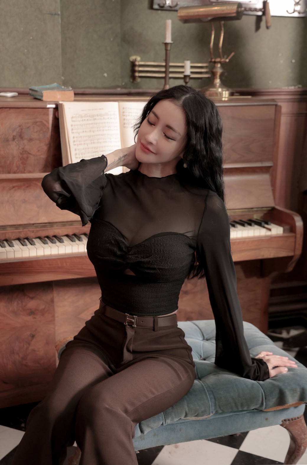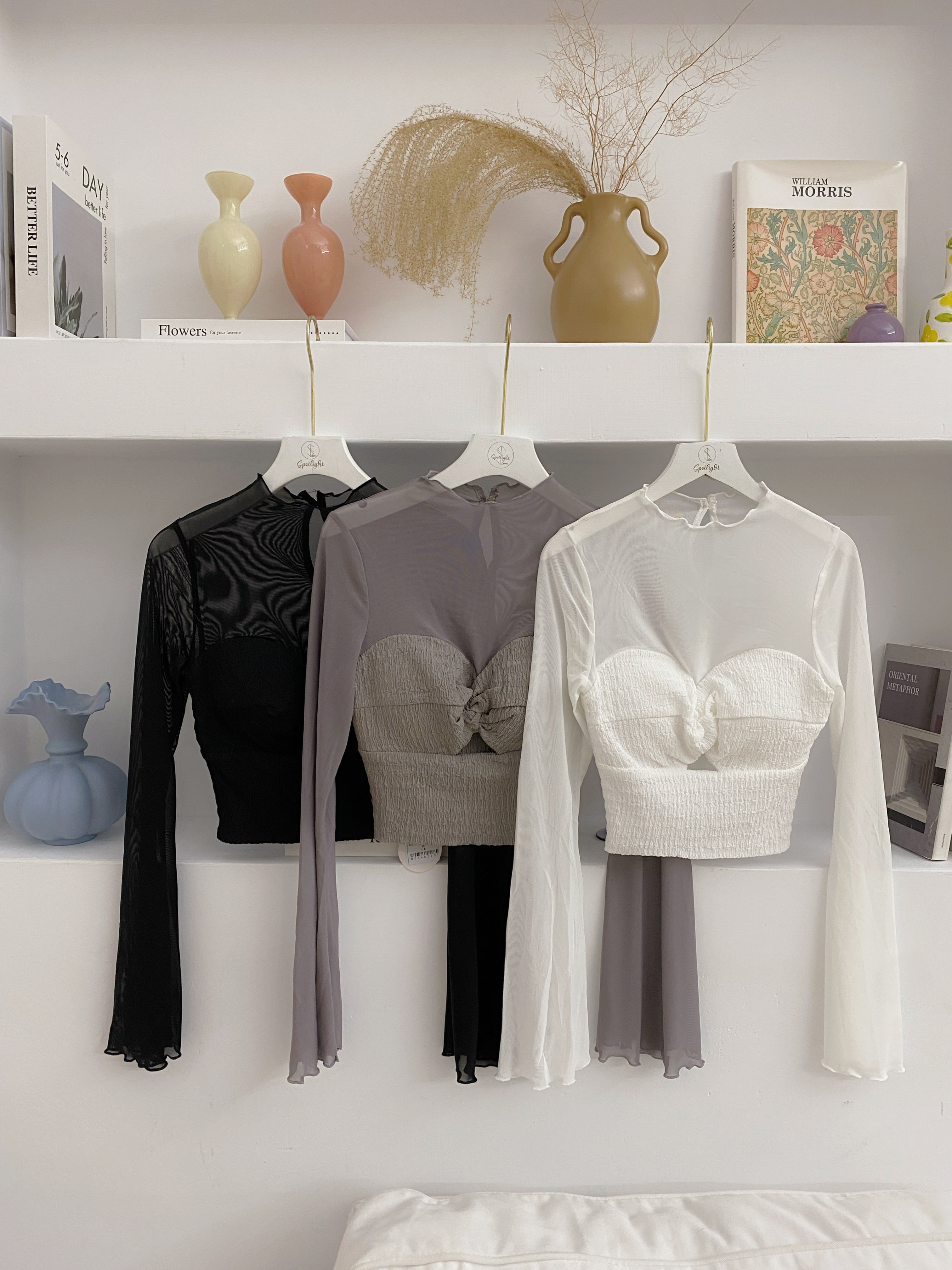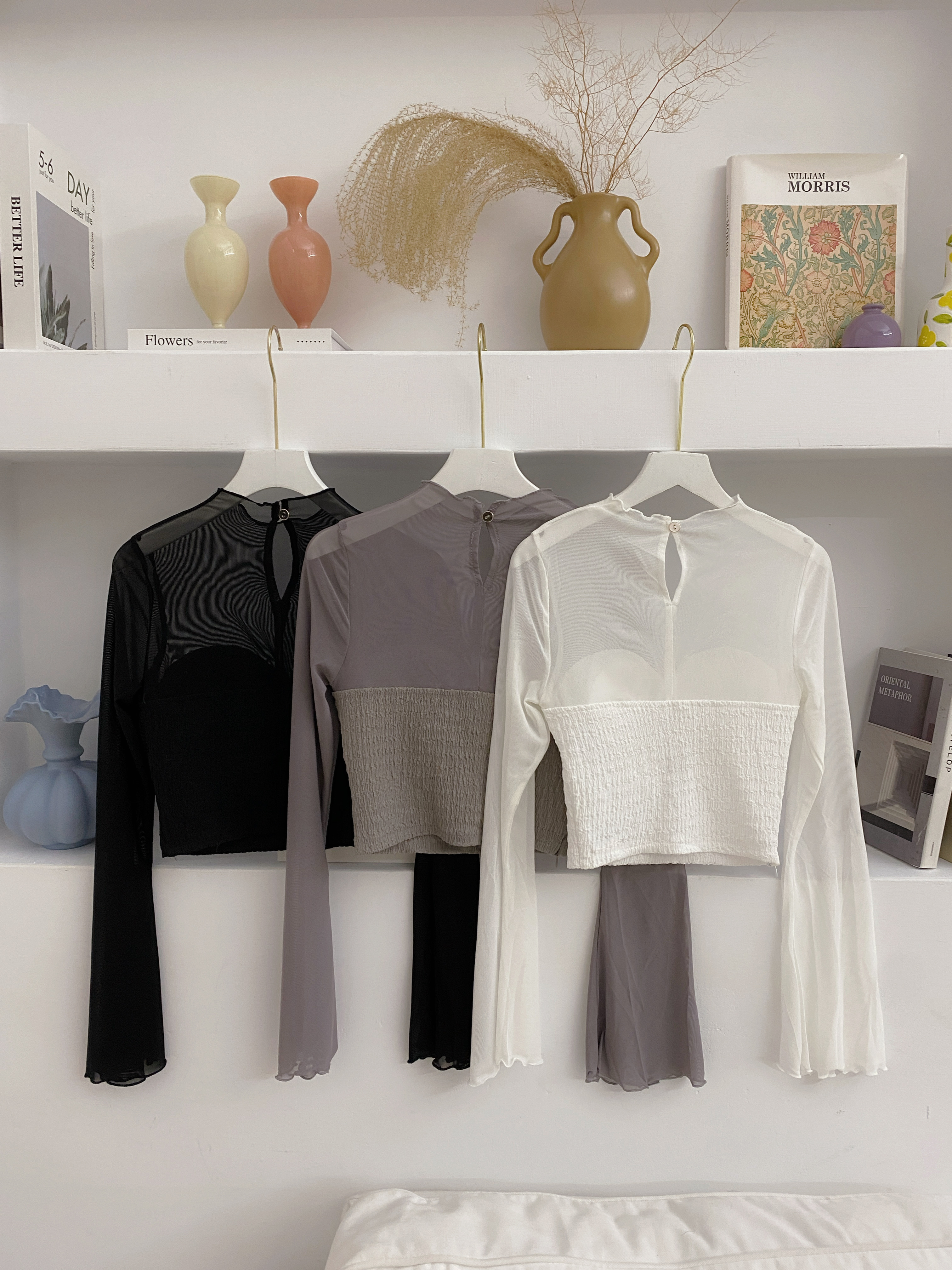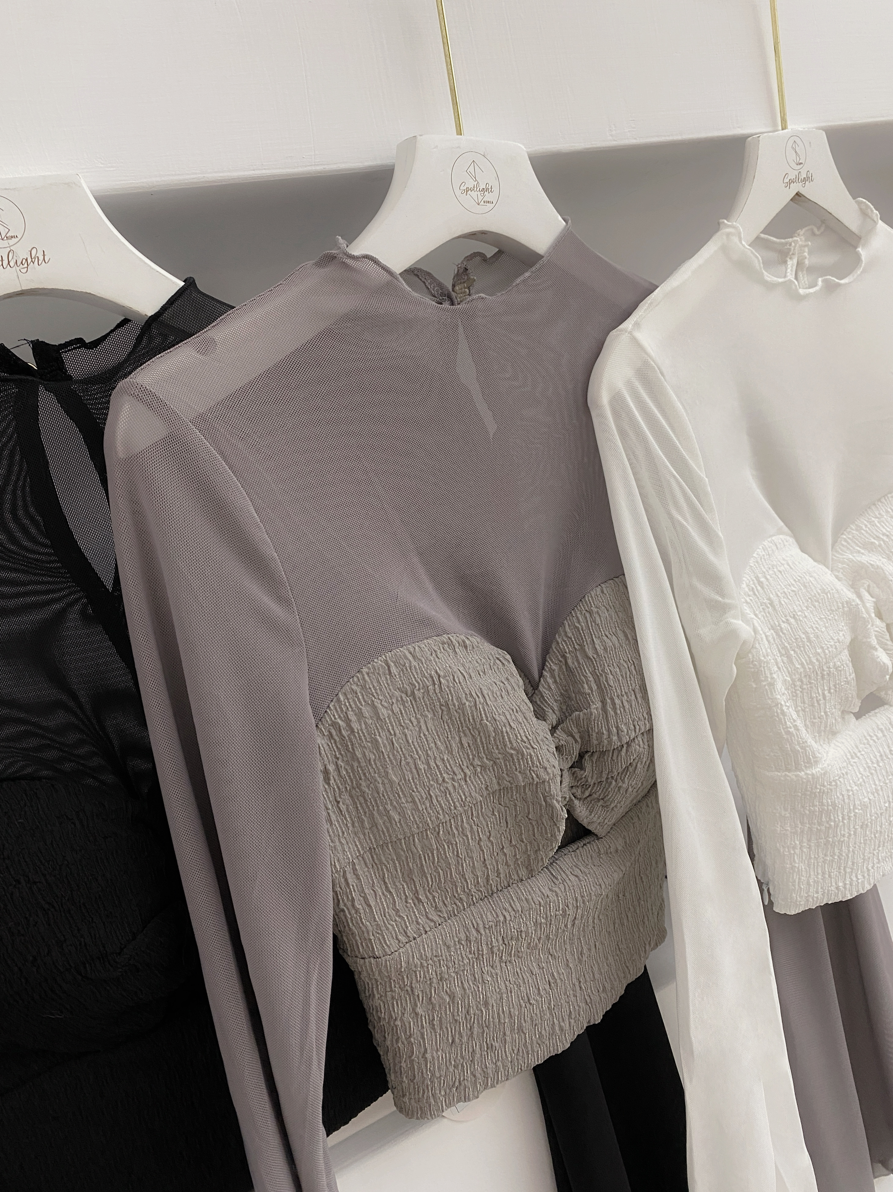 透視扭結木耳邊長袖上衣