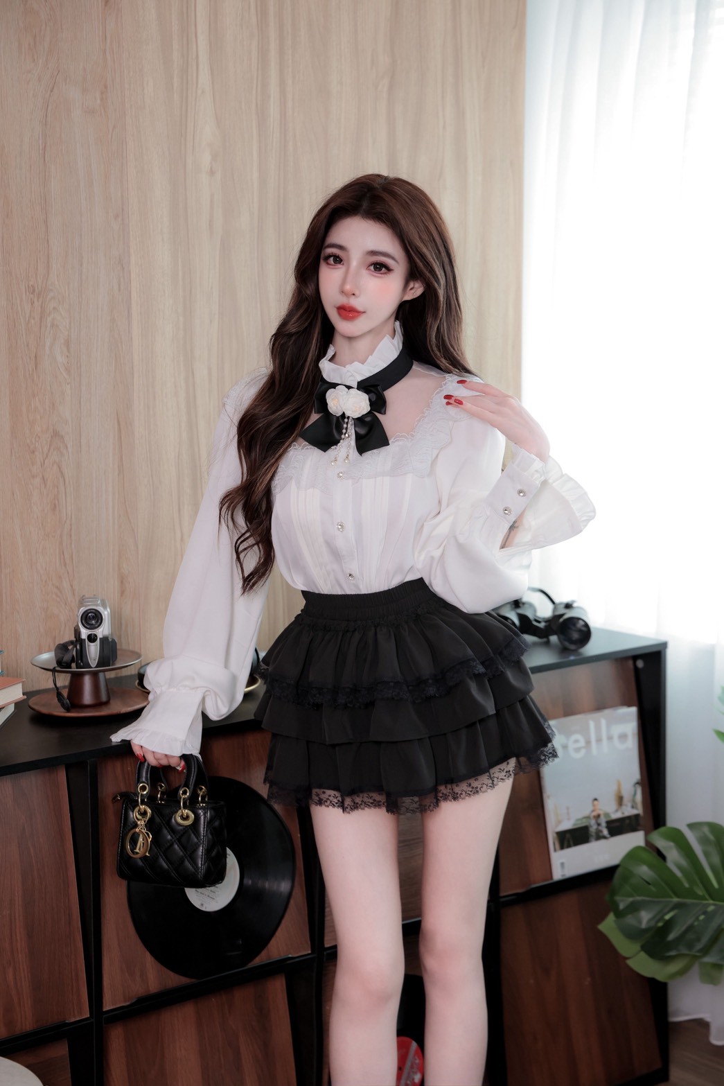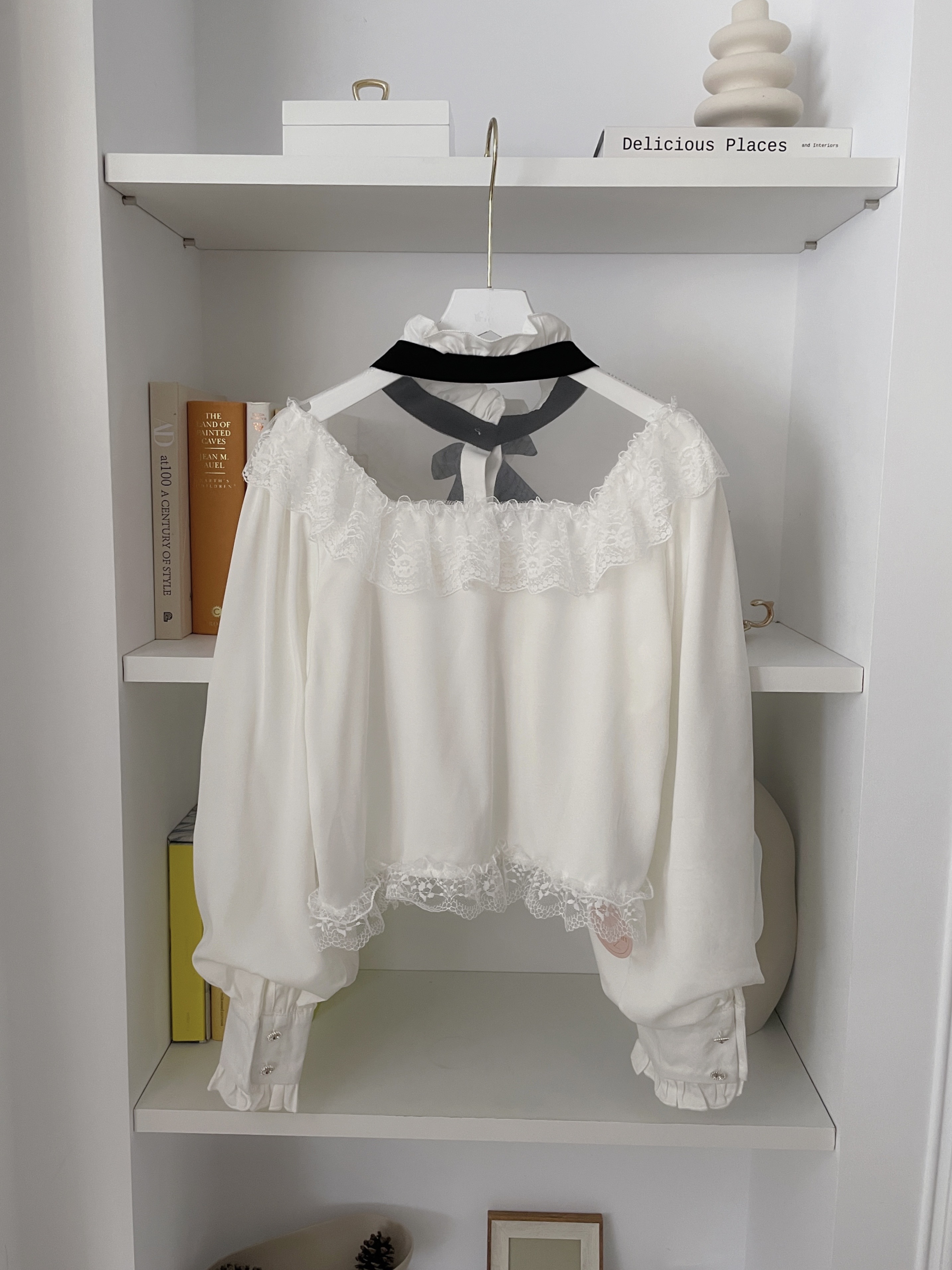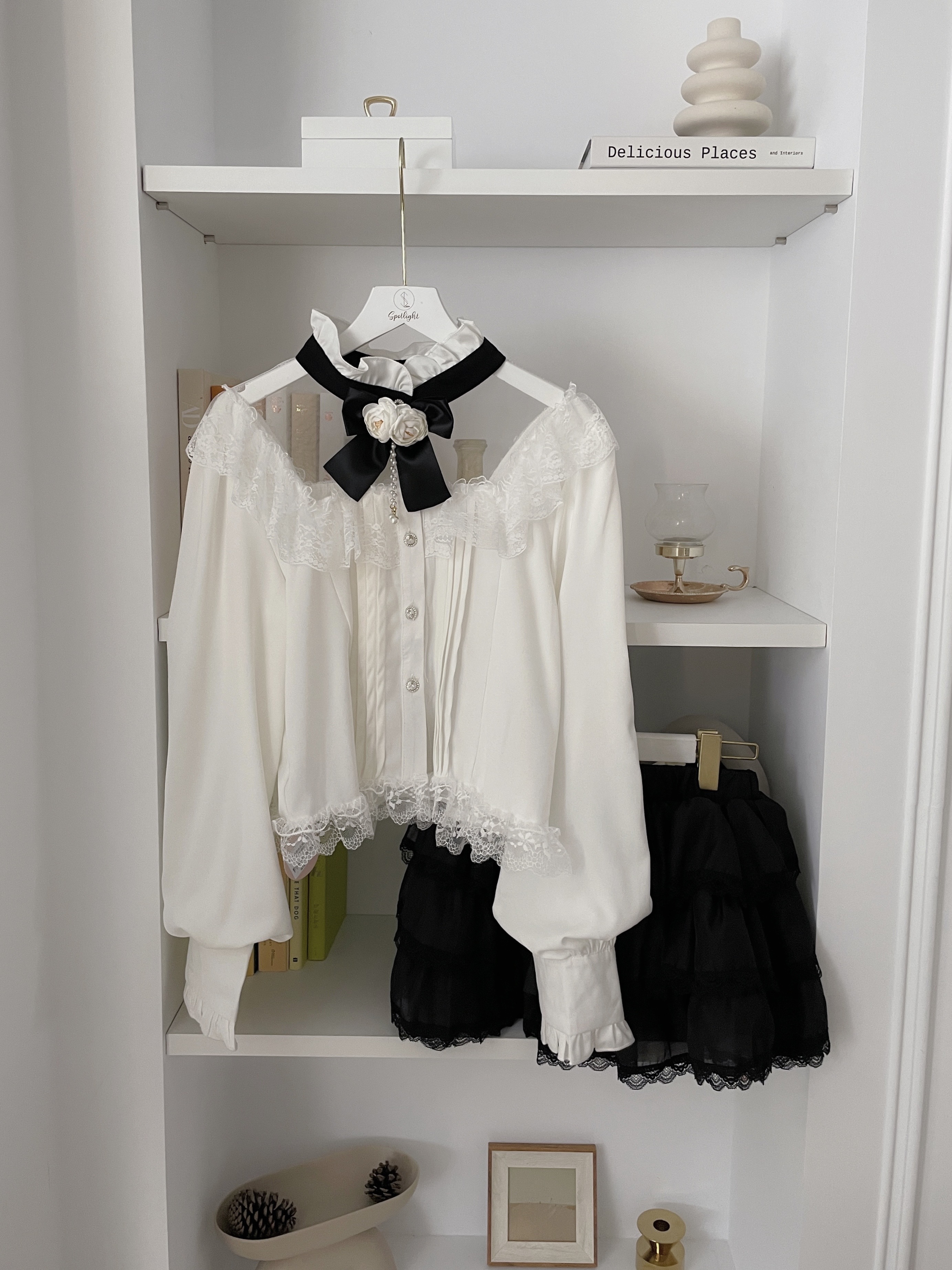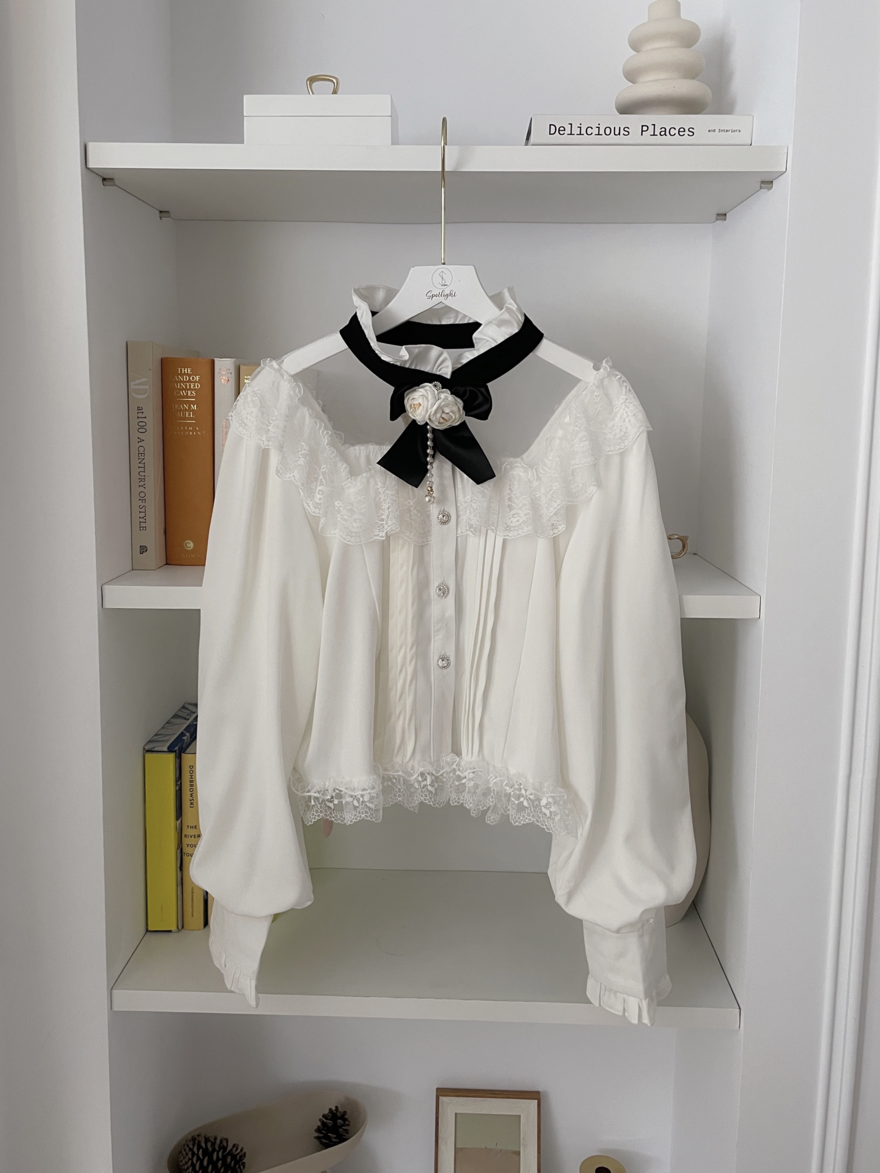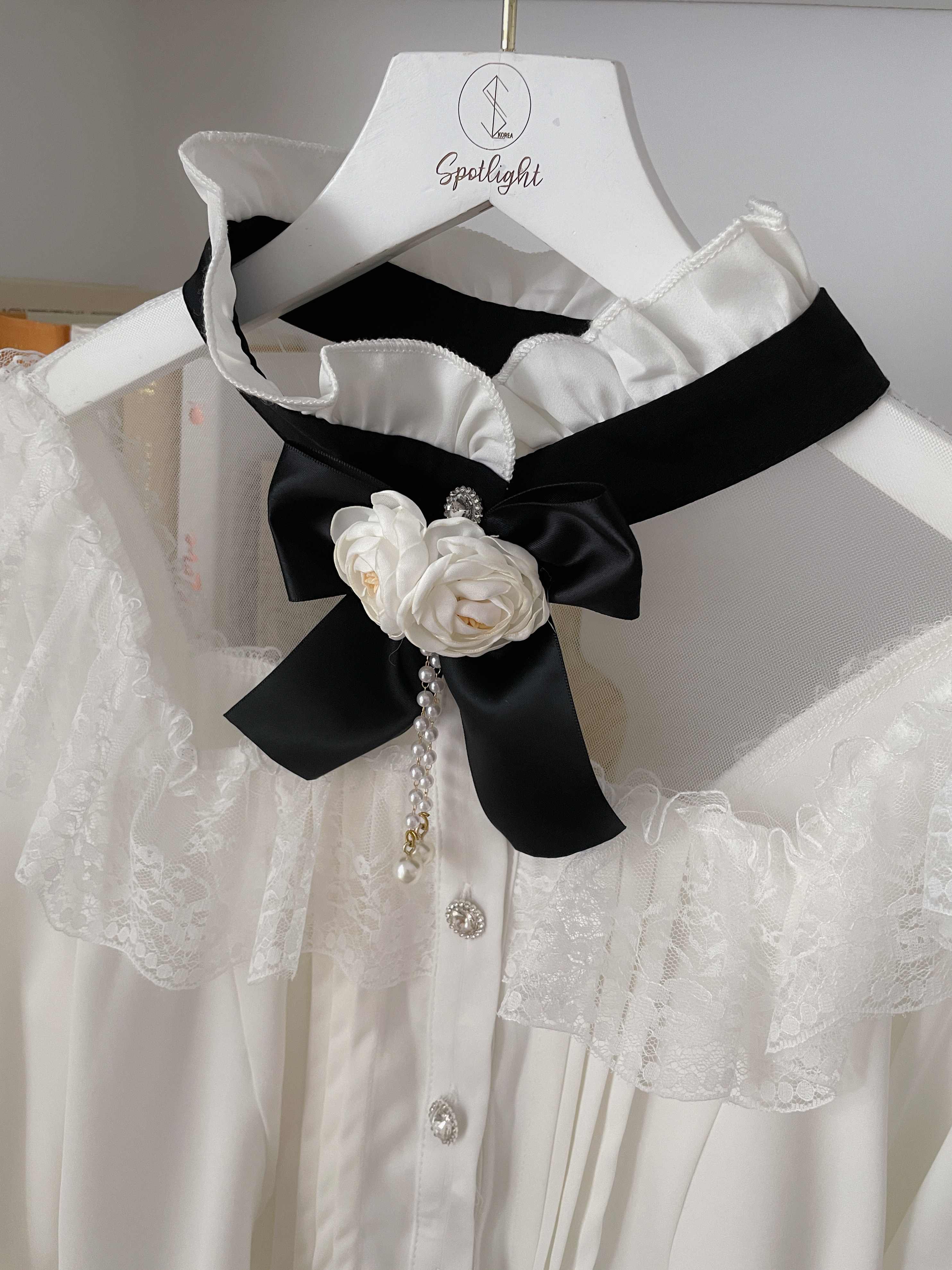 韓國宮廷蕾絲透膚雪紡玫瑰別針襯衫