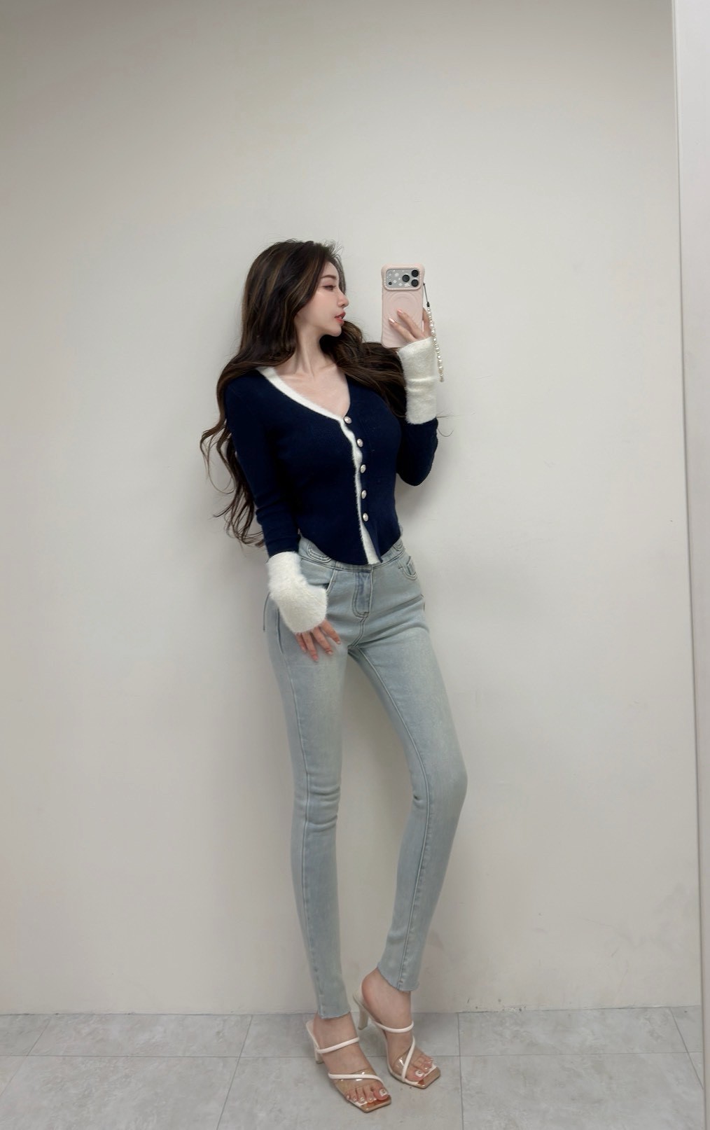 牛仔造型雙口袋三金釦加絨窄管褲