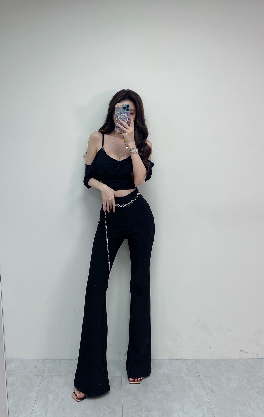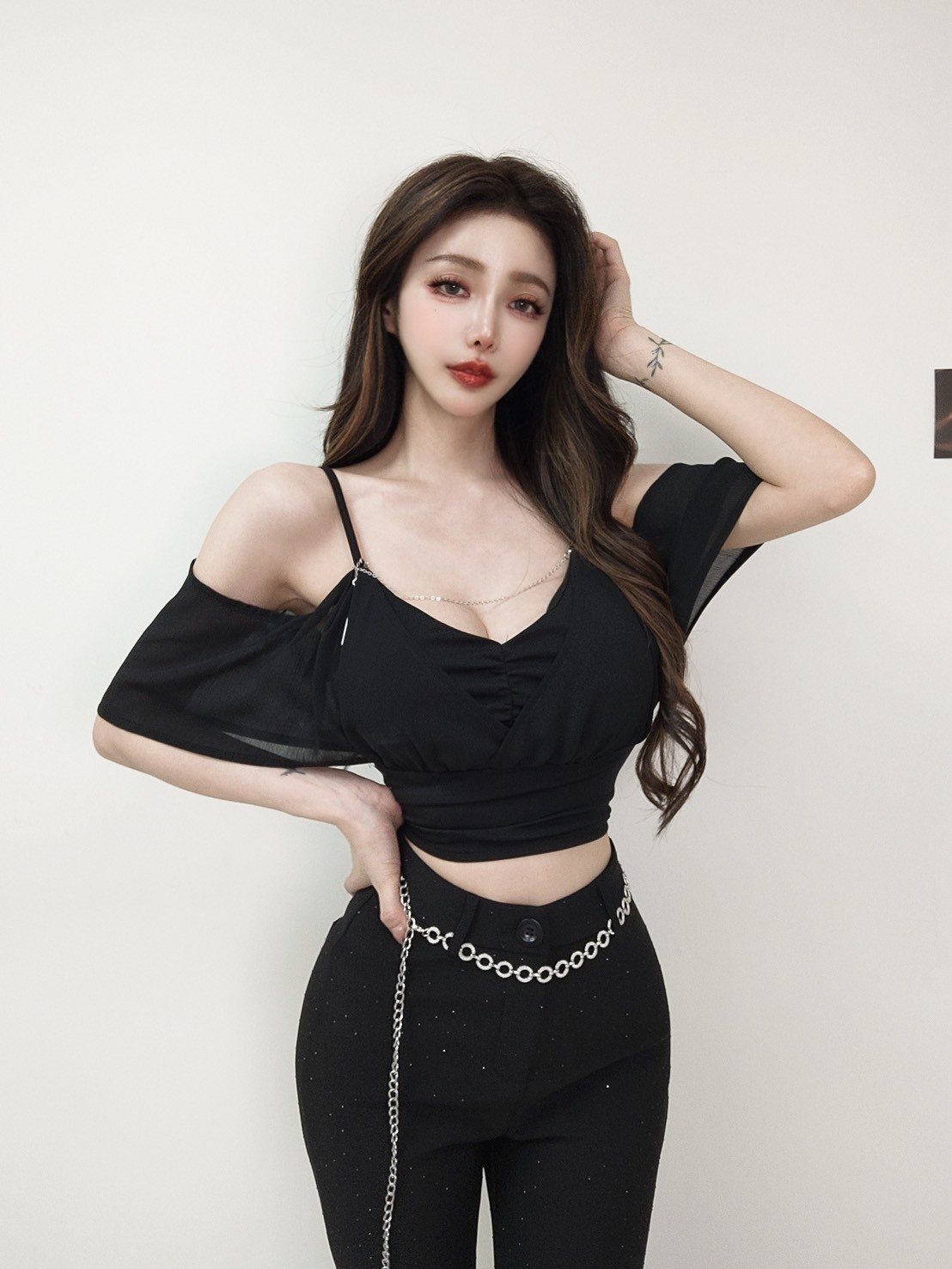 訂製款 夢幻仙境 細肩銀鏈紗袖露肩上衣