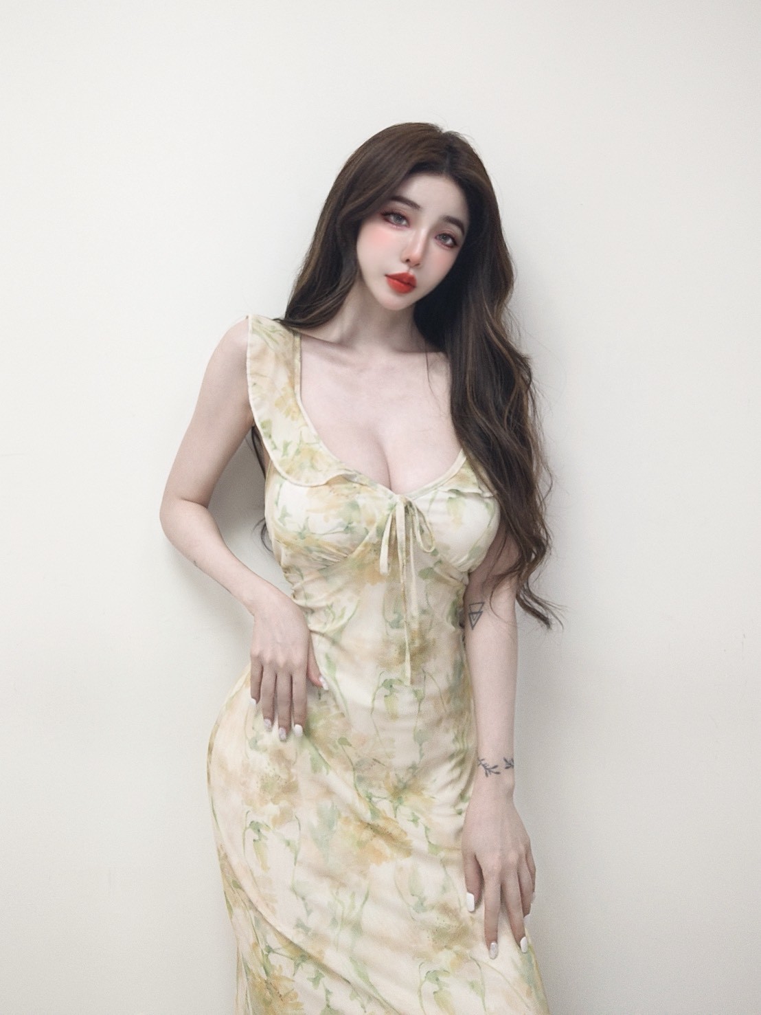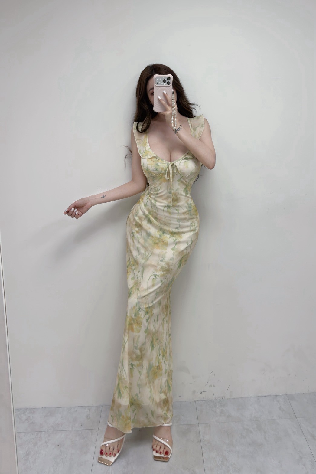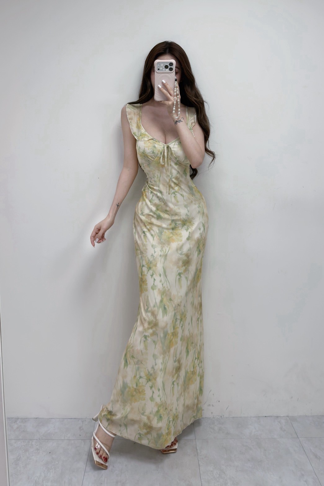 浪漫花園 荷葉邊暈染花朵長洋