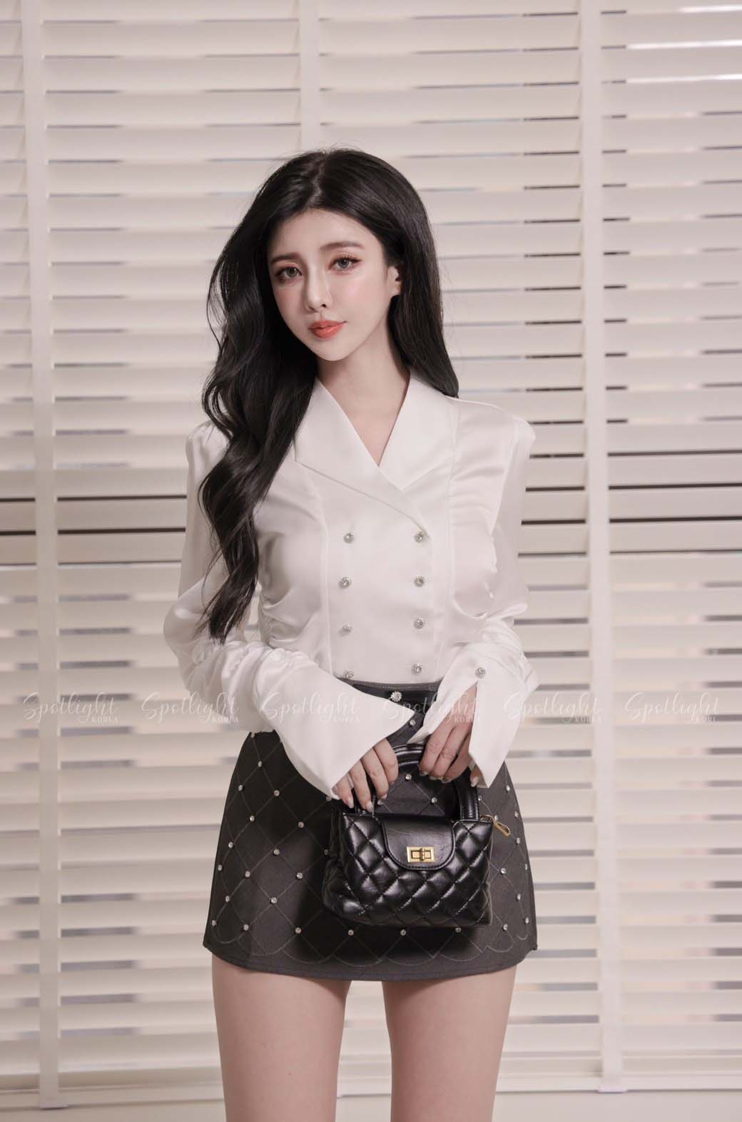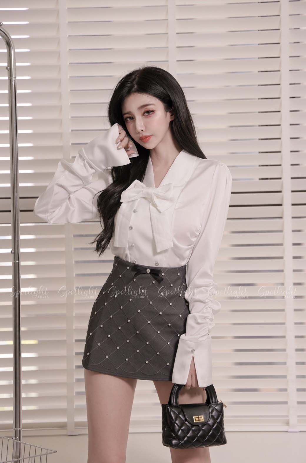 優雅女爵 蝴蝶結鑽排釦皺褶袖縮腰襯衫