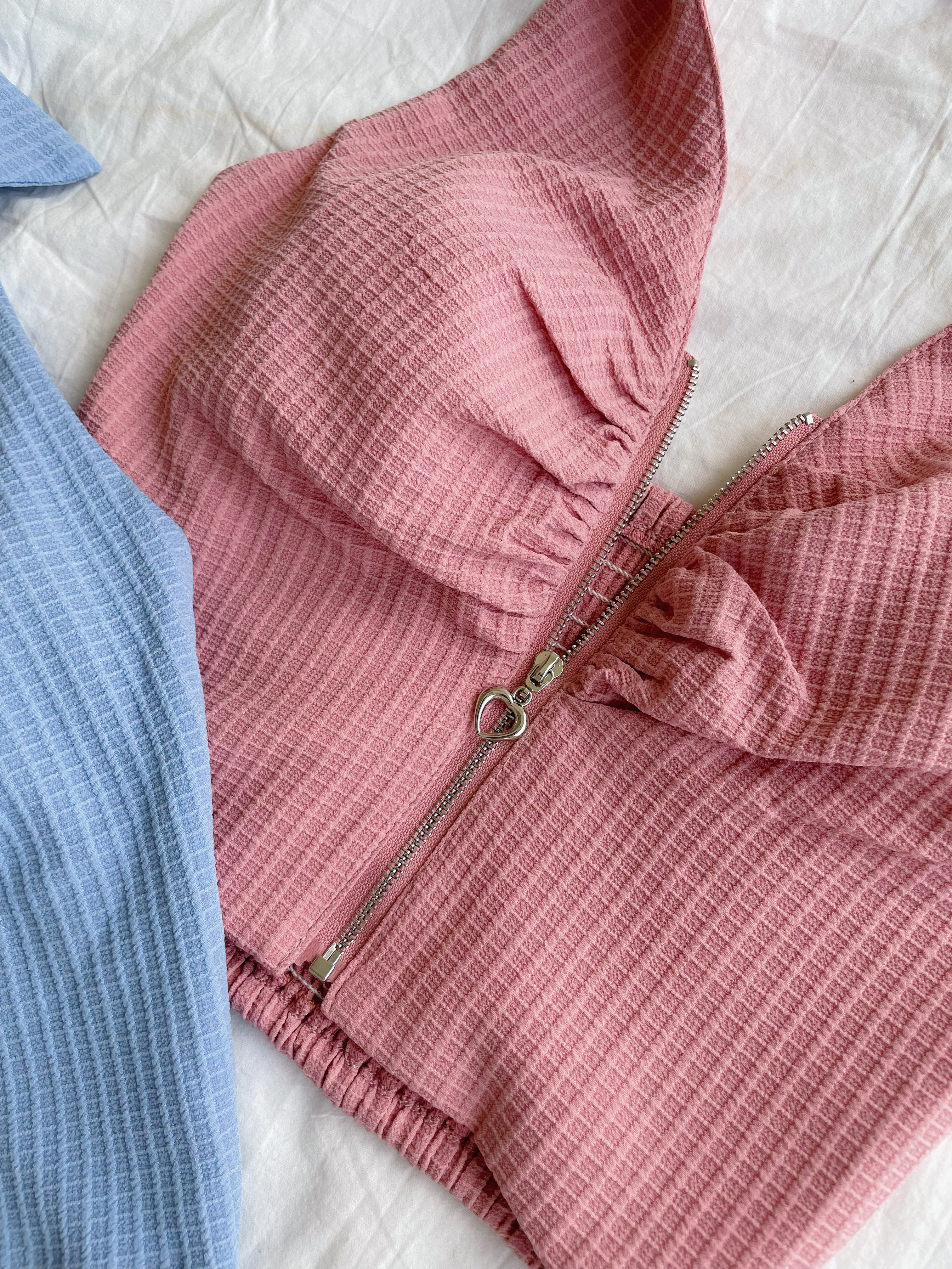 採用挺版華夫格面料,質感細膩且有型,拉鍊細節增添時尚感,拉鍊環特別設計成愛心造型,甜美中帶有個性魅力。