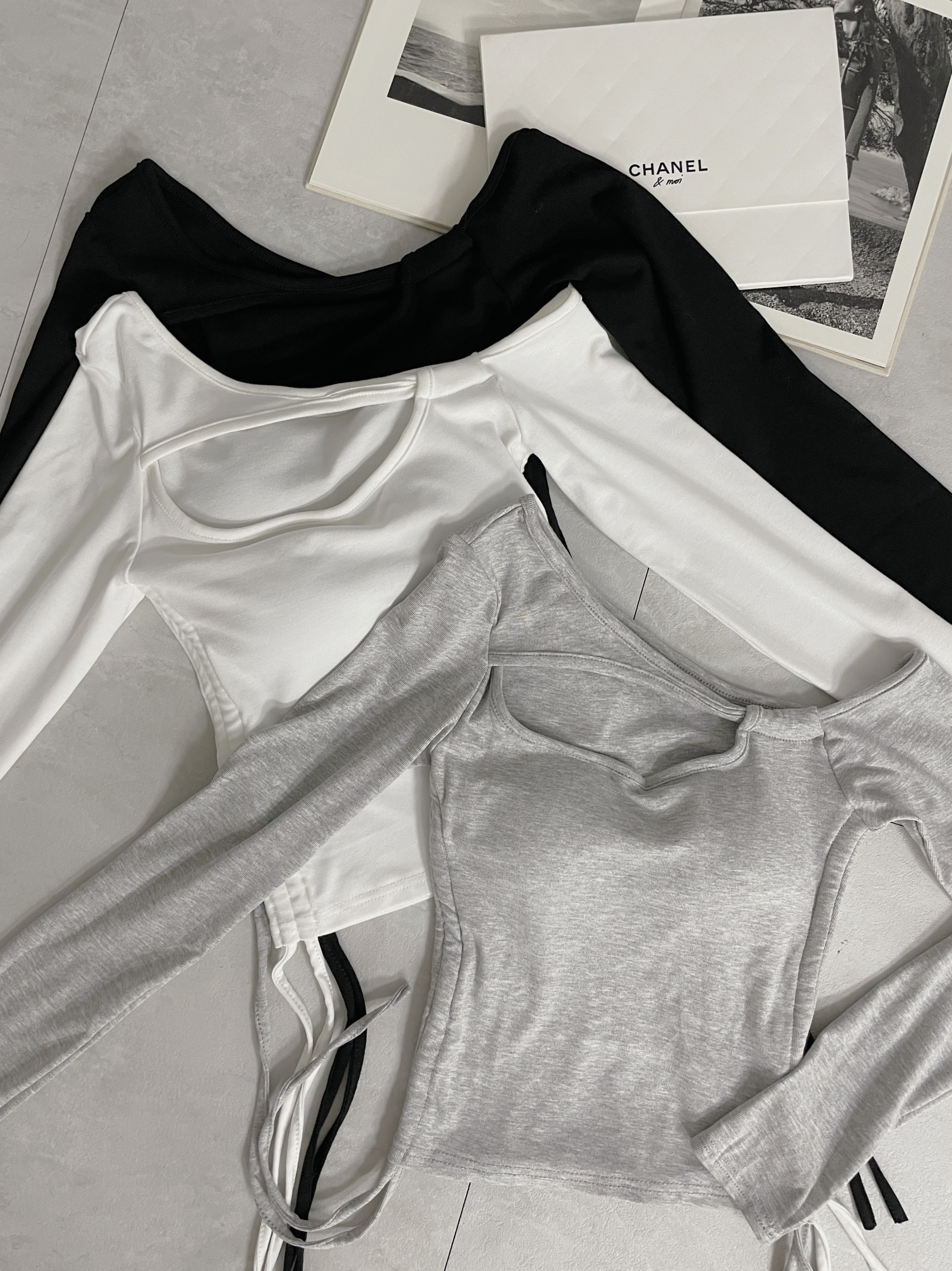 斜肩挖胸抽繩長袖上衣