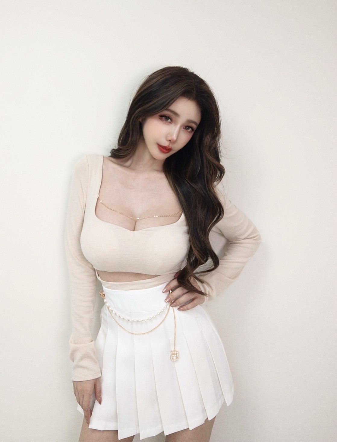 桃心金鏈腰挖空長袖上衣