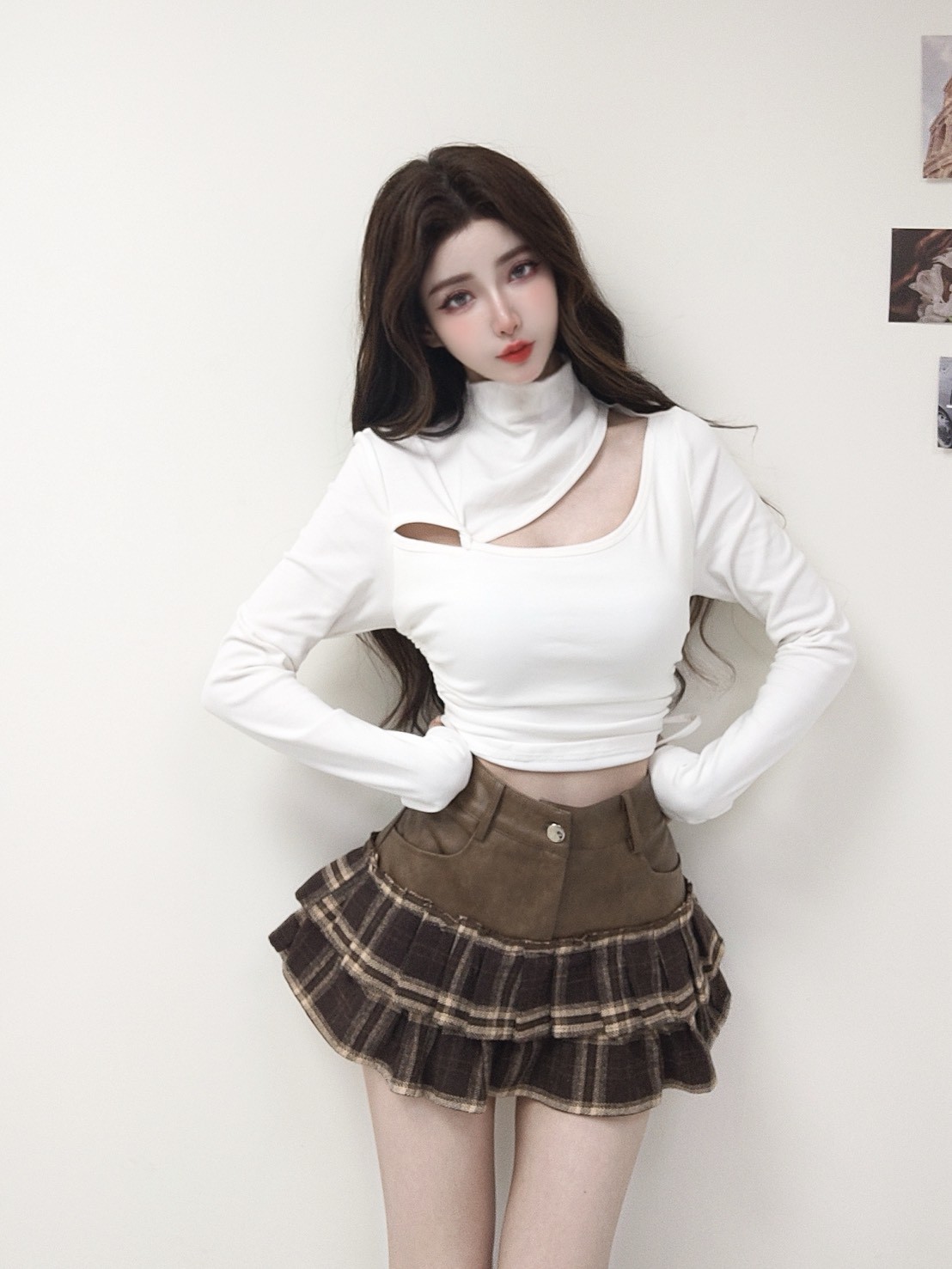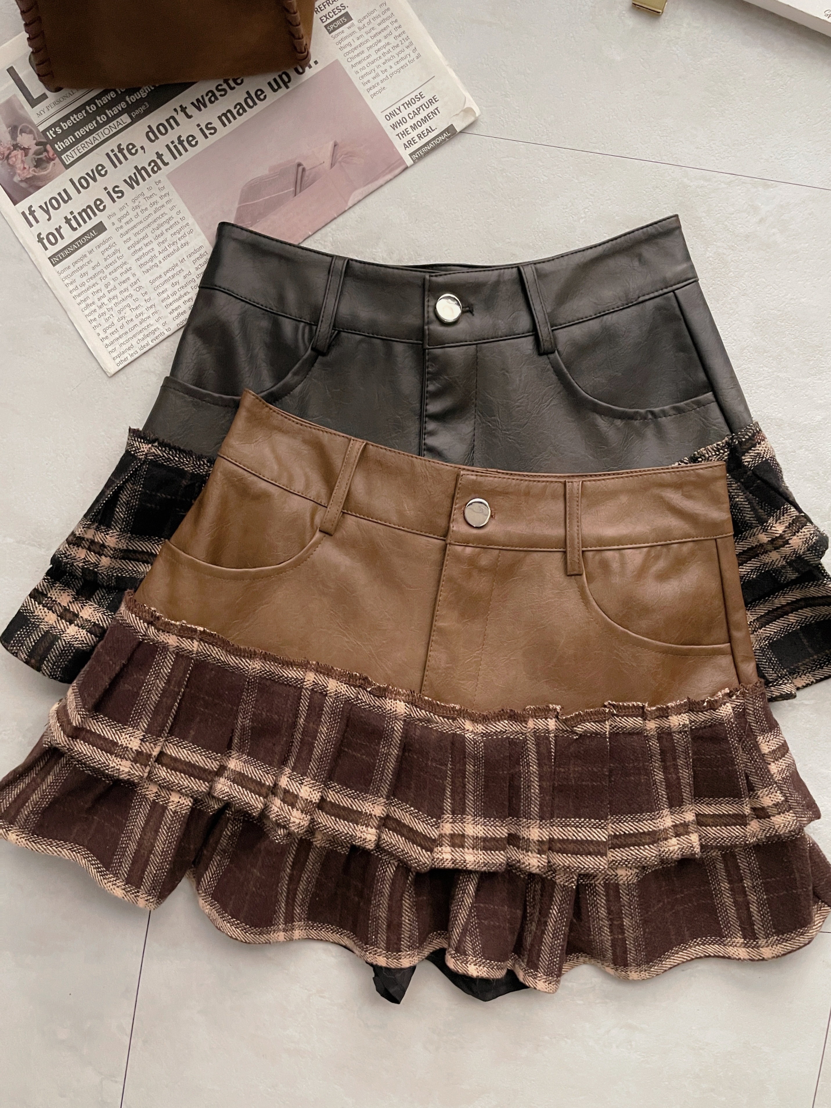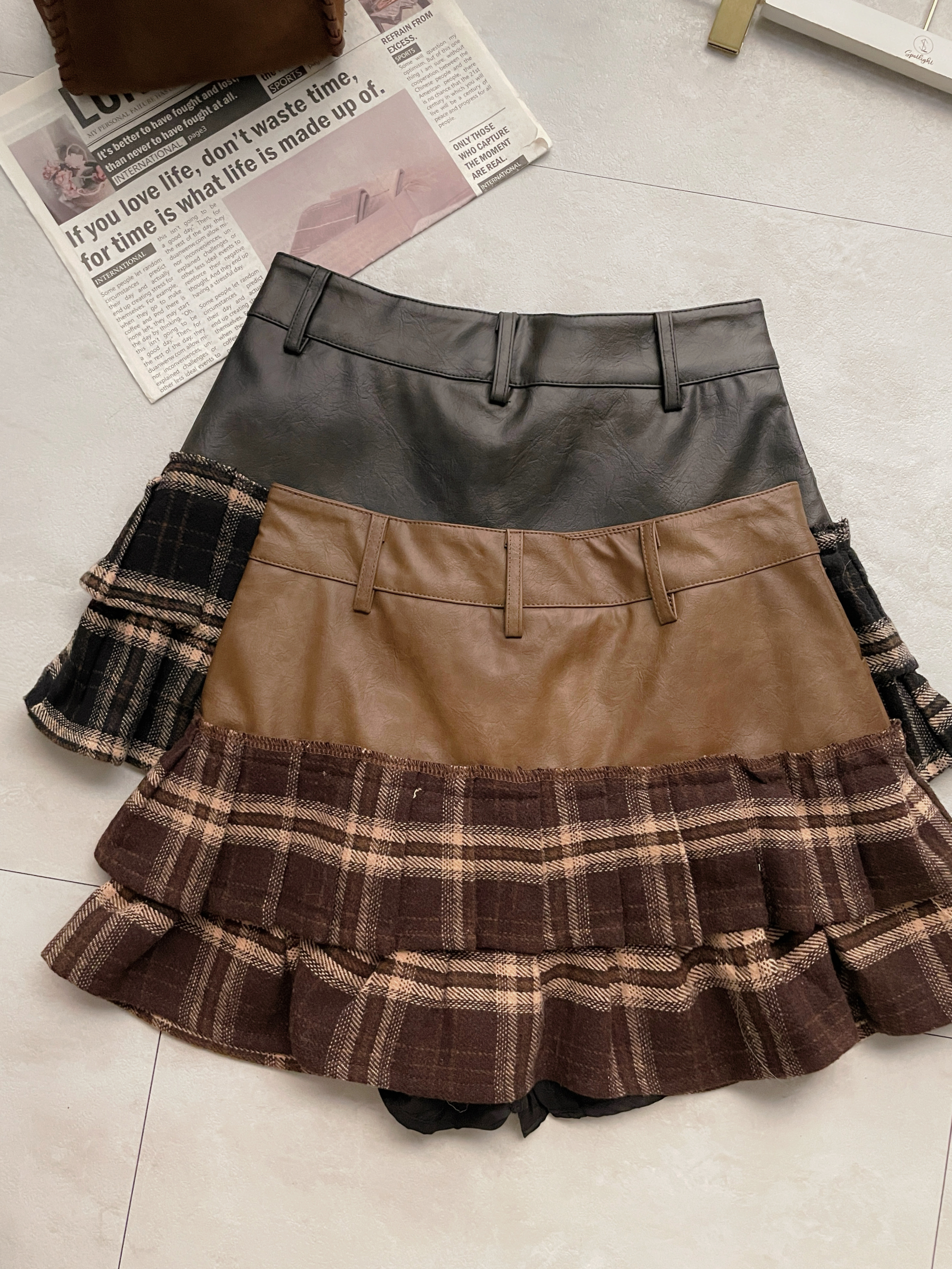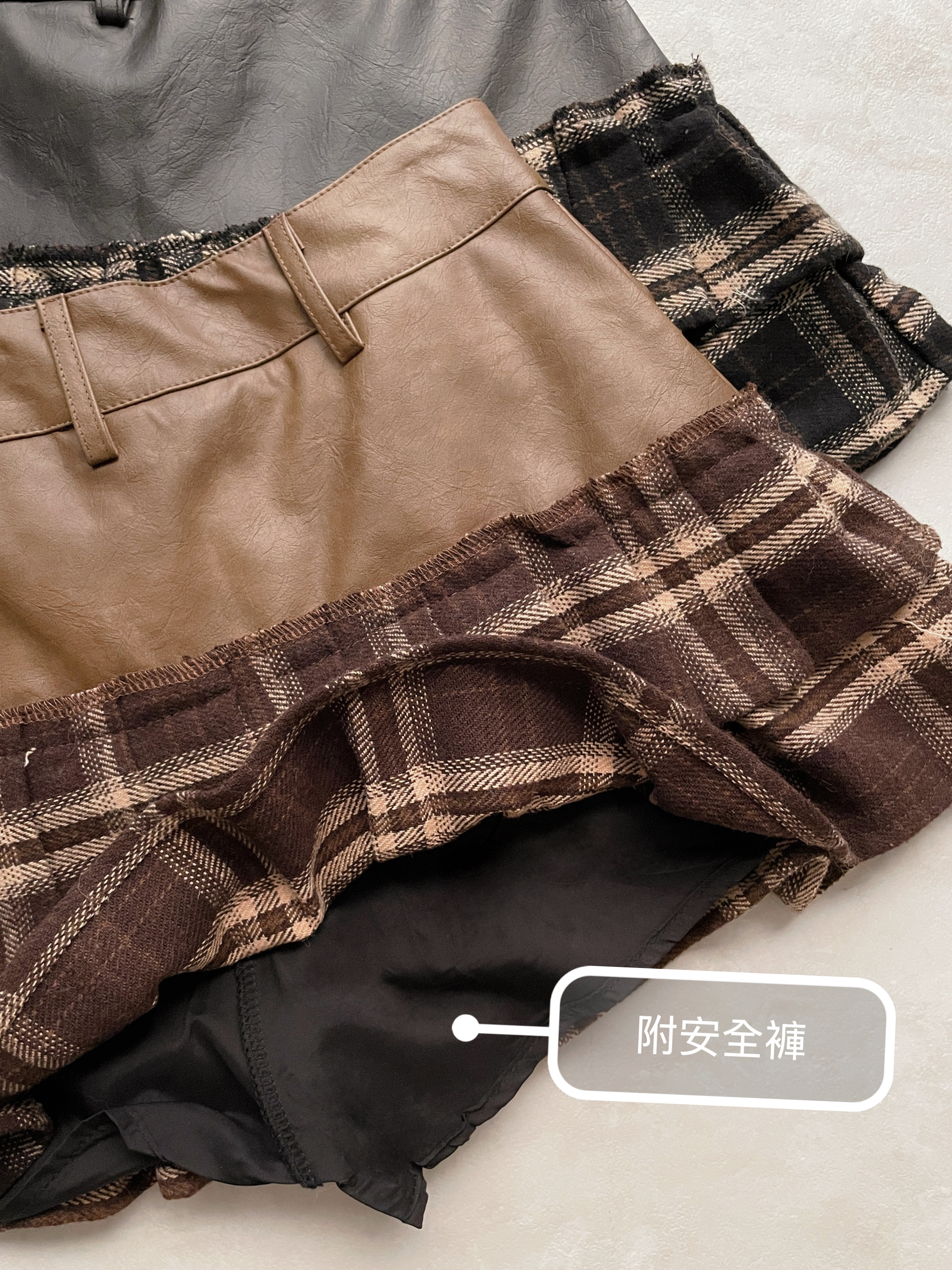 秋冬質感 韓國皮革拼接格紋毛呢百褶蛋糕裙