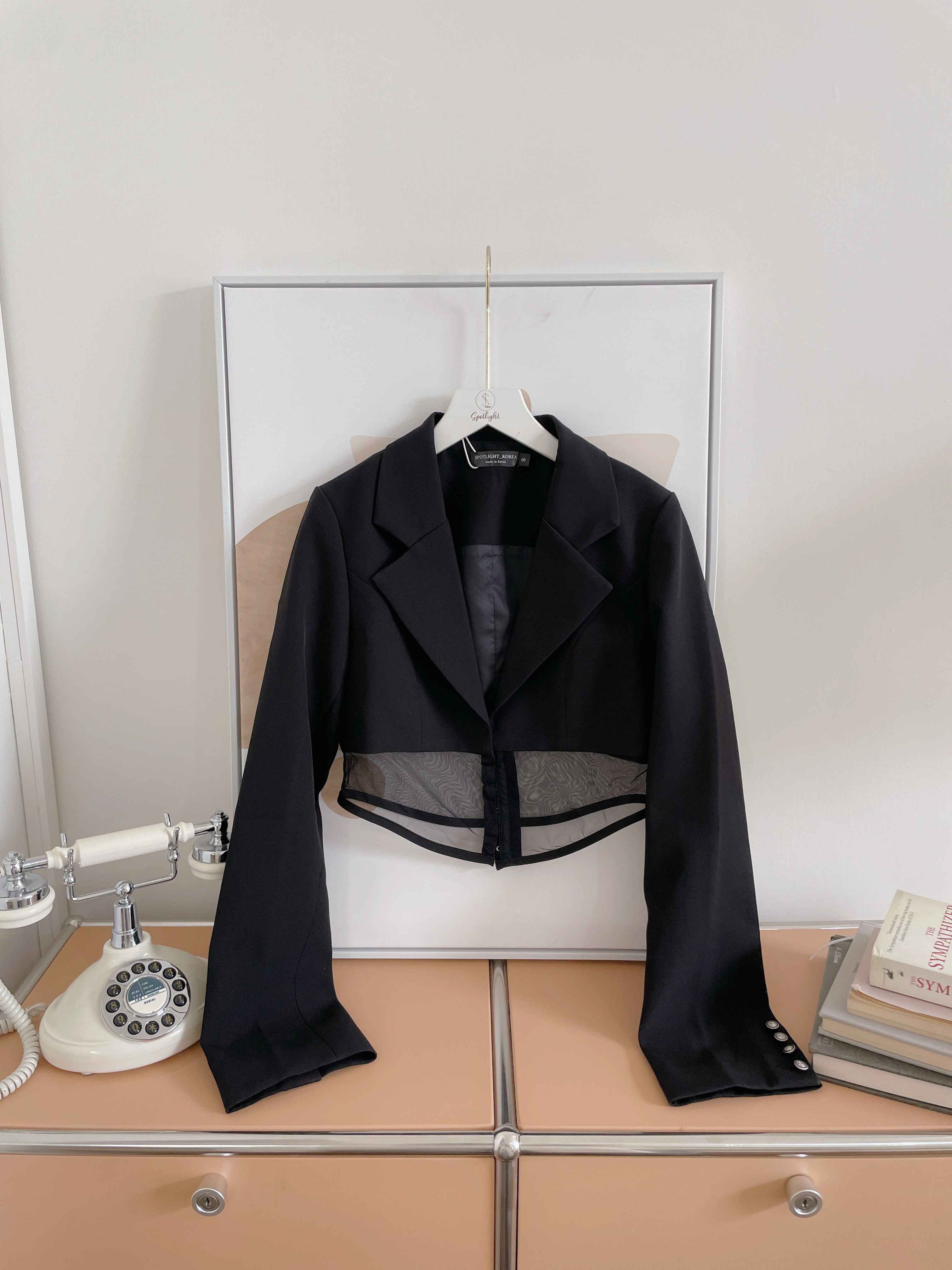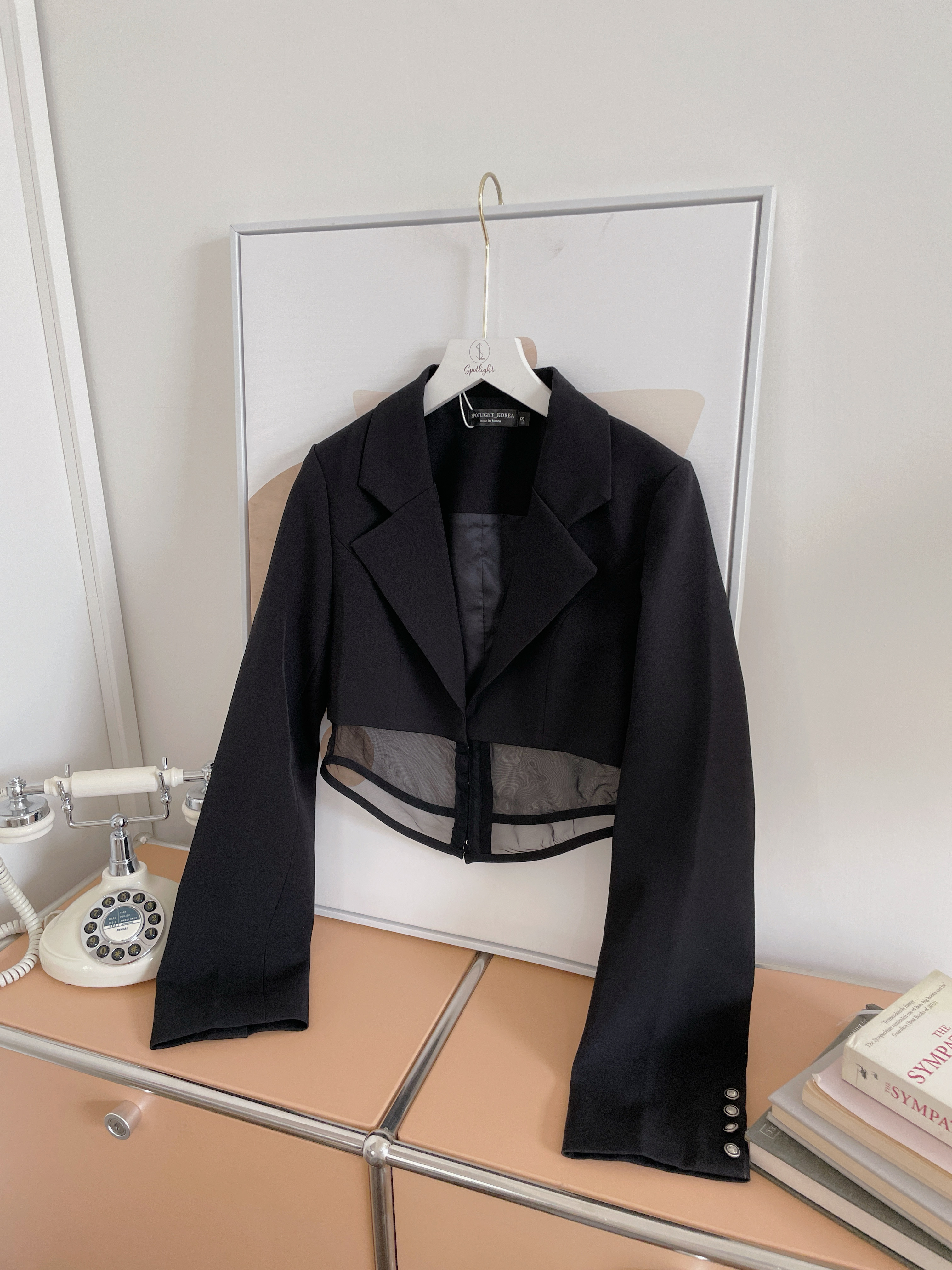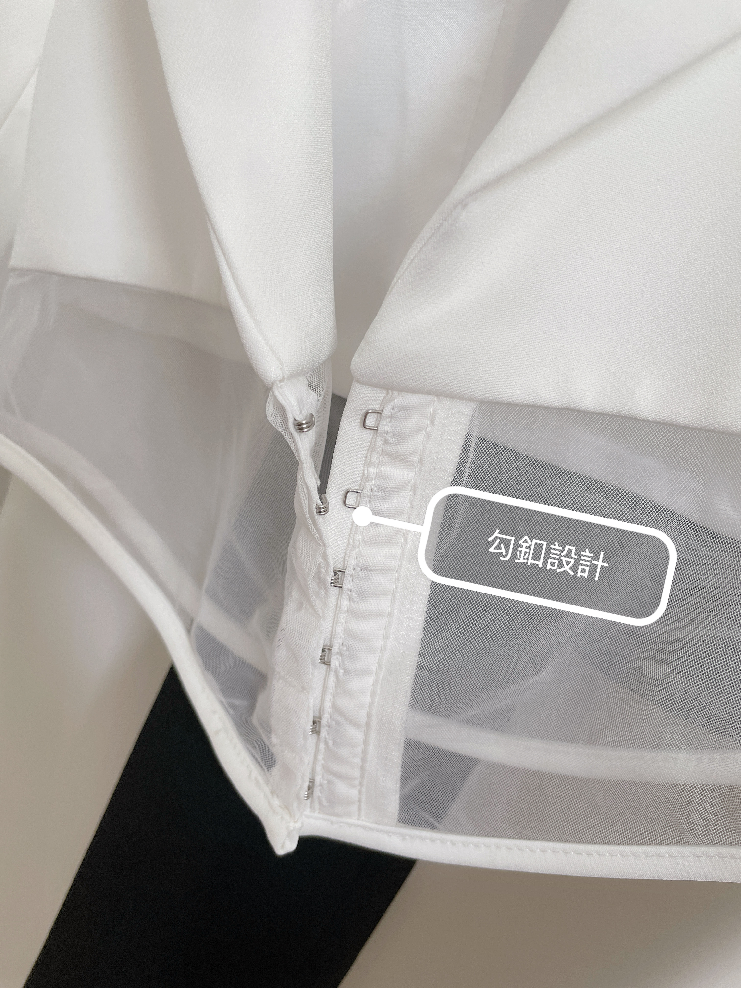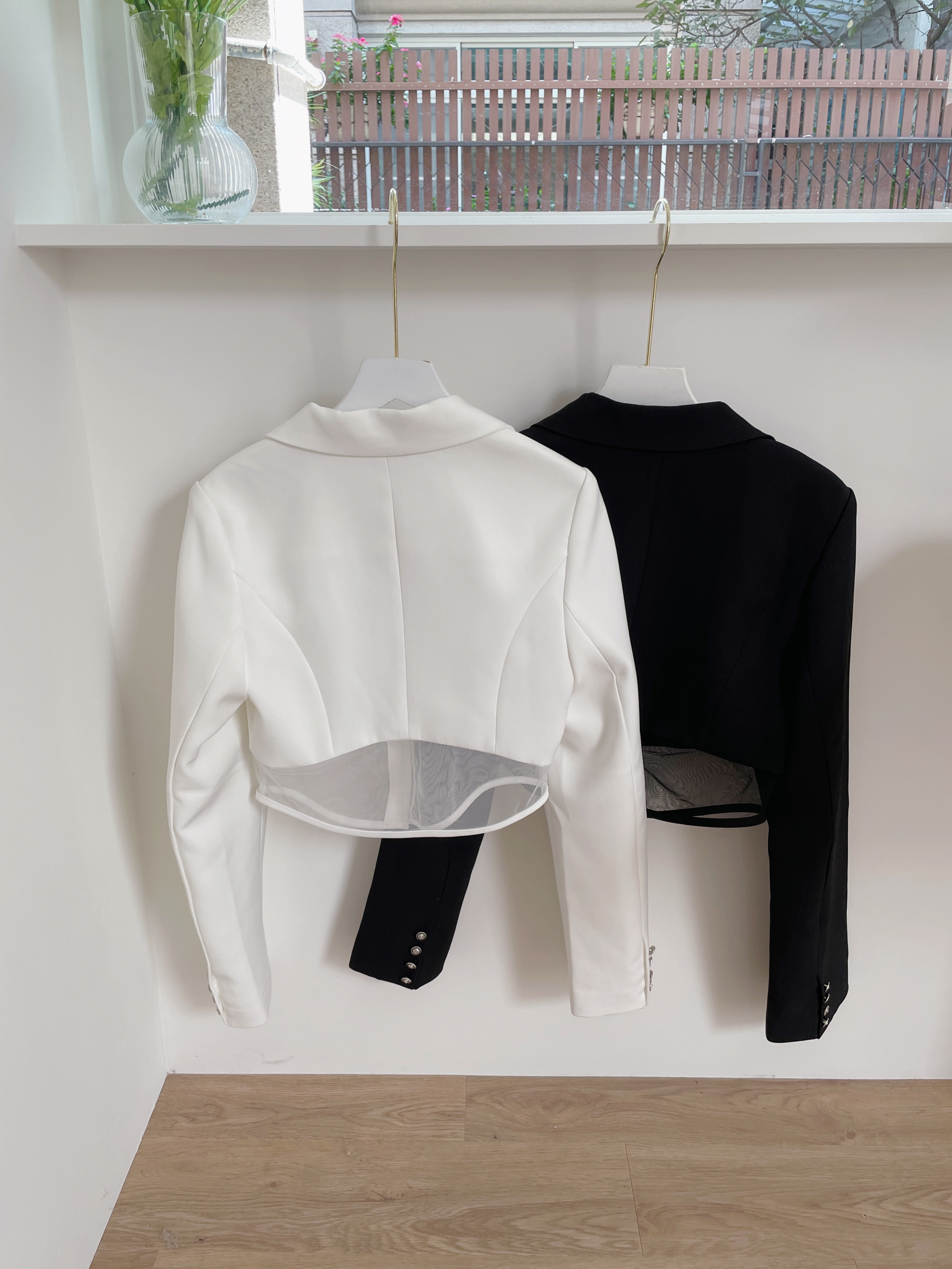 採用經典短版西裝翻領剪裁,正面下襬以弧形透紗結合勾釦細節設計,於俐落線條中增添精緻層次,呈現兼具質感與風格的正式造型。