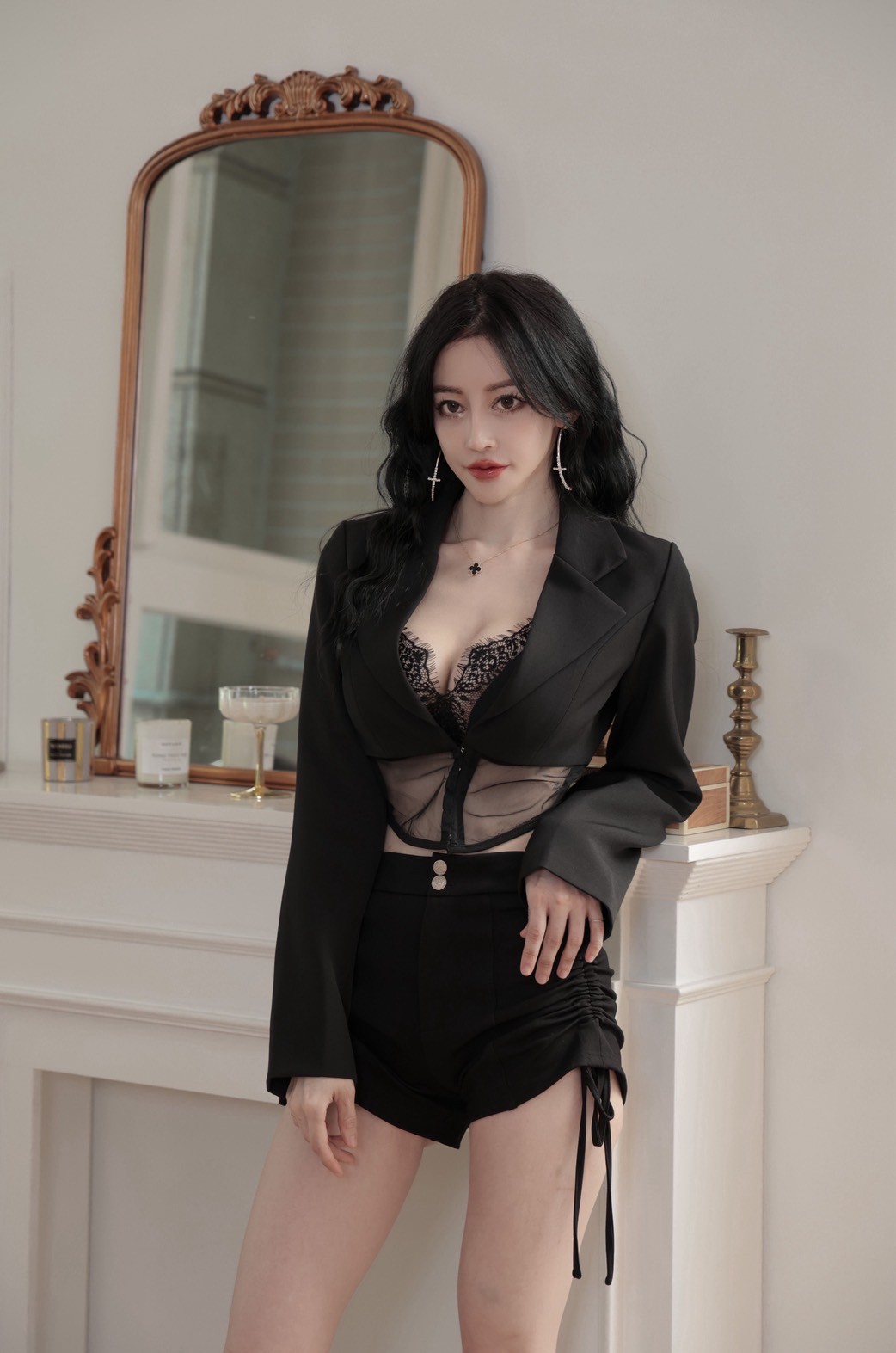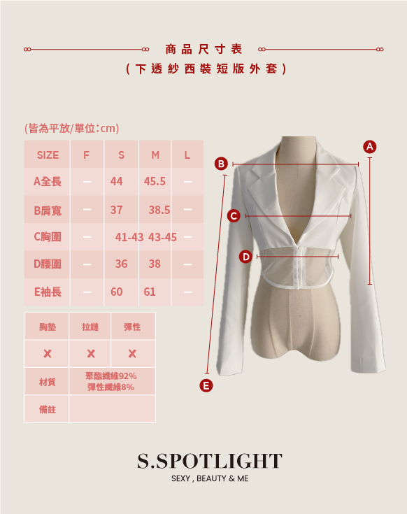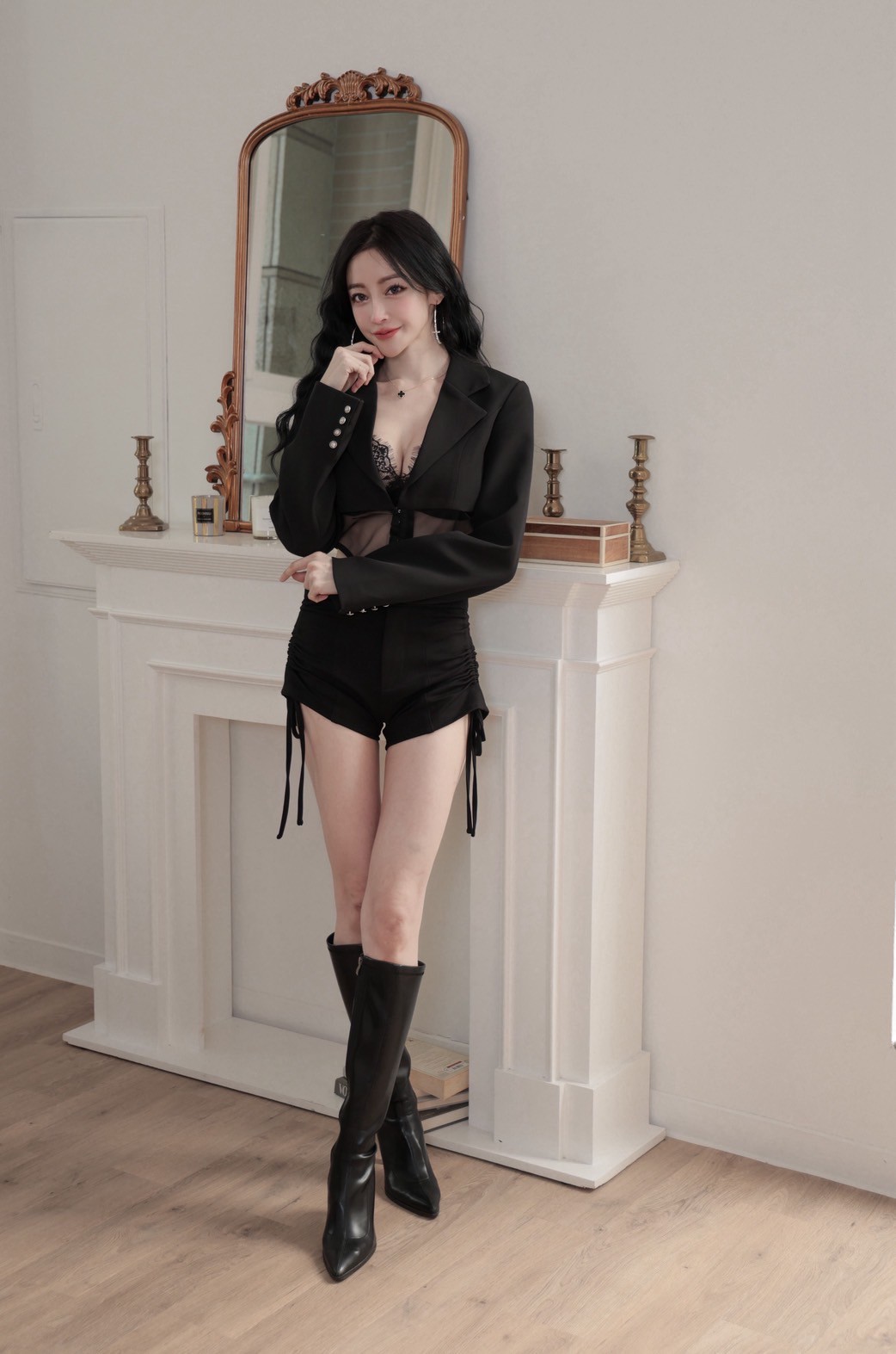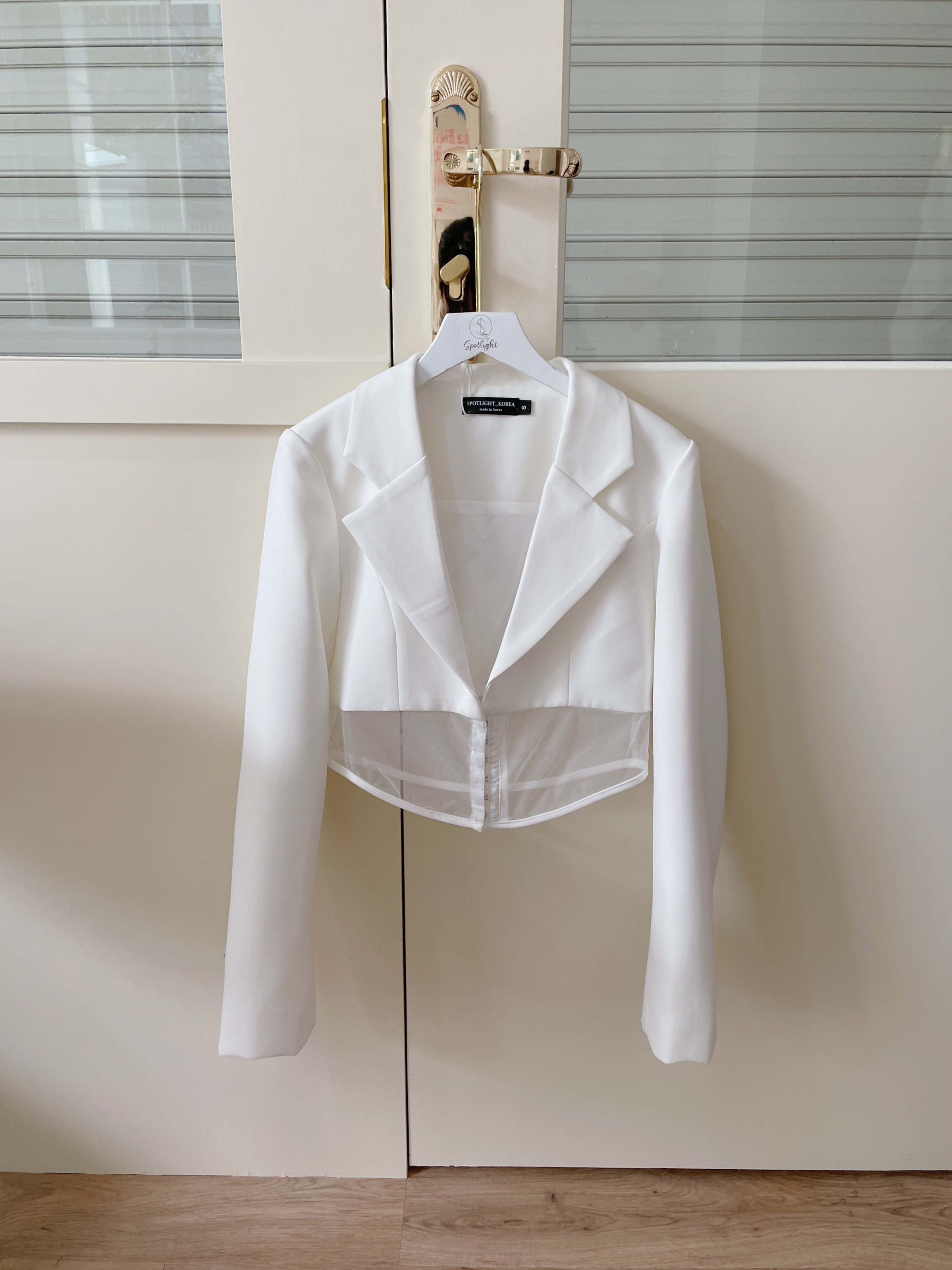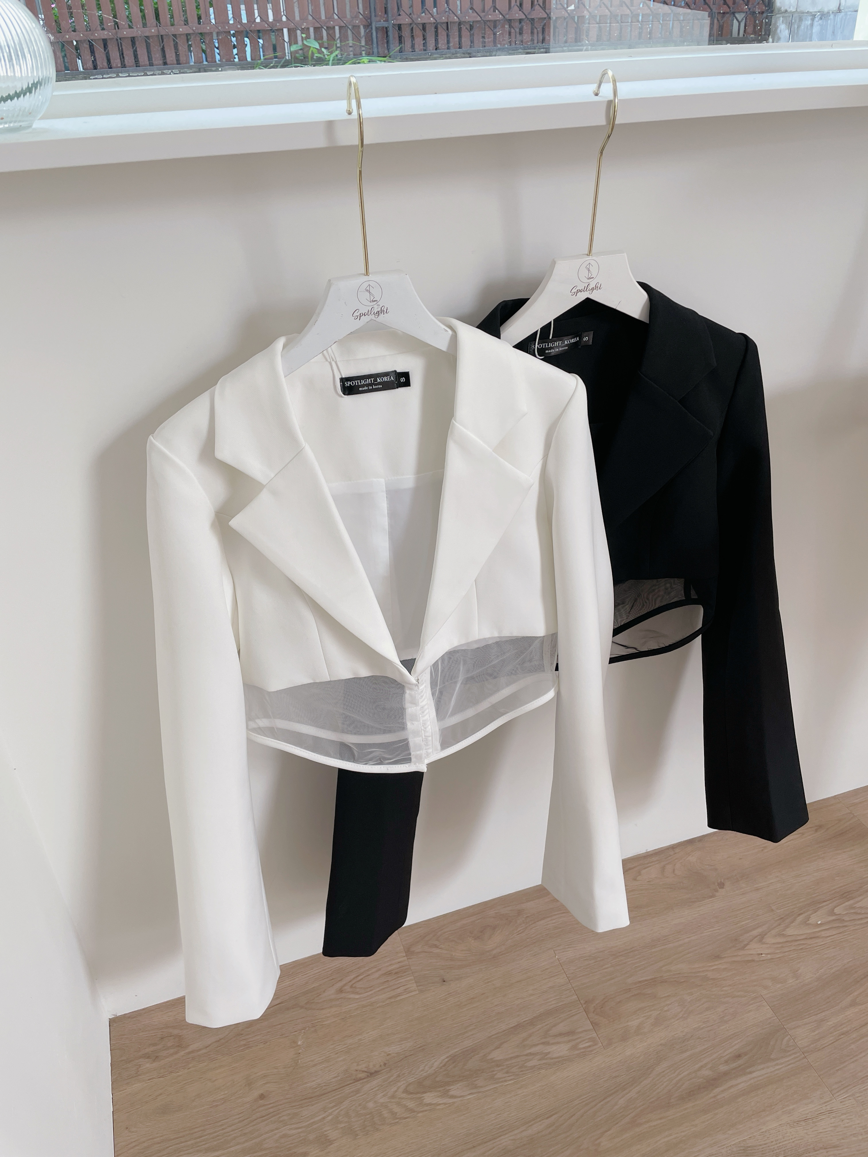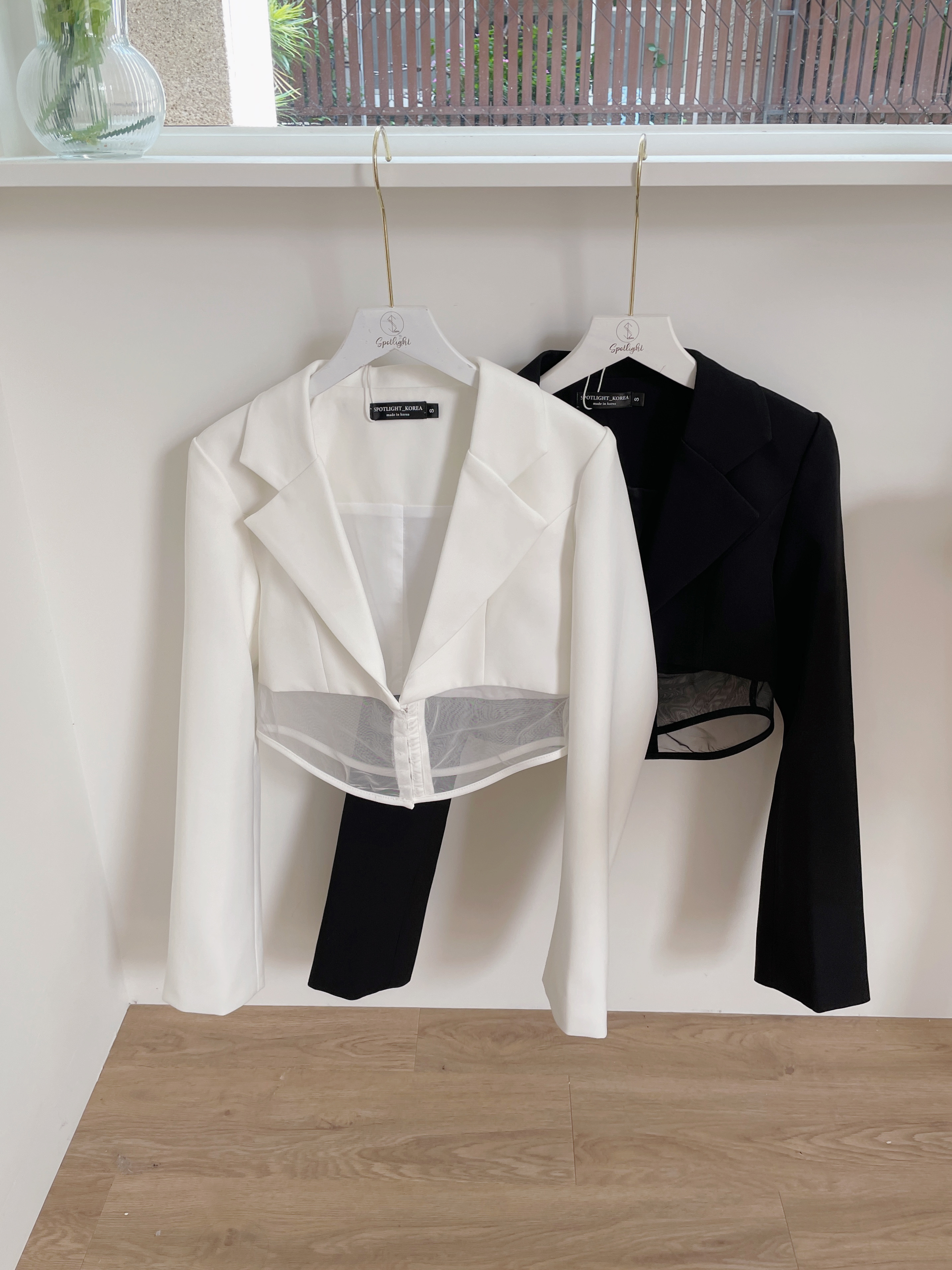 採用經典短版西裝翻領剪裁,正面下襬以弧形透紗結合勾釦細節設計,於俐落線條中增添精緻層次,呈現兼具質感與風格的正式造型。