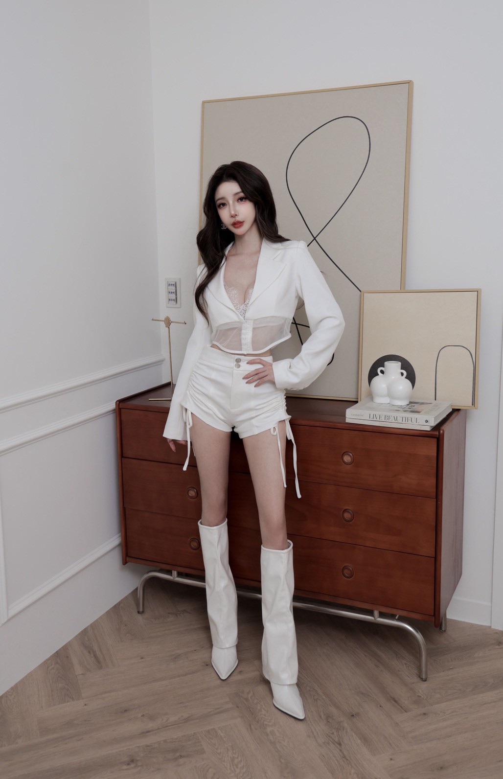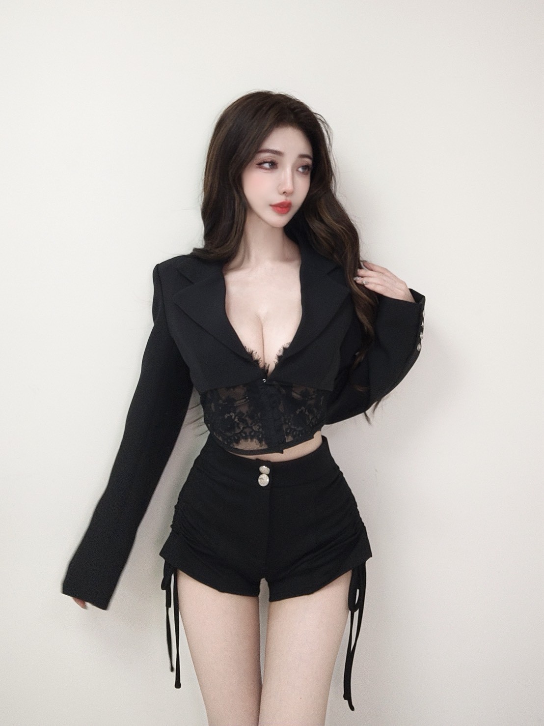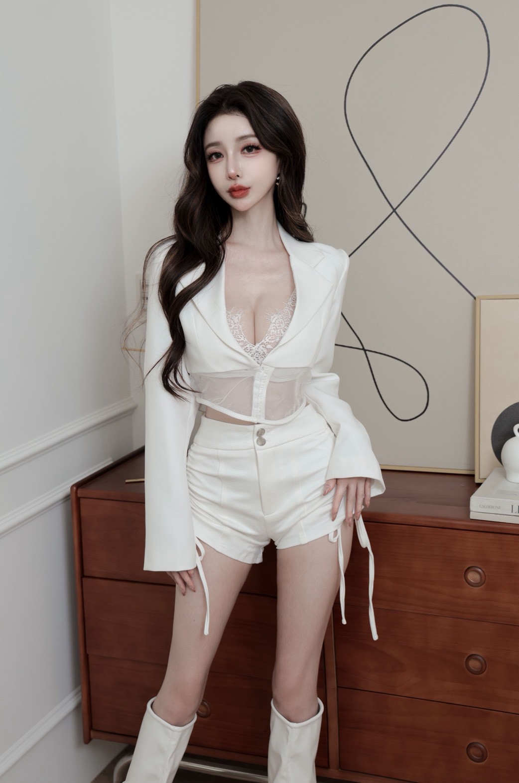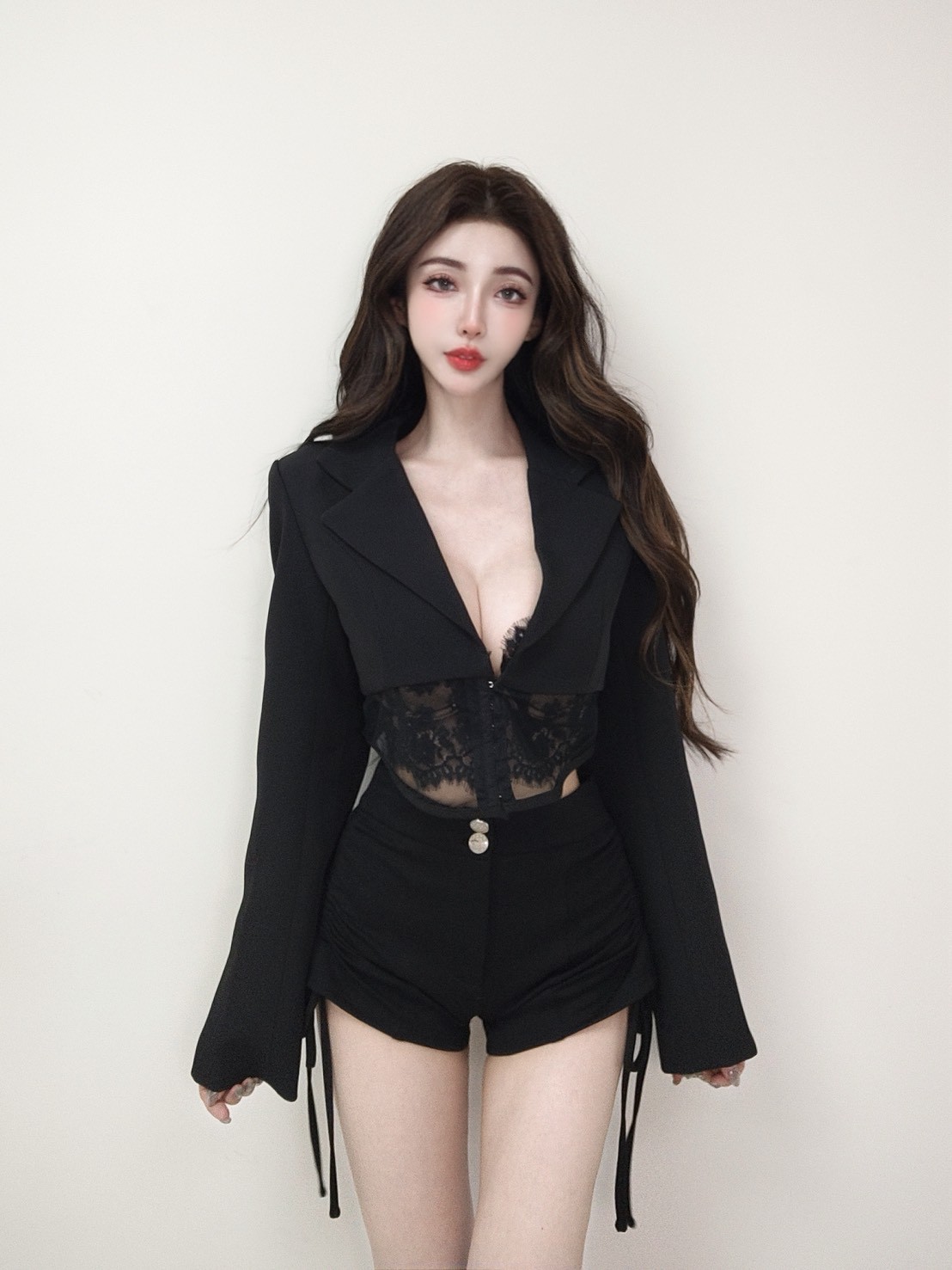 採用經典短版西裝翻領剪裁,正面下襬以弧形透紗結合勾釦細節設計,於俐落線條中增添精緻層次,呈現兼具質感與風格的正式造型。