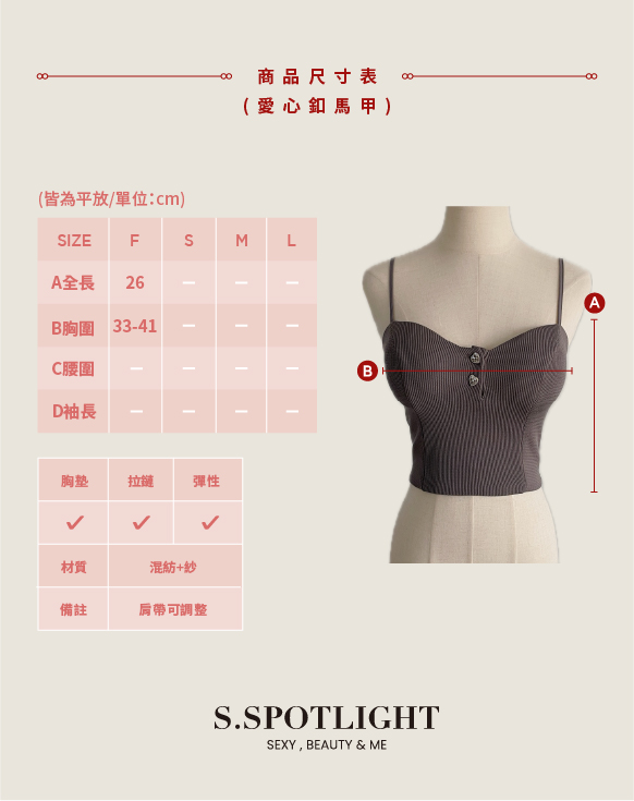 馬甲| 混紡彈性面料包覆身形,修飾曲線。肩帶可調,附胸墊設計穩定包覆;中間菱格紋愛心銀釦可開釦,後拉鍊方便穿脫。