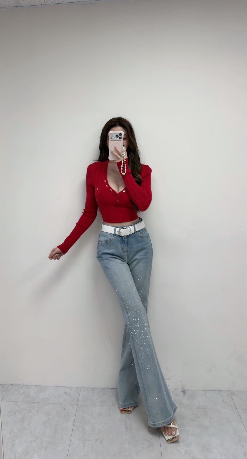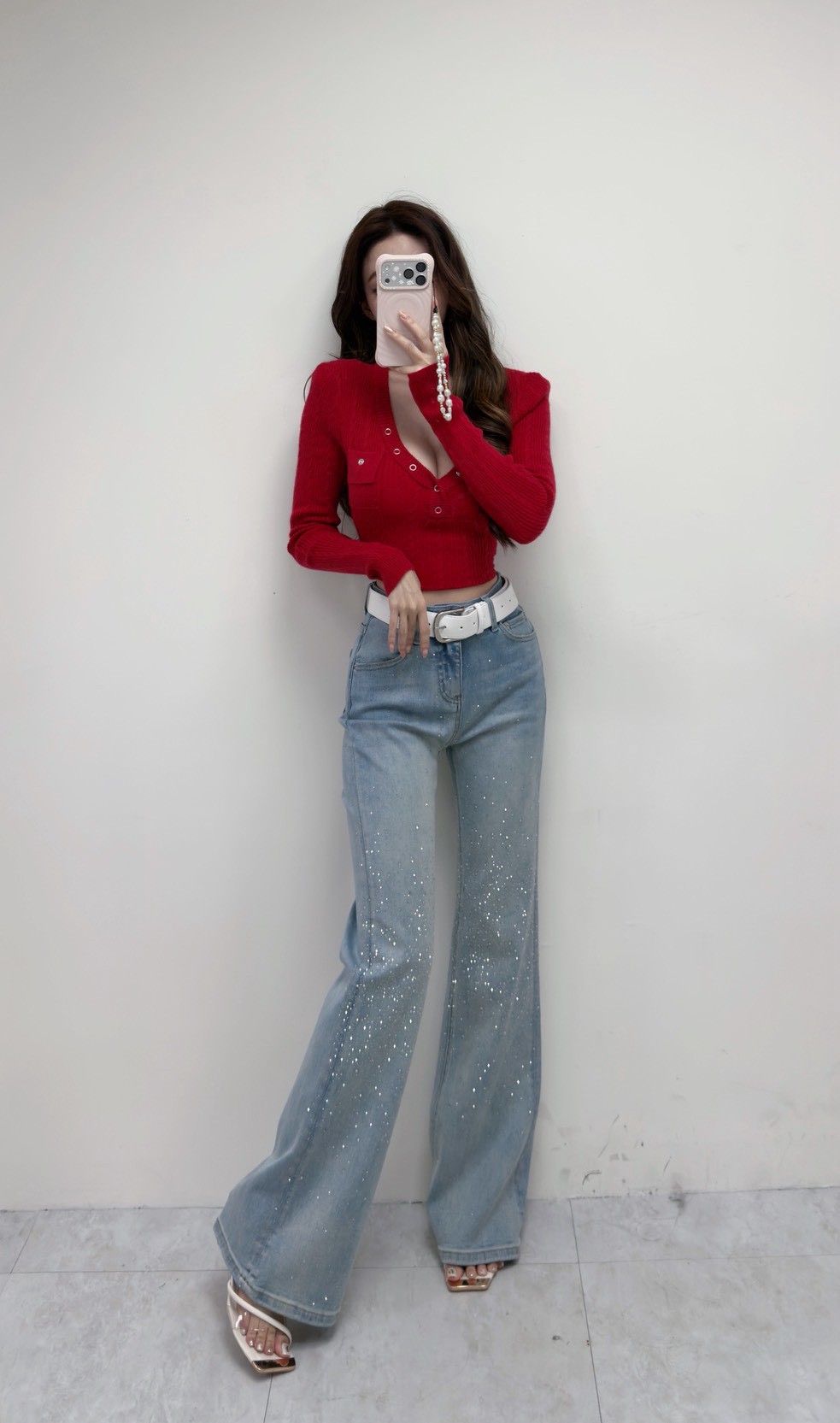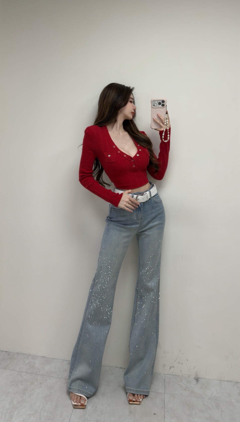 韓國亮鑽附腰帶牛仔喇叭褲