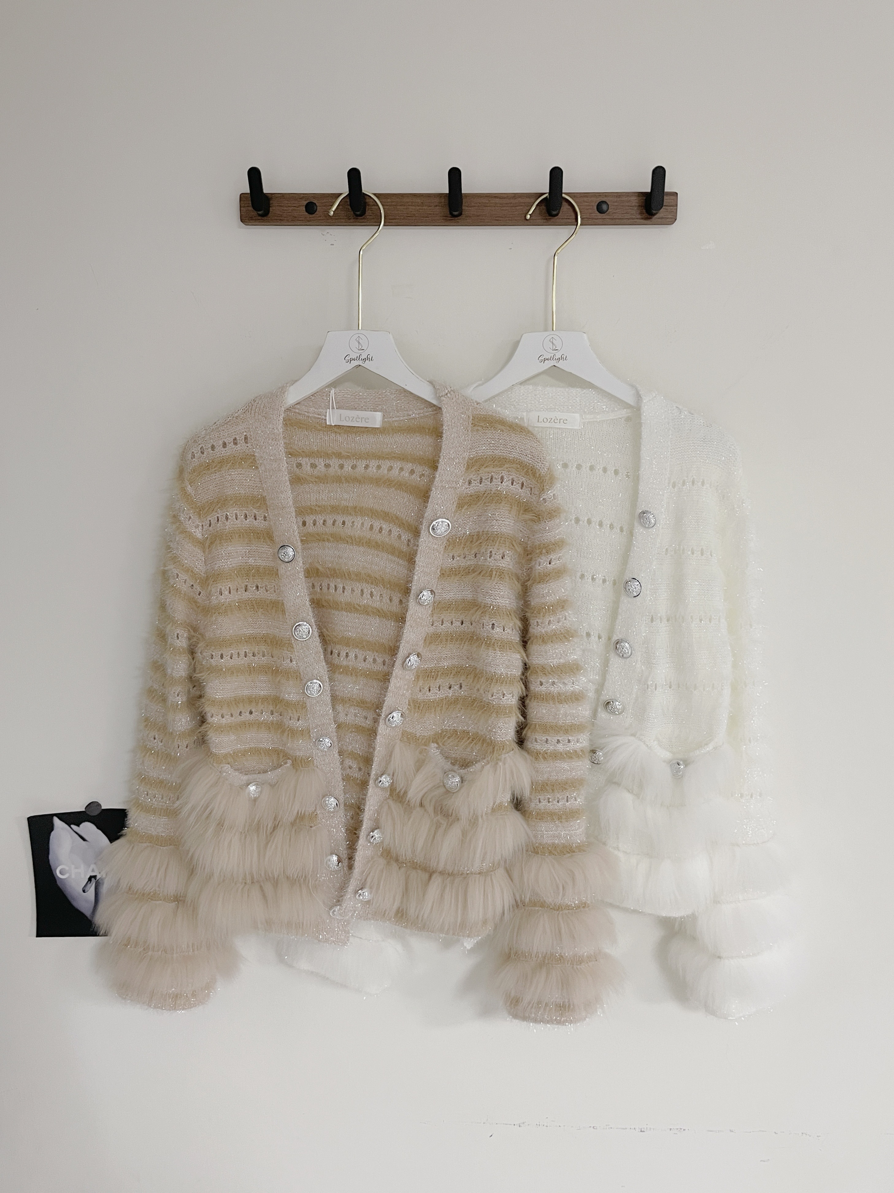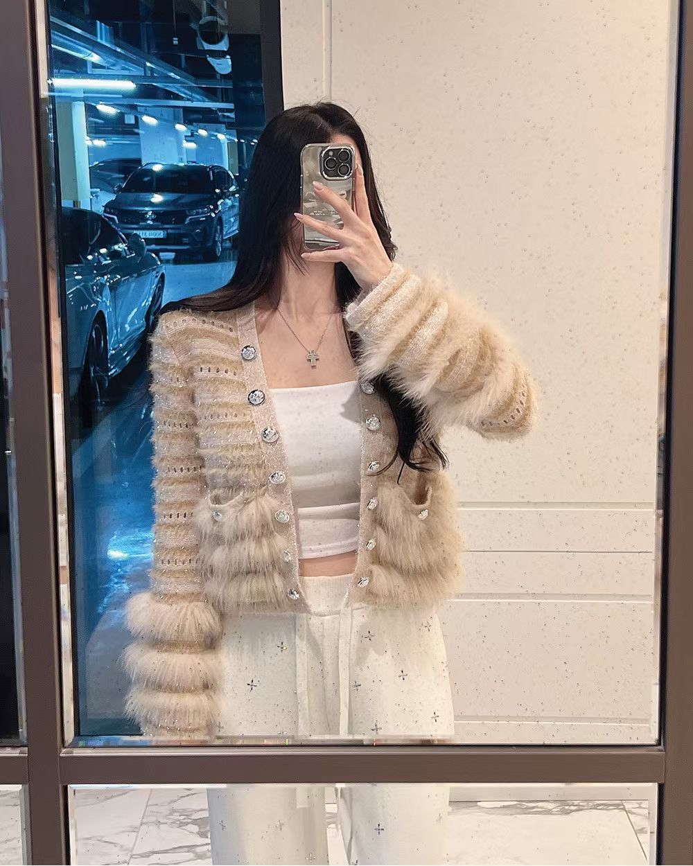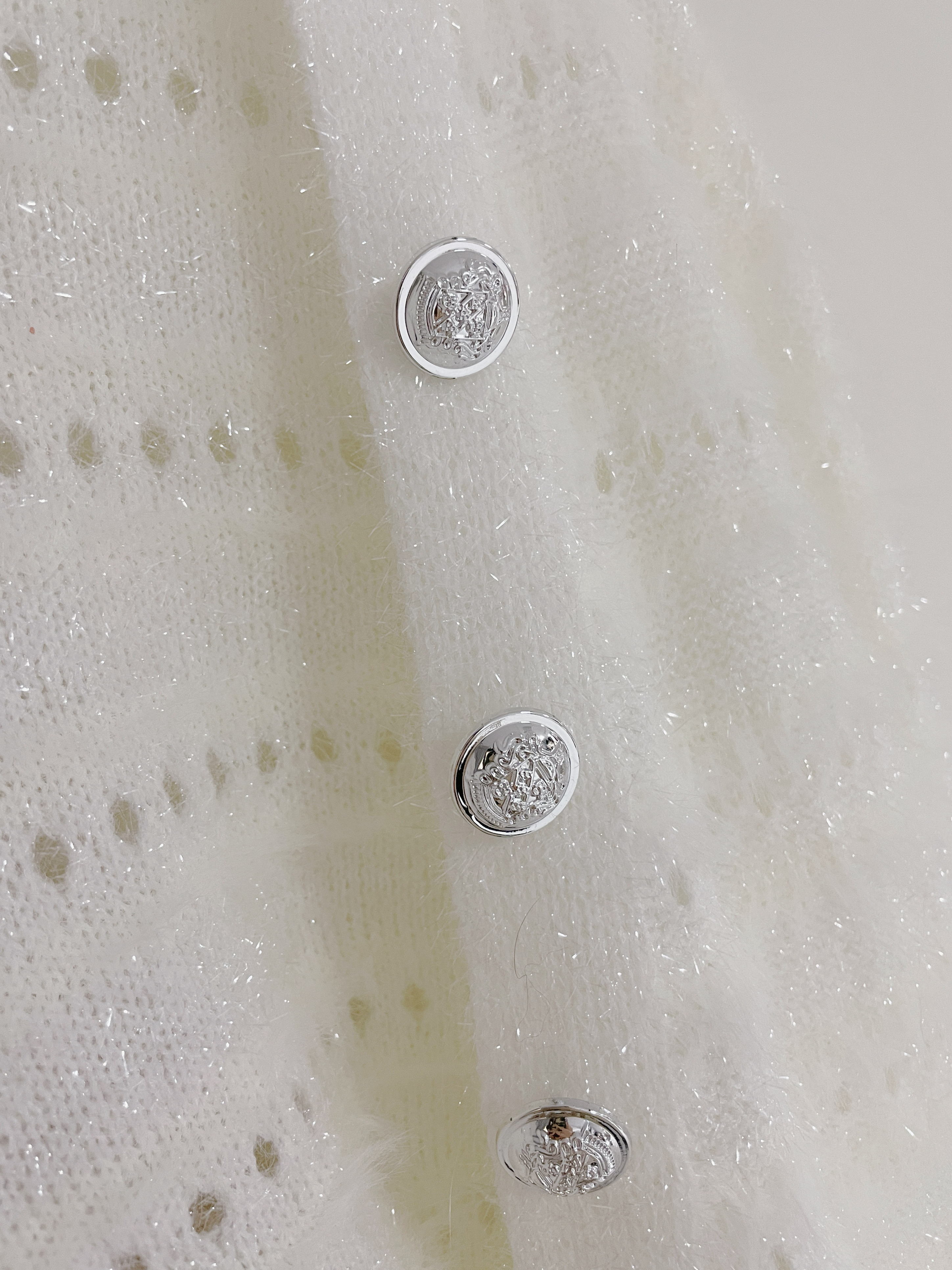 金蔥面料結合層層蓬鬆狐狸毛,呈現高級名媛質感。門襟以雕花銀釦點綴(無釦洞設計),兩側附口袋,細節精緻,整體奢華卻不失典雅。