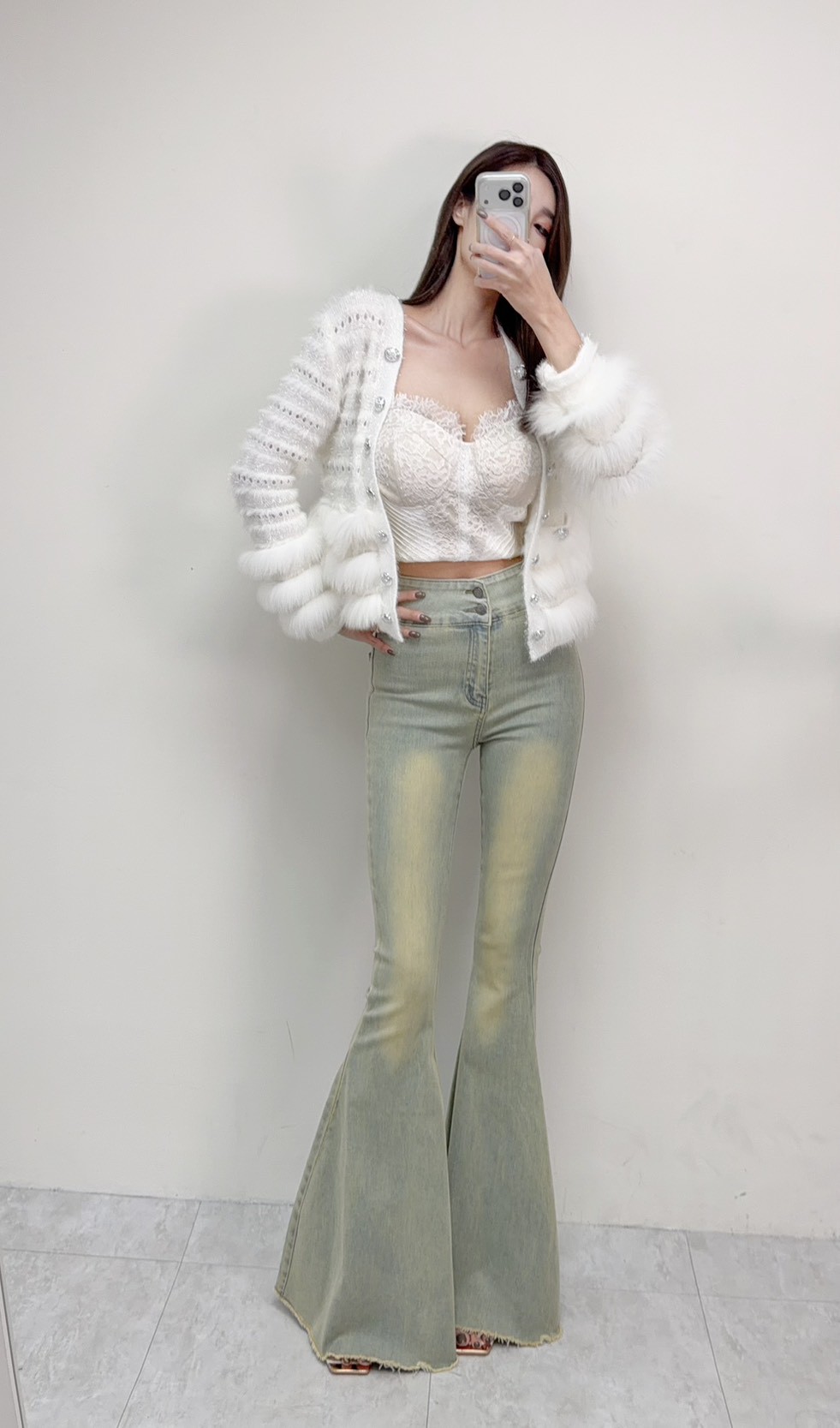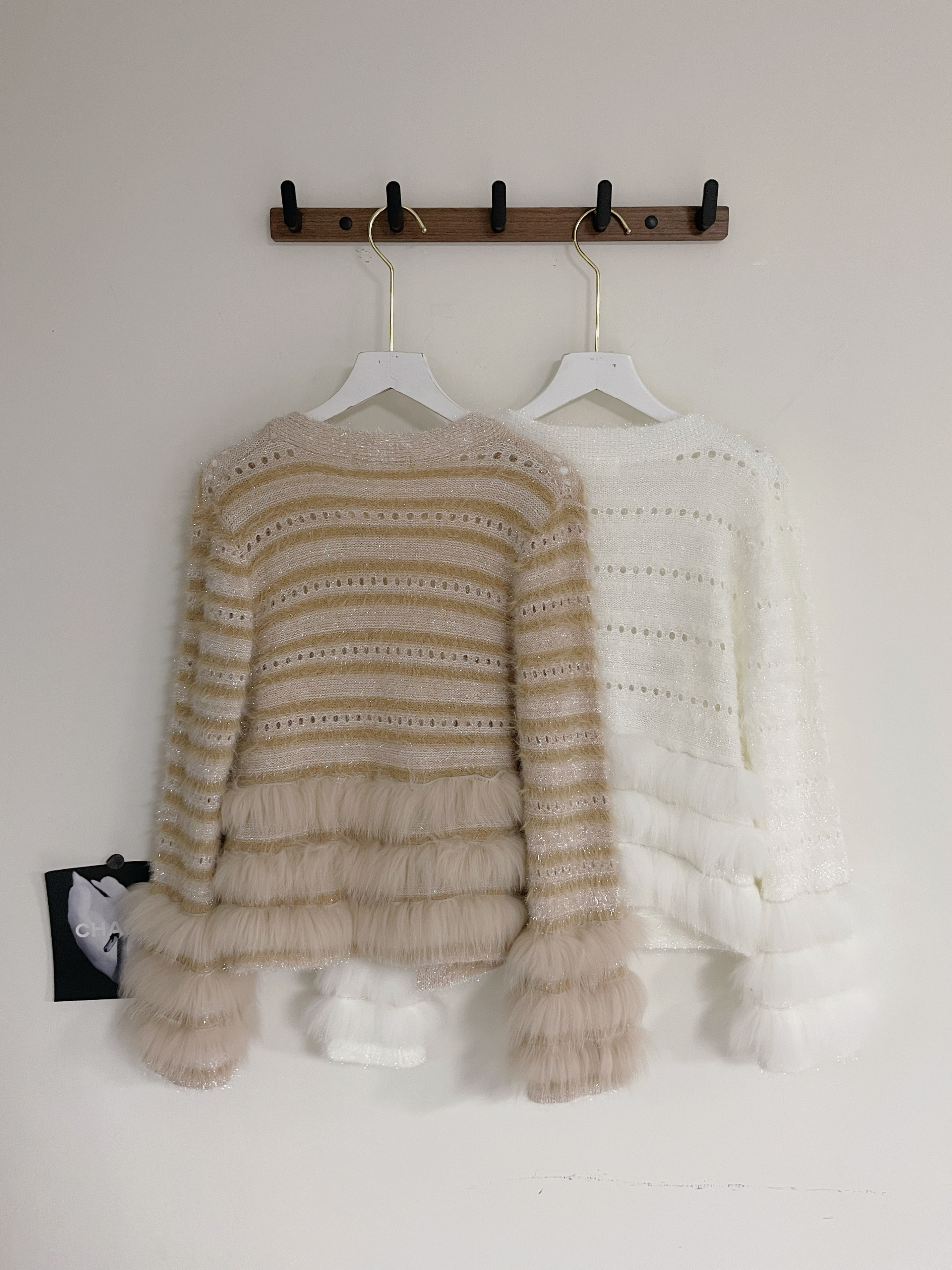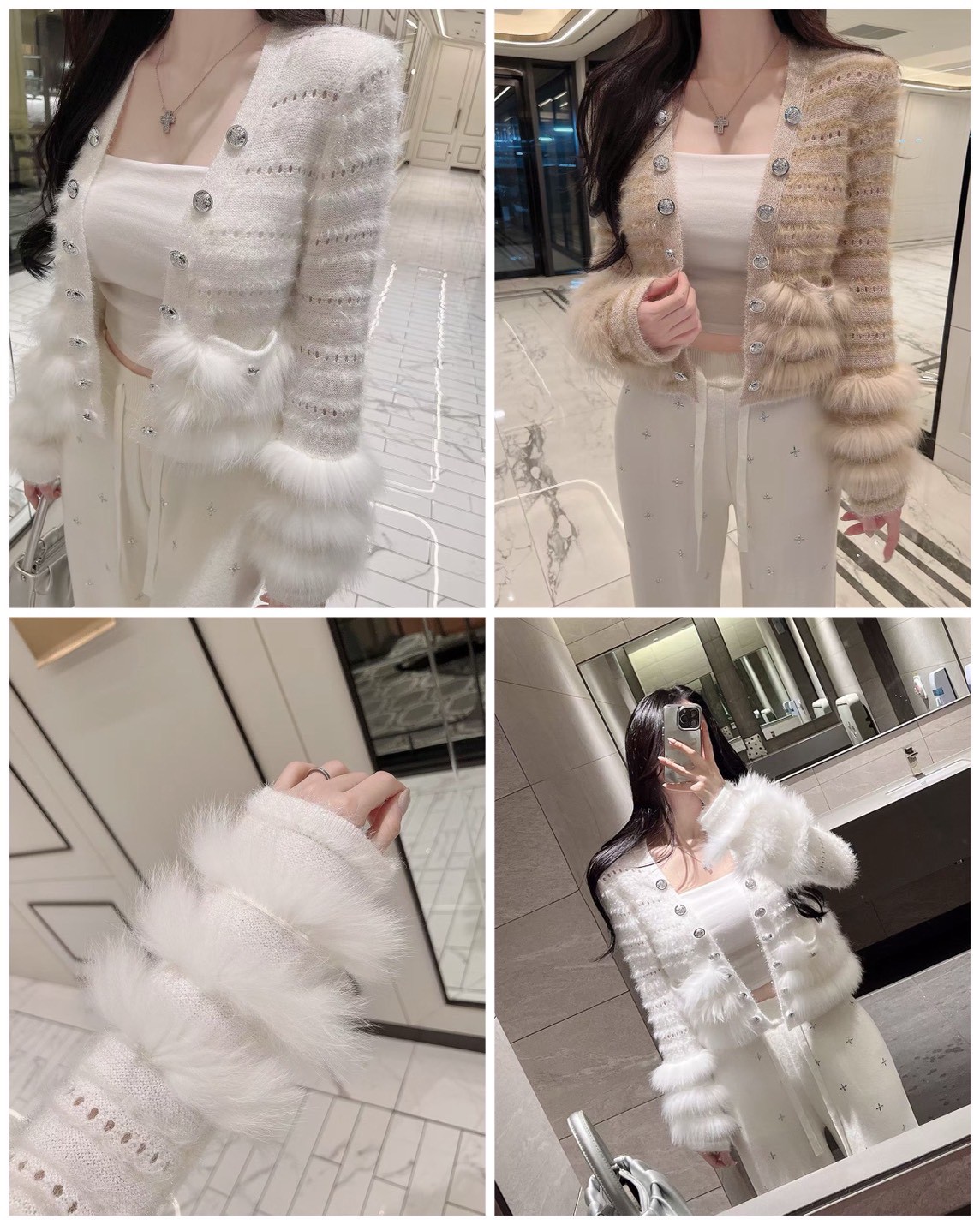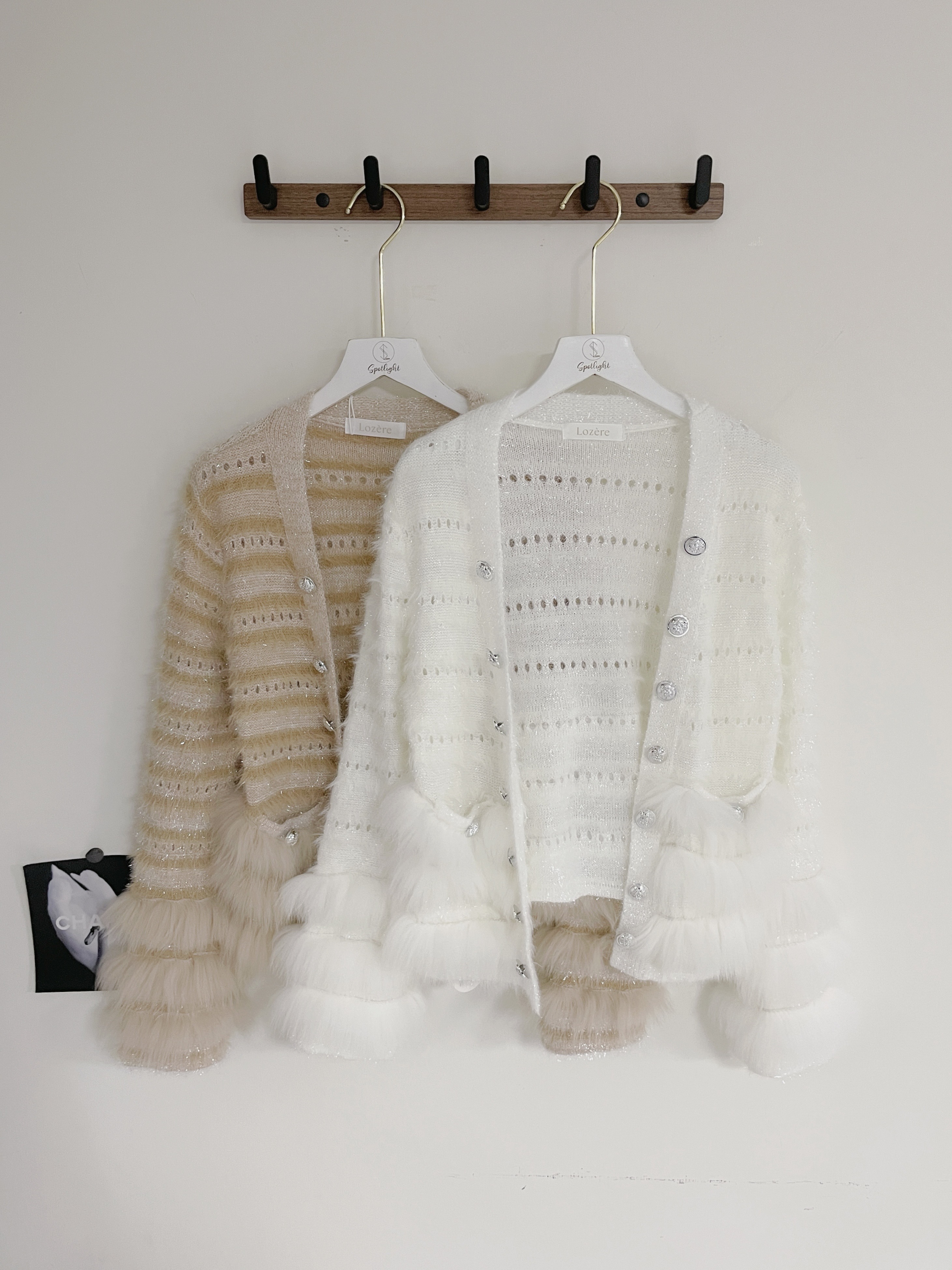金蔥面料結合層層蓬鬆狐狸毛,呈現高級名媛質感。門襟以雕花銀釦點綴(無釦洞設計),兩側附口袋,細節精緻,整體奢華卻不失典雅。