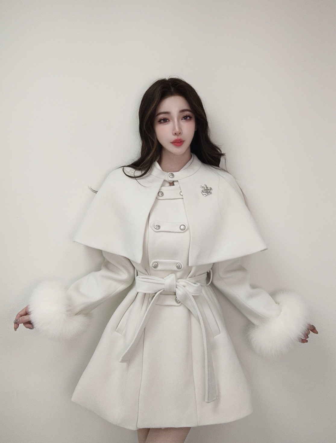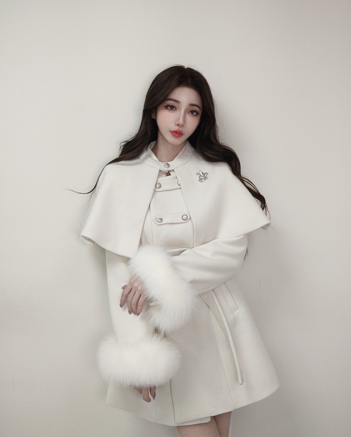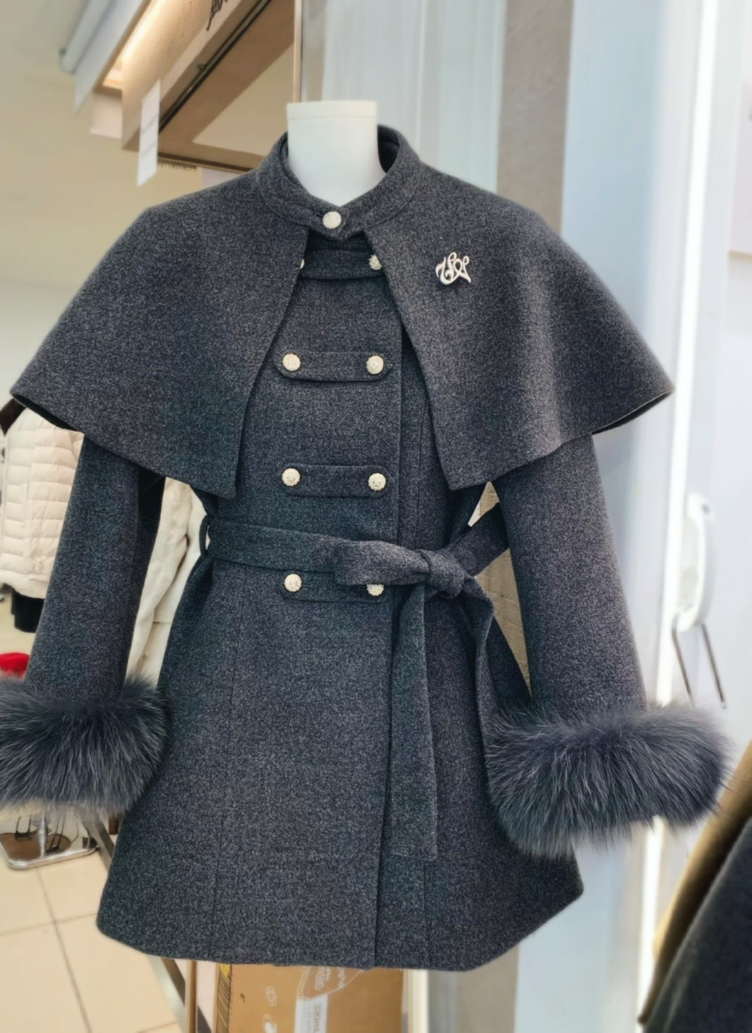 外層為可拆式斗篷設計,內層採中間雙排盤釦與立領剪裁,展現典雅復古的風格。手袖以蓬鬆毛毛裝飾並可自由拆卸,搭配可拆式造型別針,細節豐富多變。腰部附綁帶,可修飾身形線條。內裡含鋪棉設計,兼具保暖與造型感,整體呈現高質感的冬季名媛氛圍💗