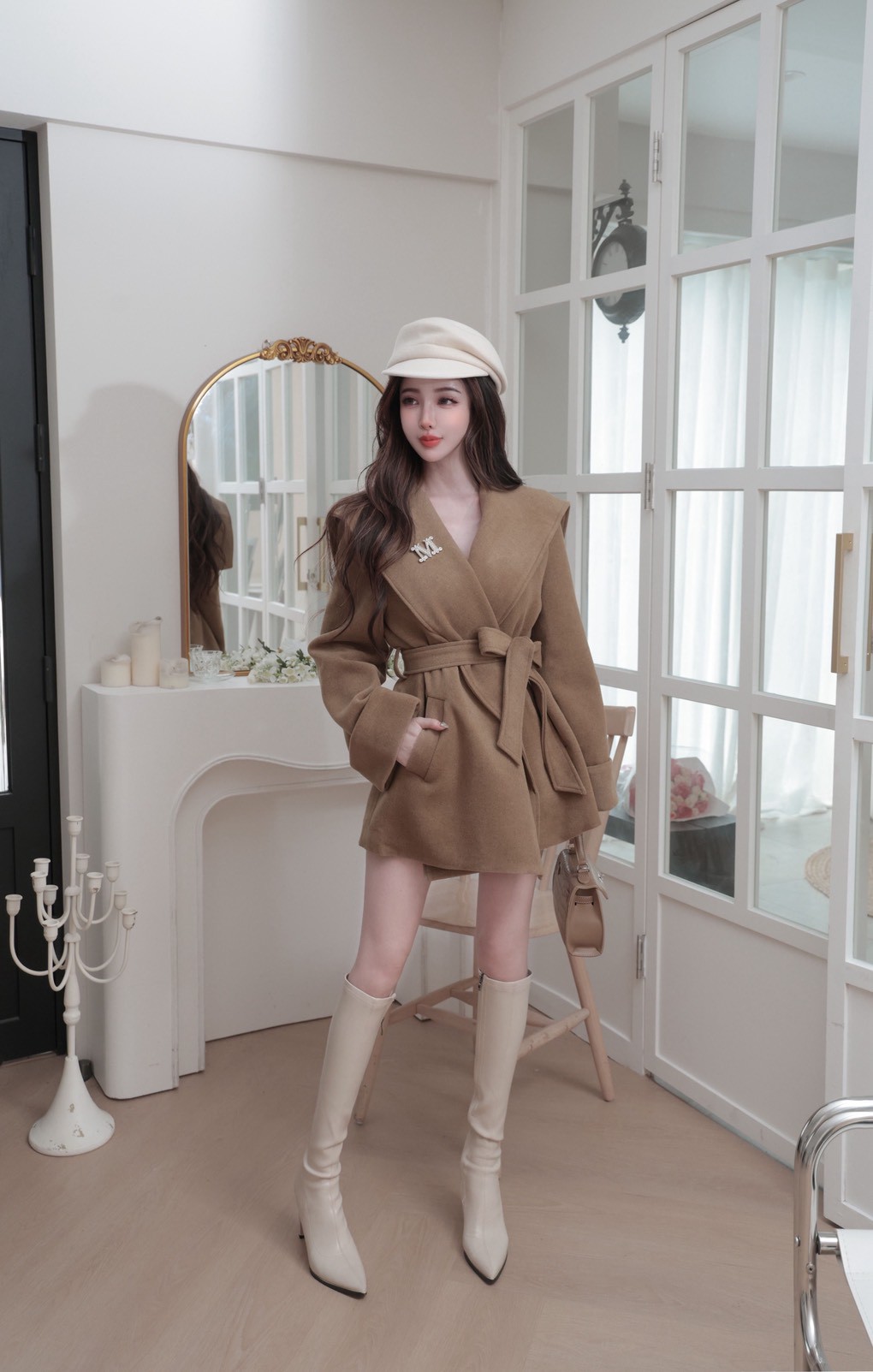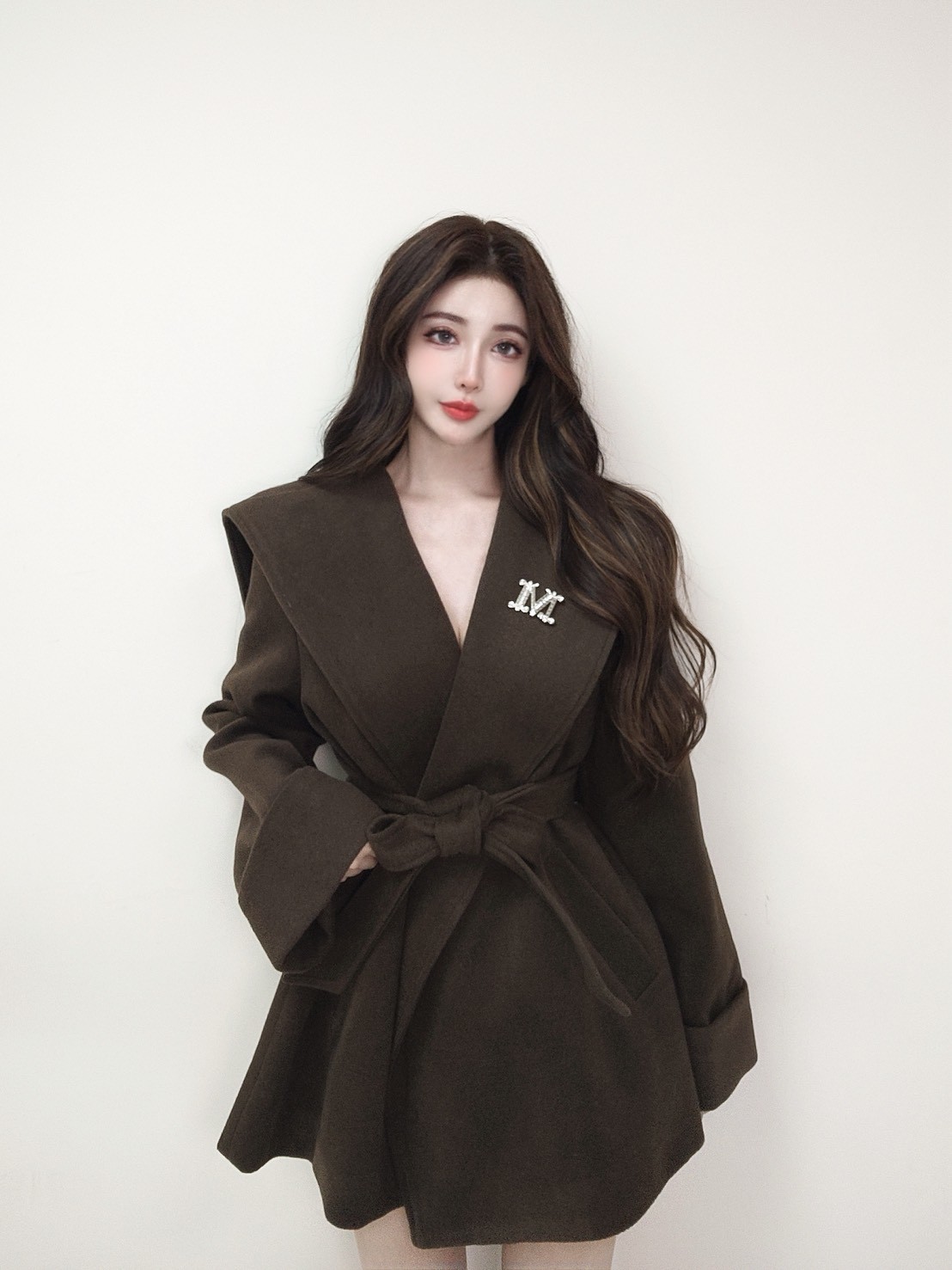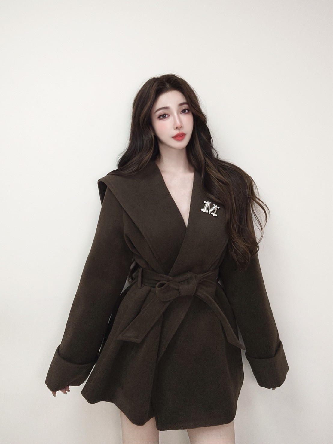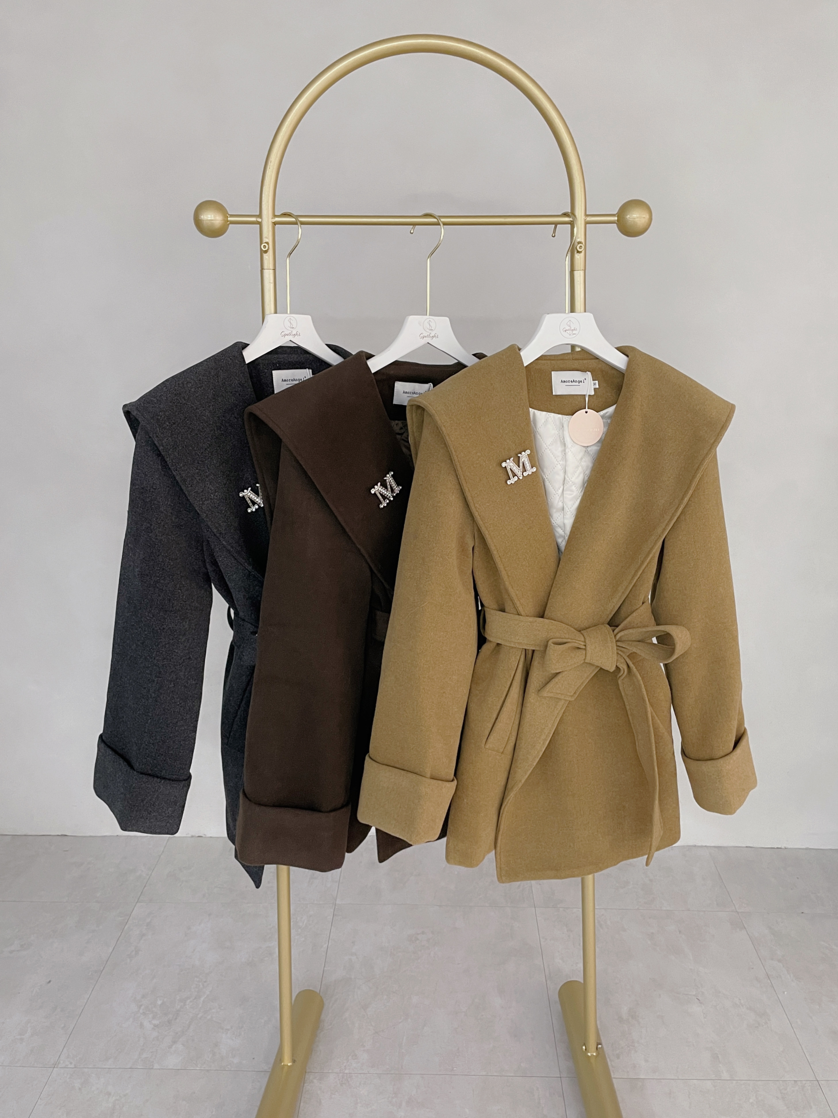 韓國毛呢內鋪棉字母鑽附腰帶風衣外套