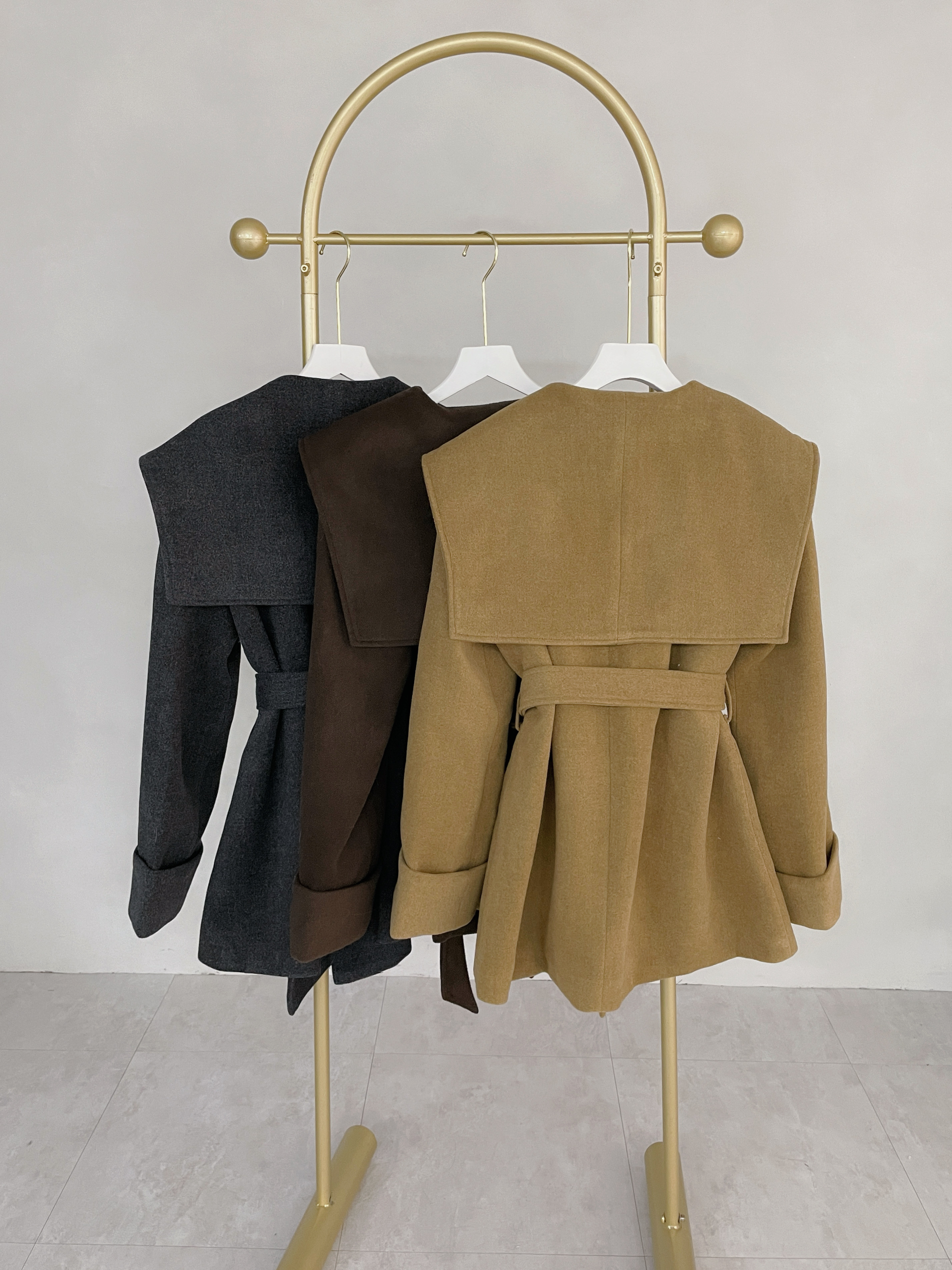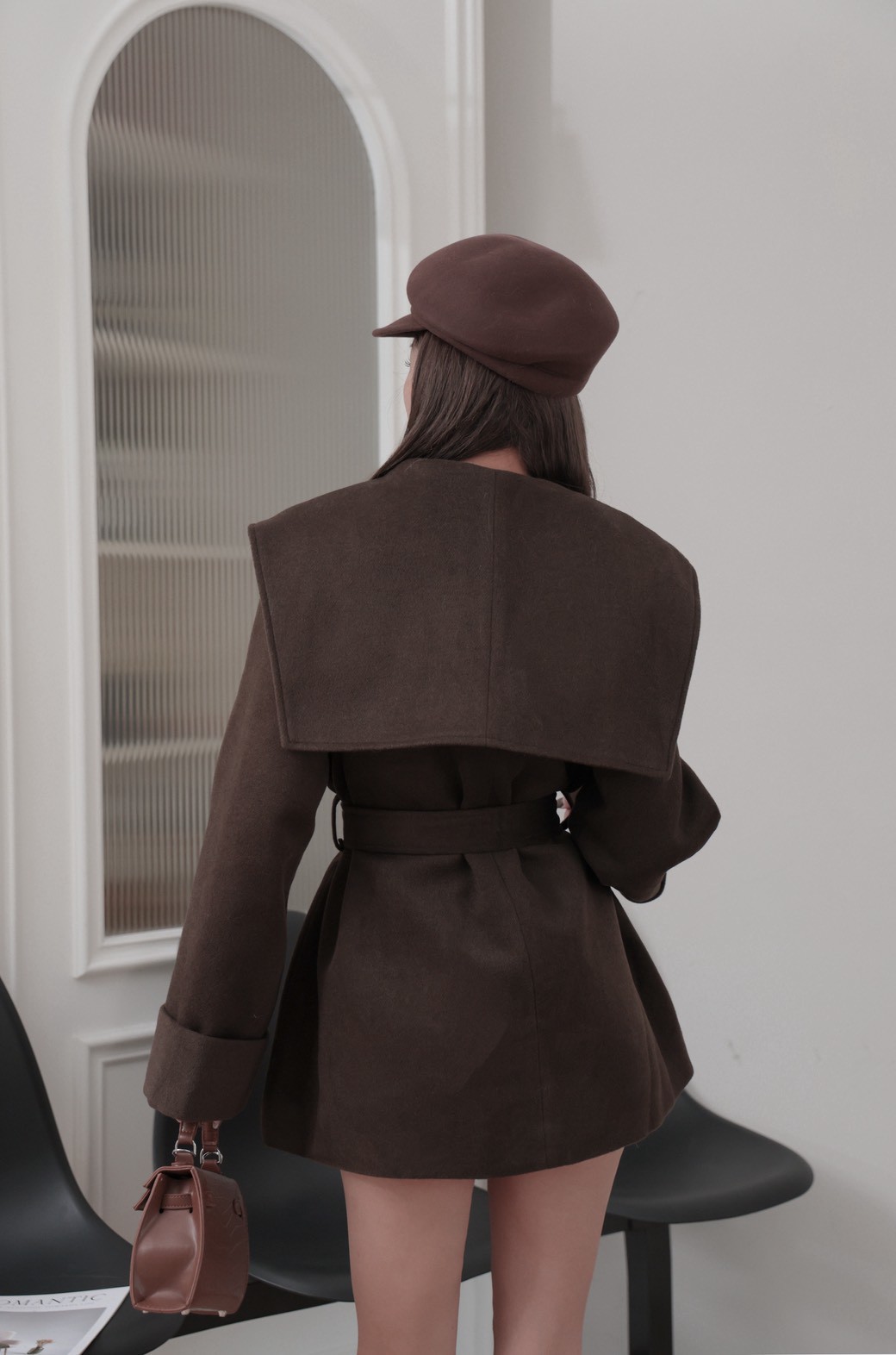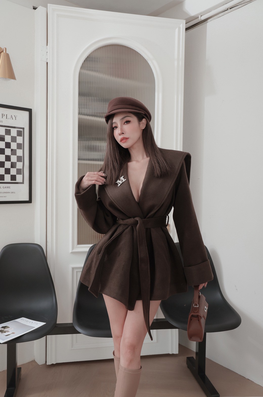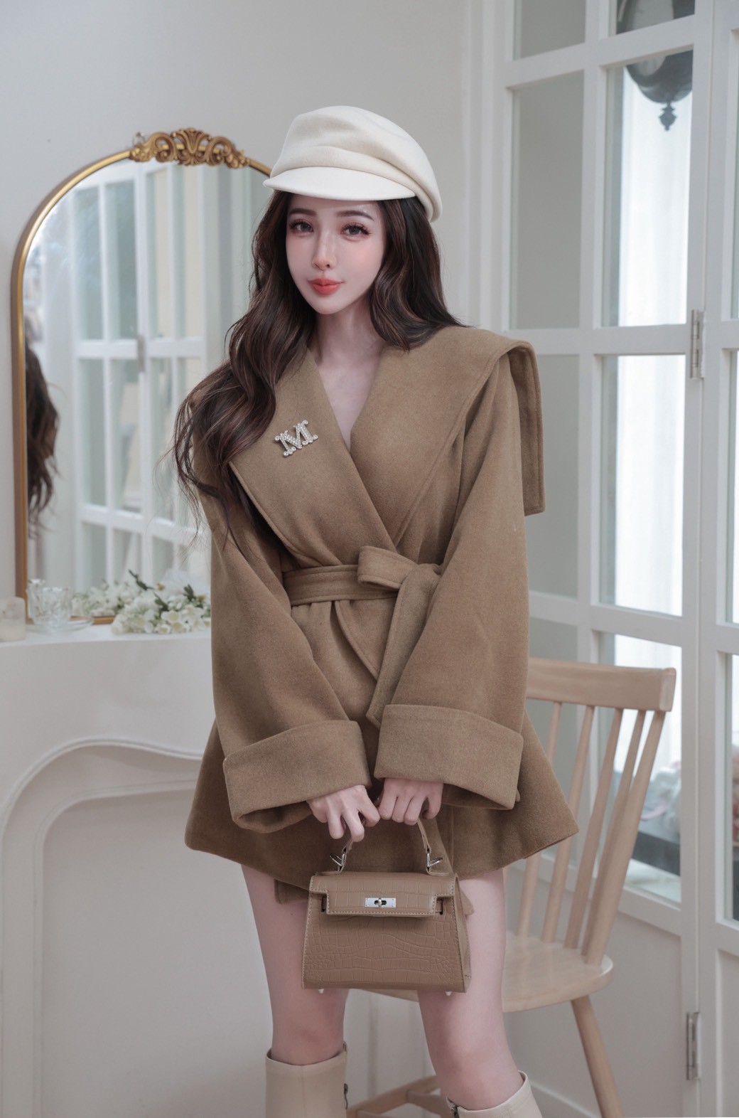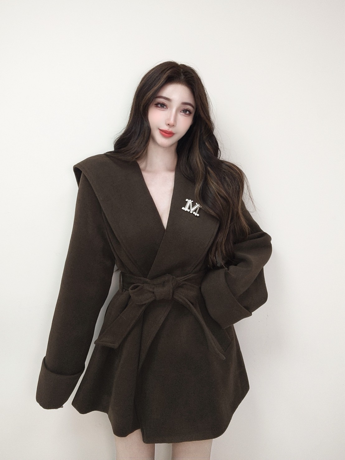 韓國毛呢內鋪棉字母鑽附腰帶風衣外套