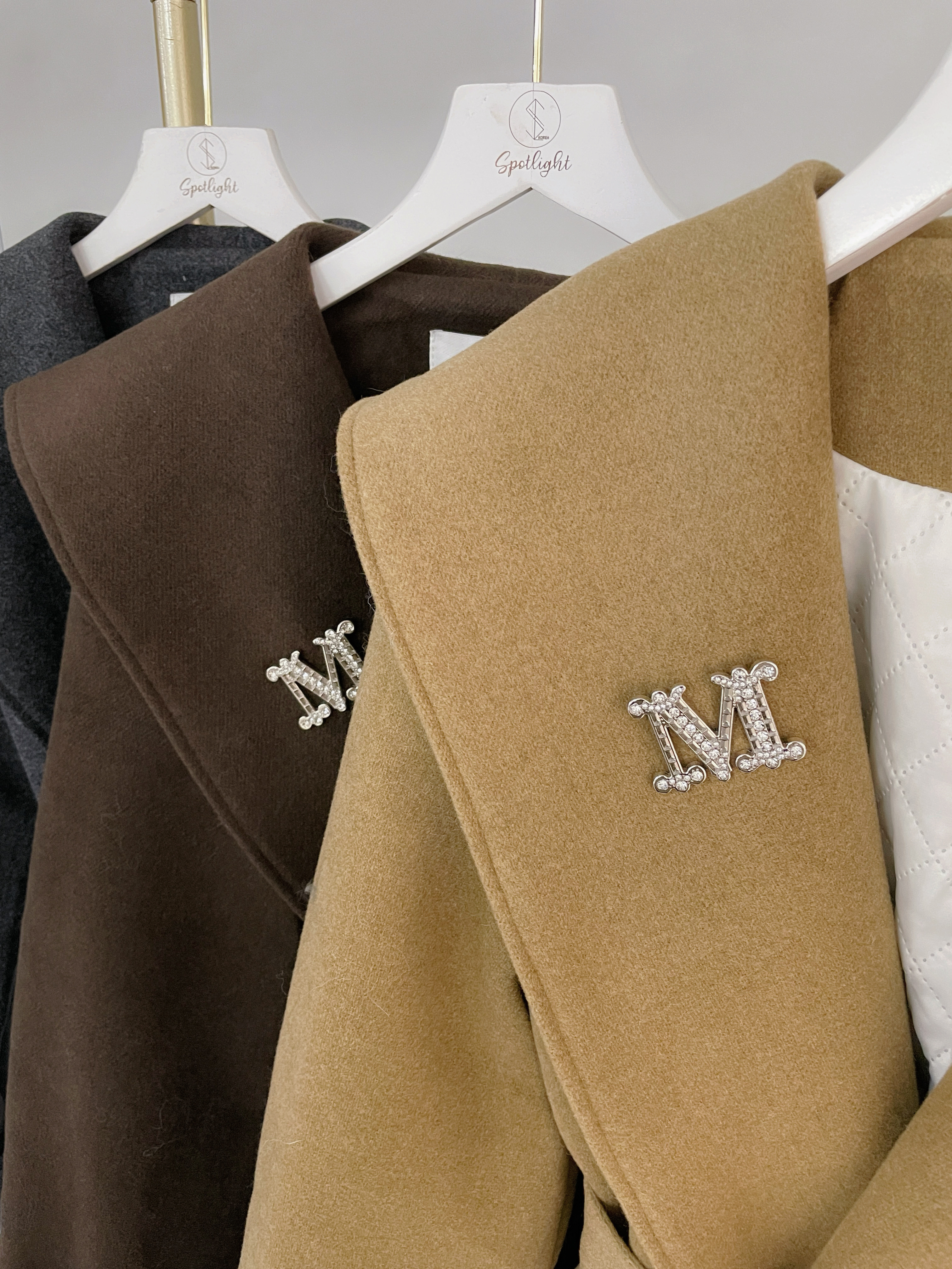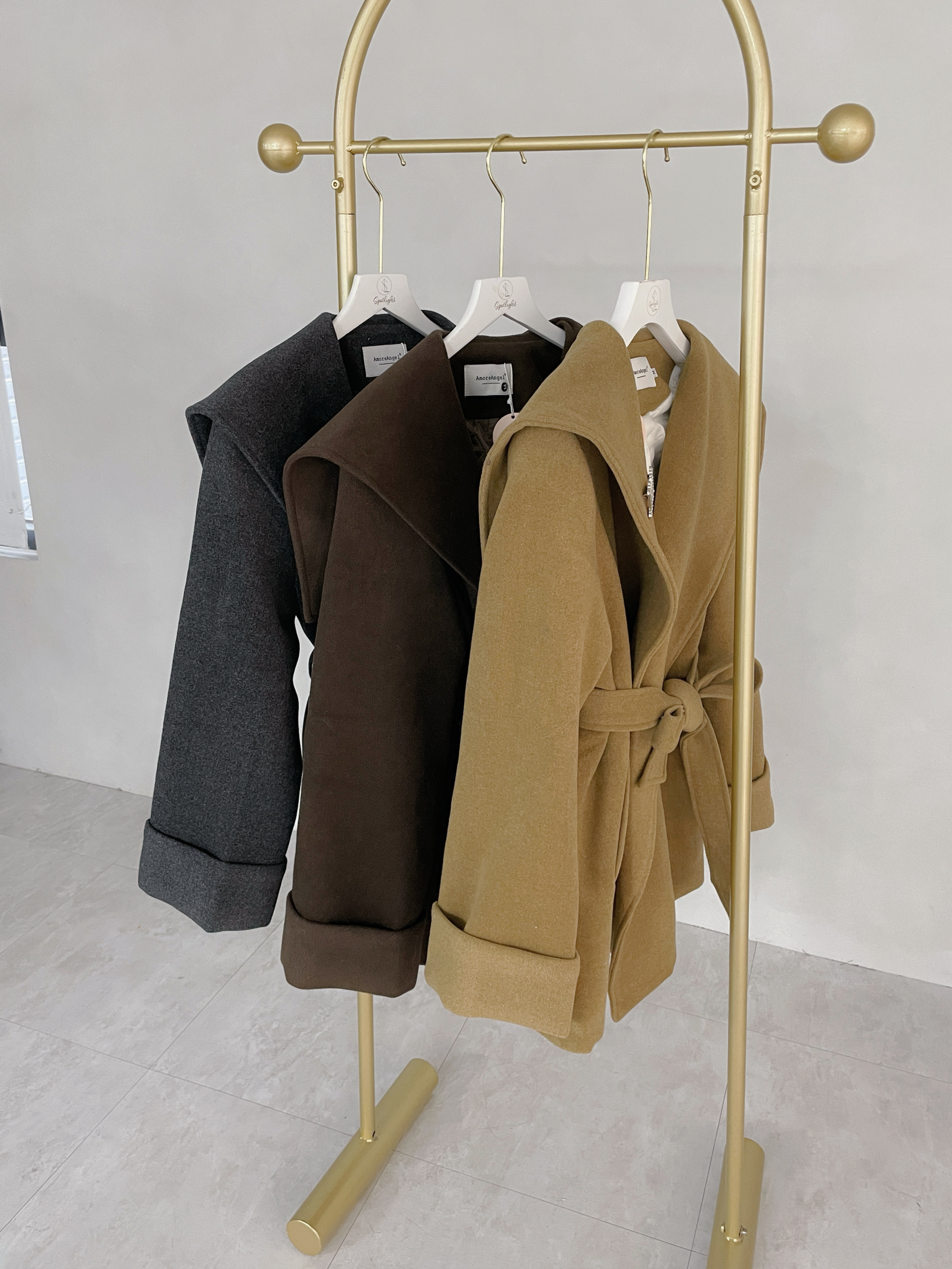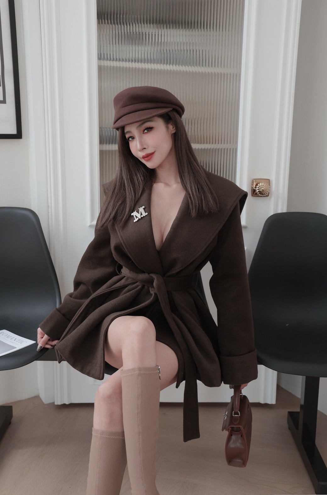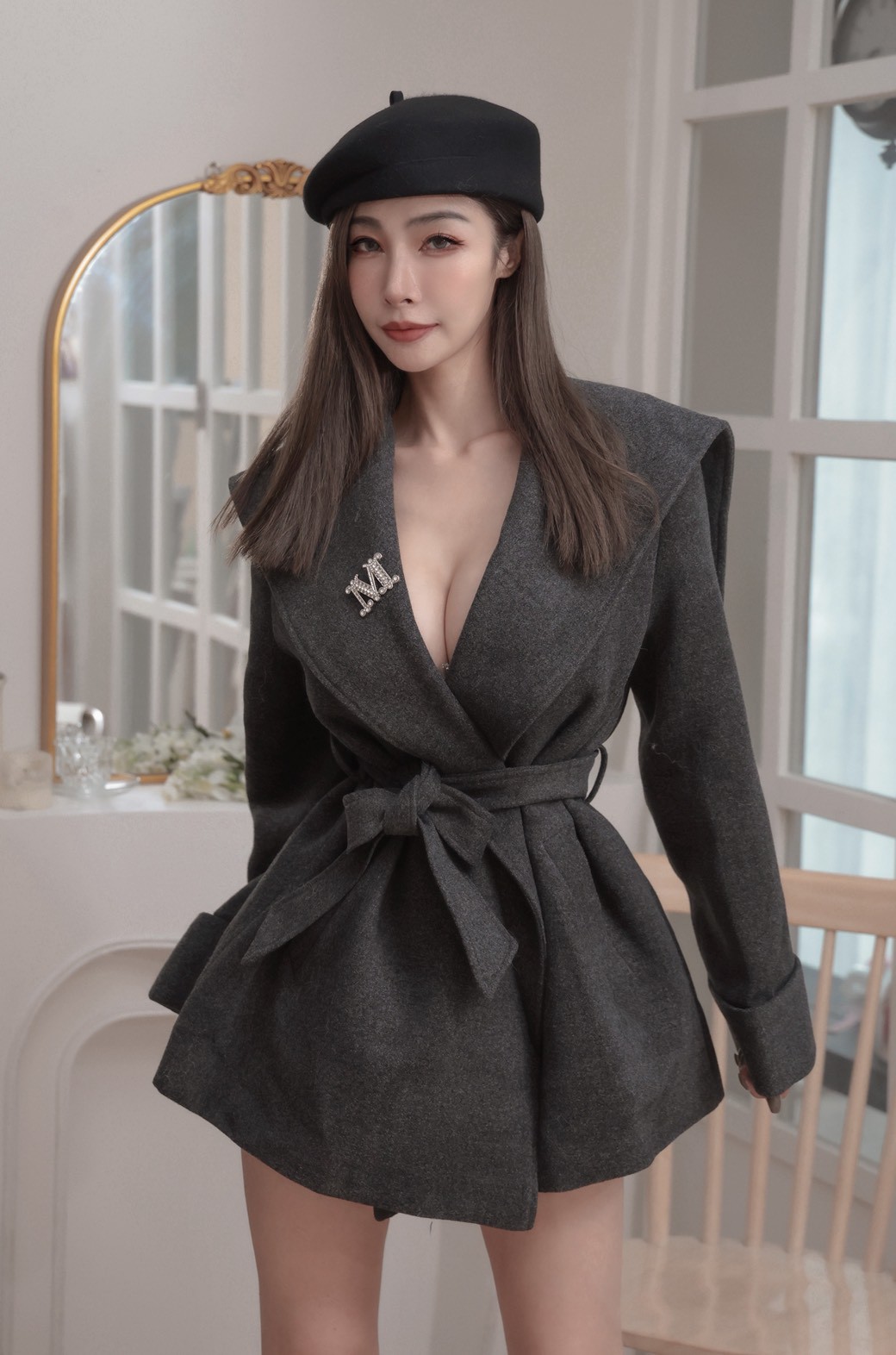 韓國毛呢內鋪棉字母鑽附腰帶風衣外套