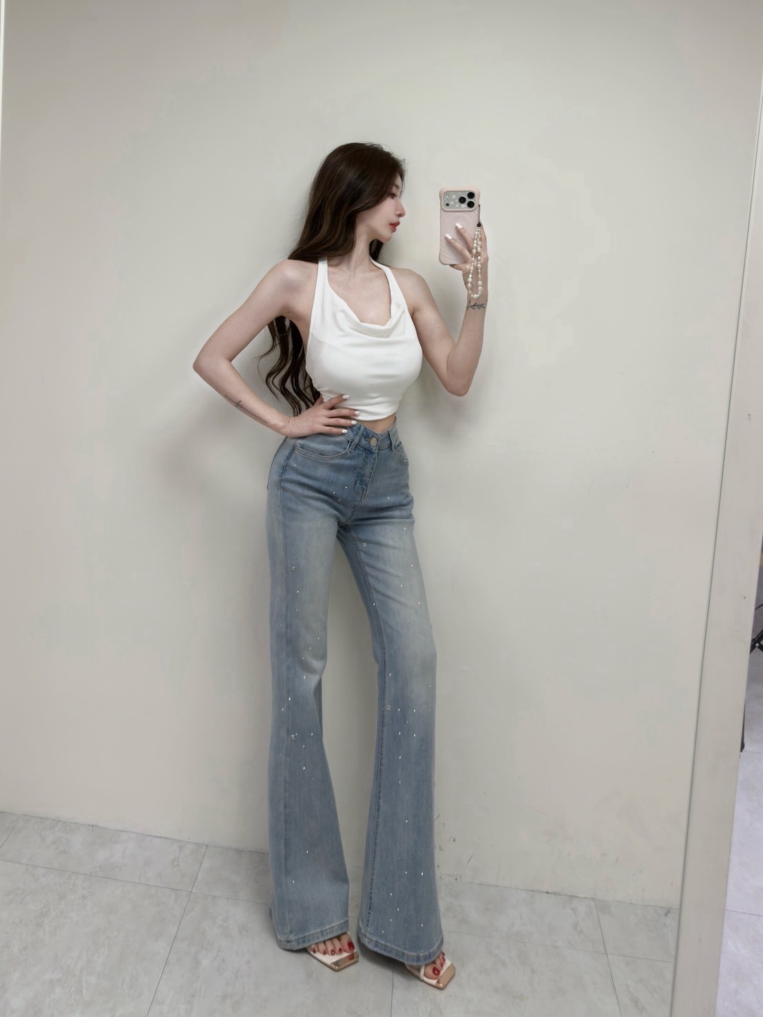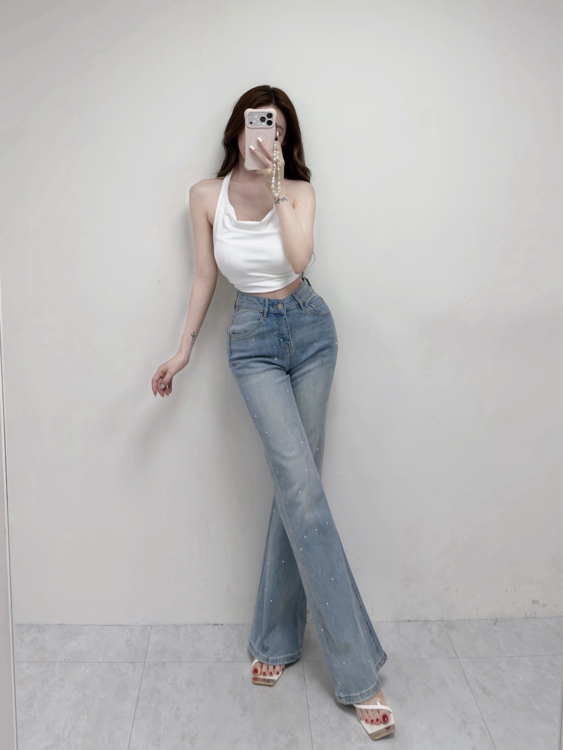 韓國精緻小香造型鑽亮牛仔喇叭褲