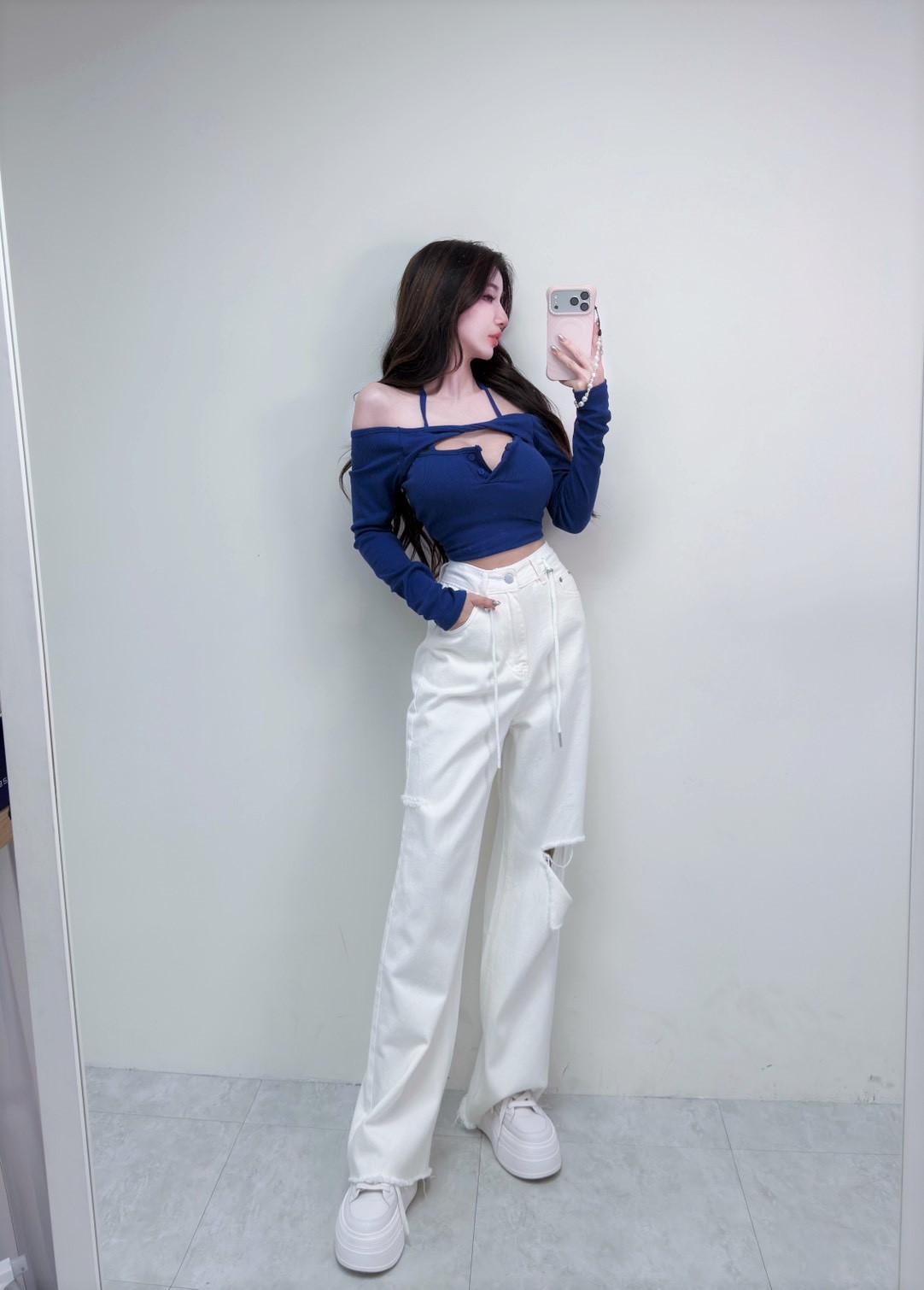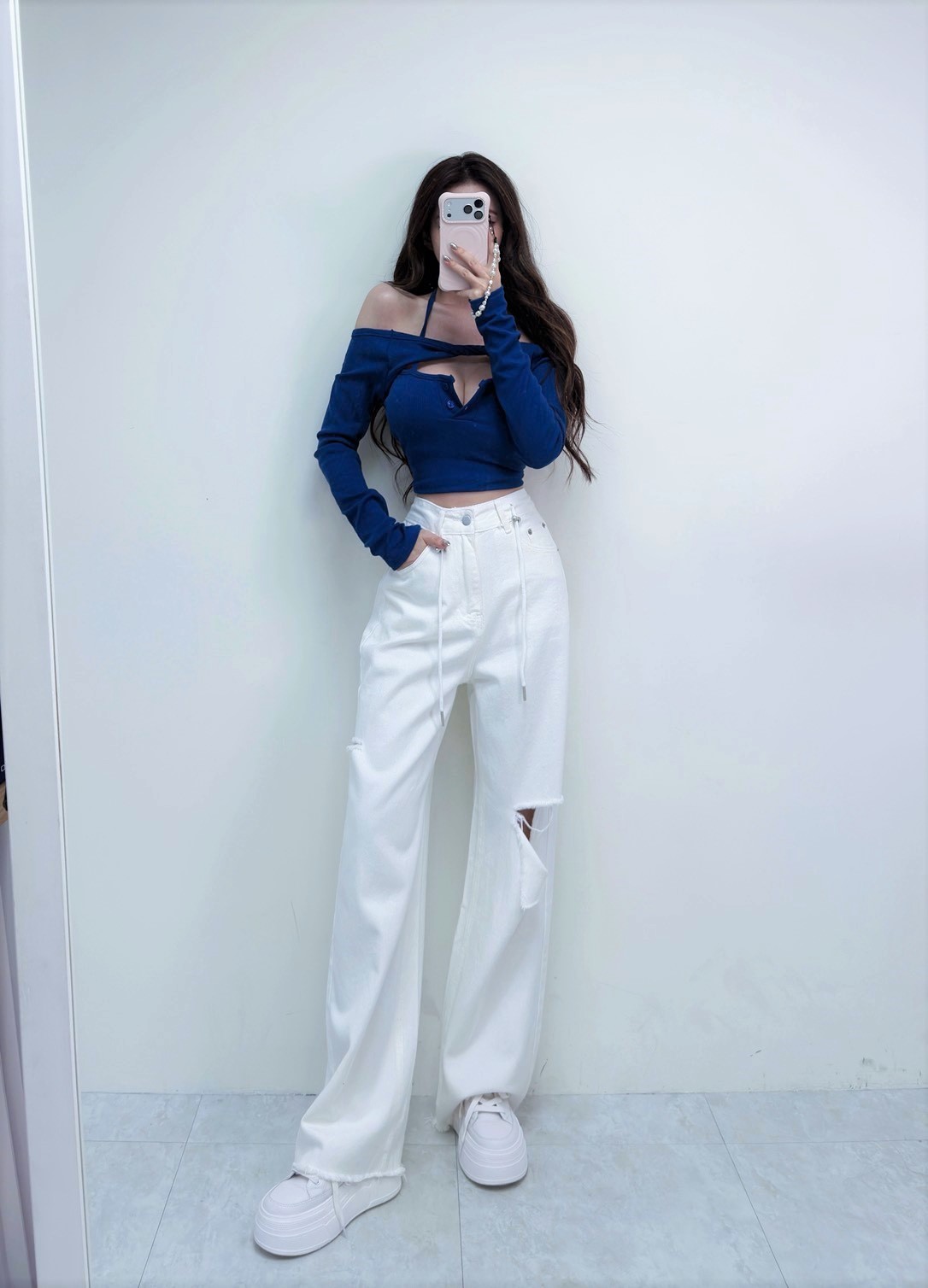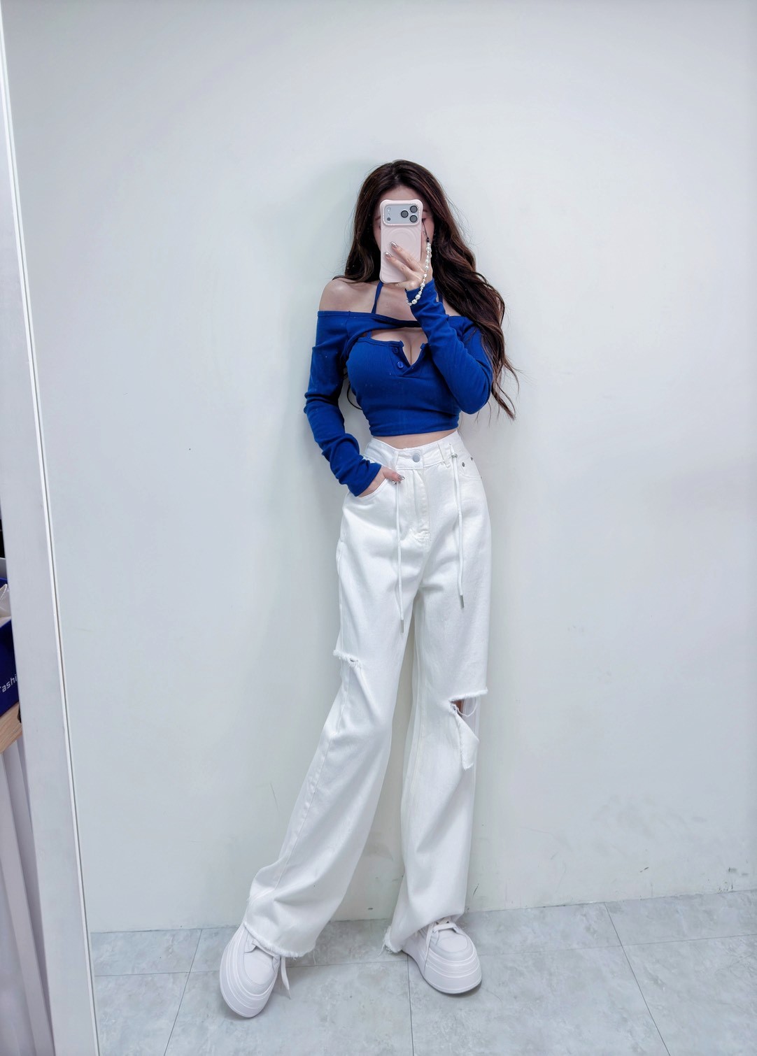 韓國銀色腰鎖釦刷破直筒牛仔寬褲