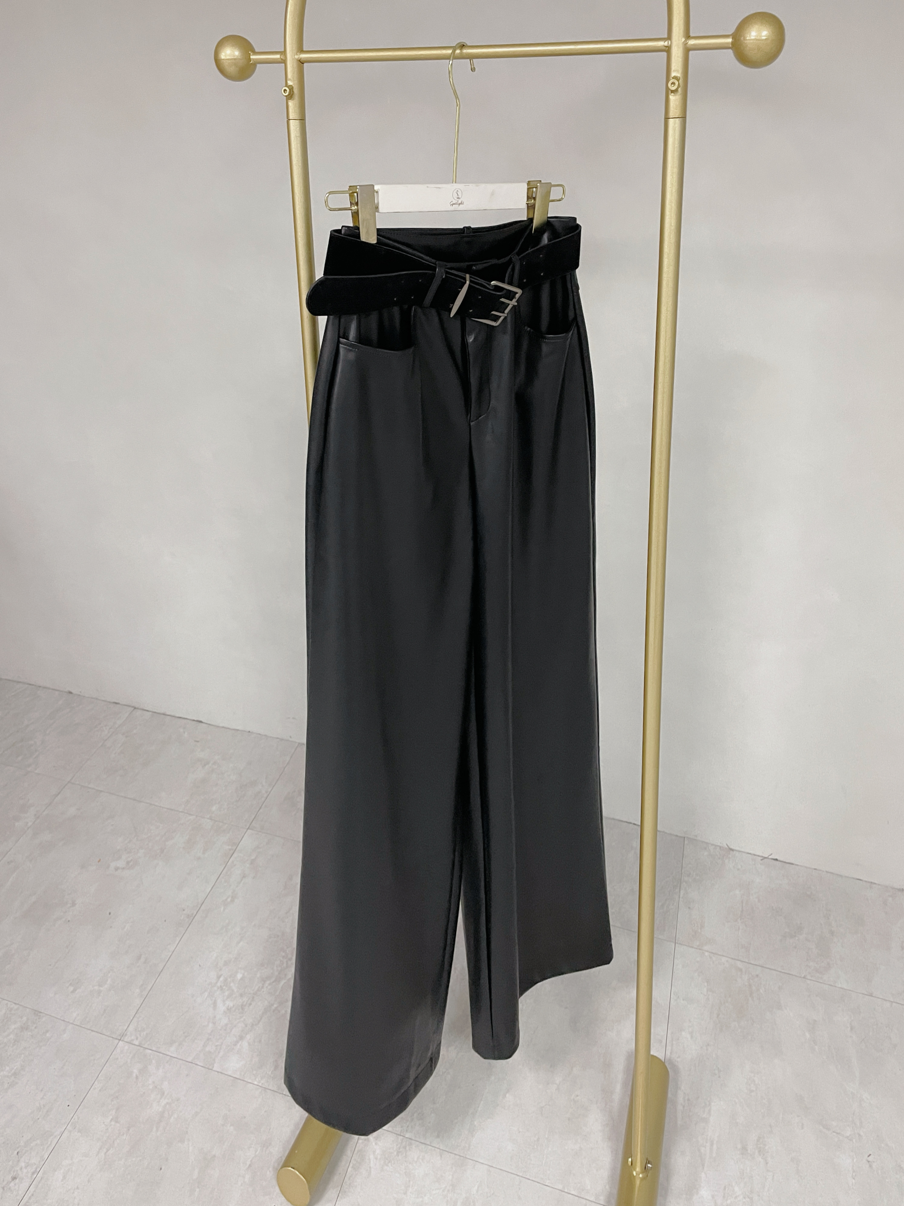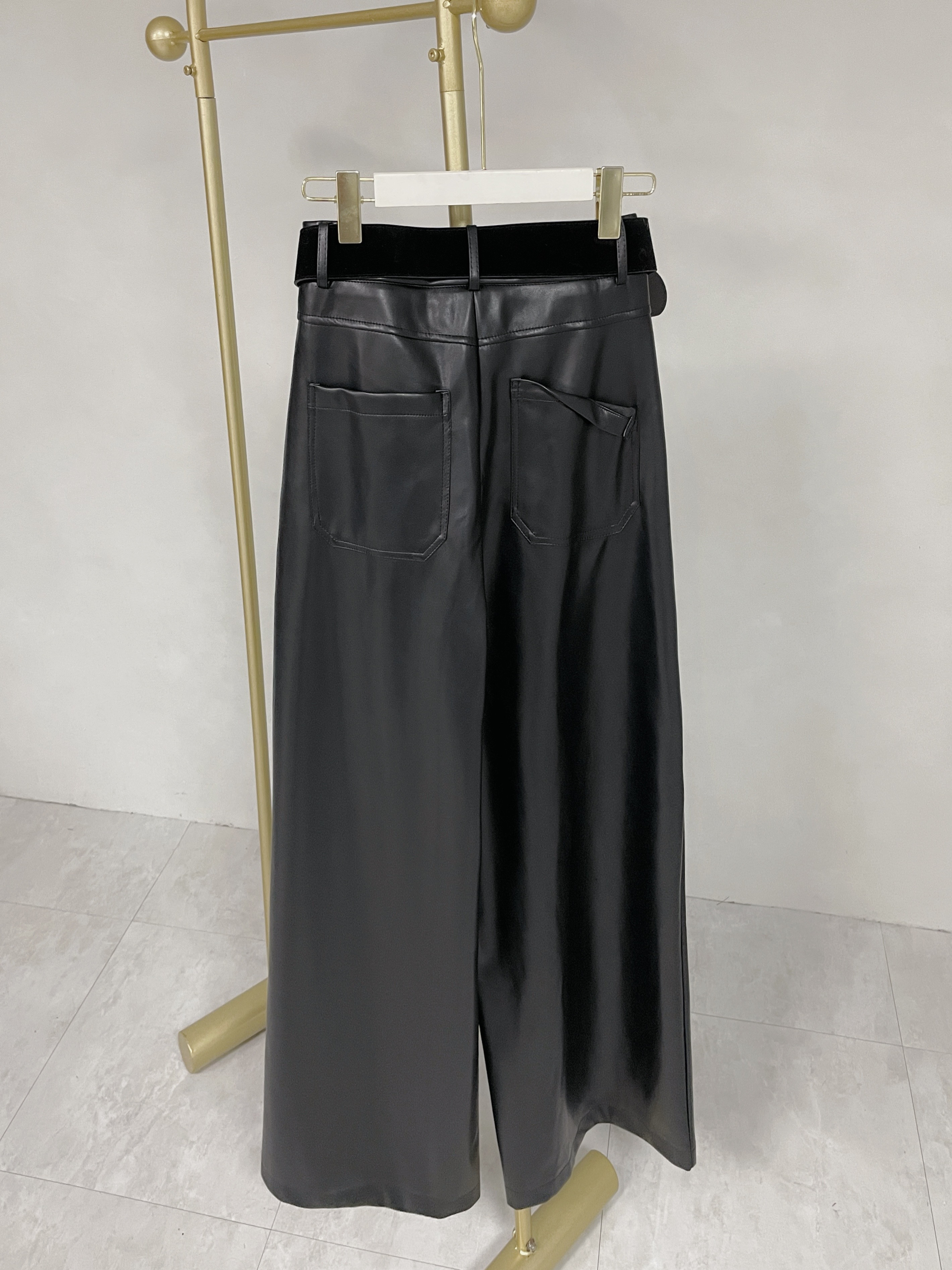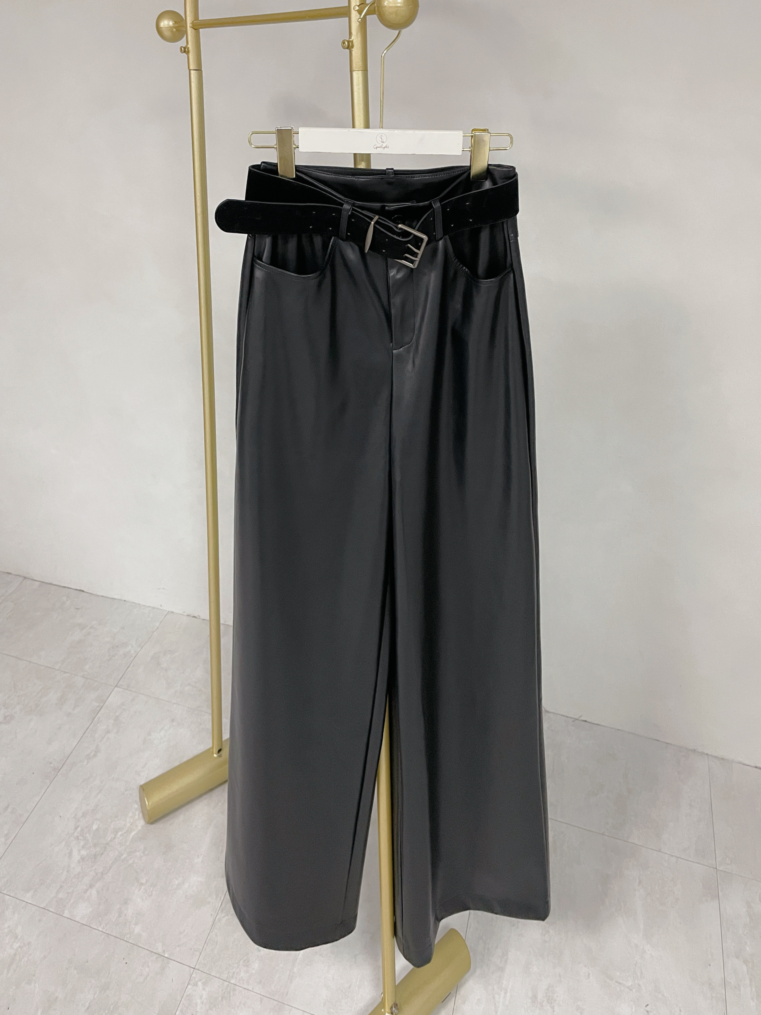 高階冷系 質感附腰帶皮革寬褲