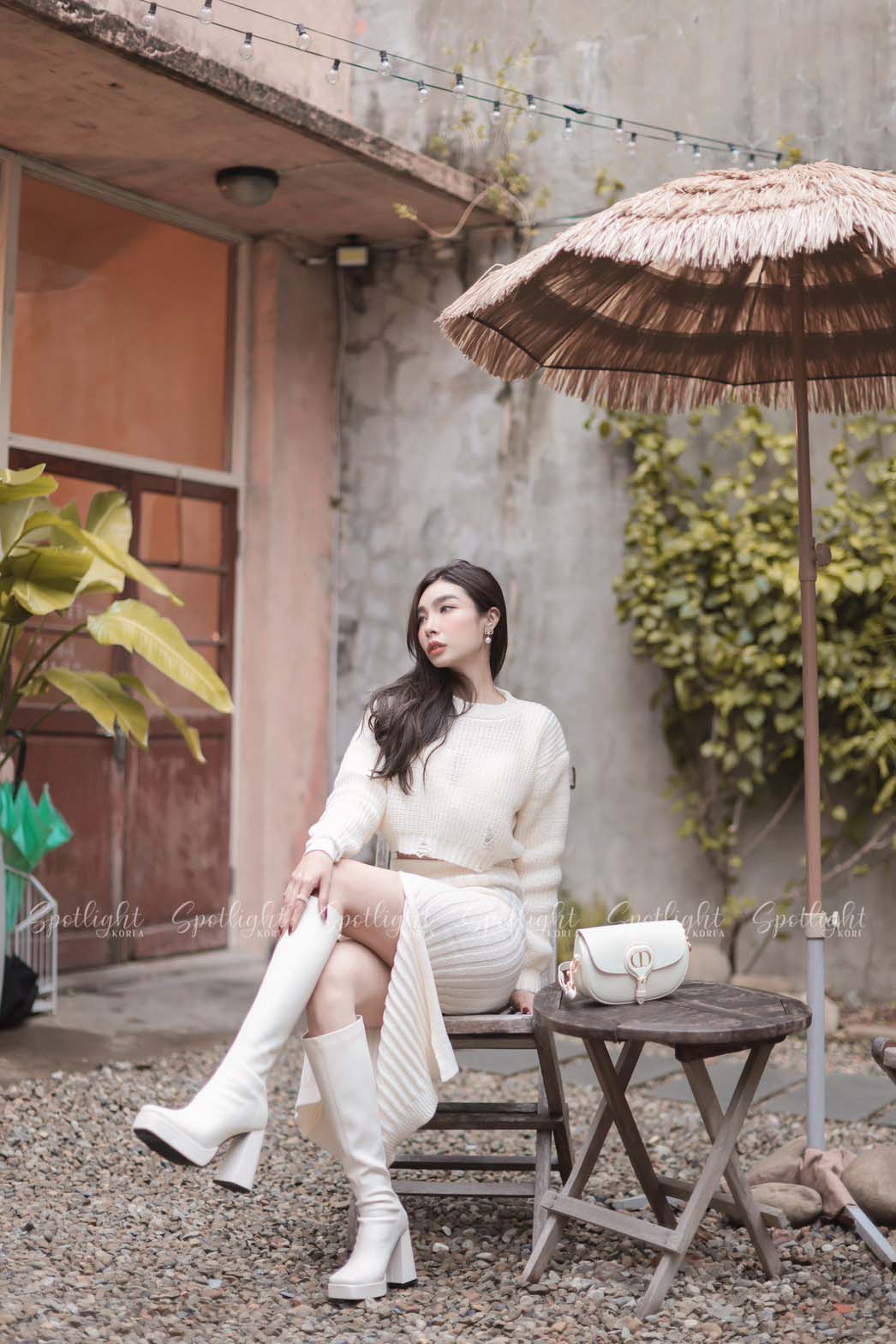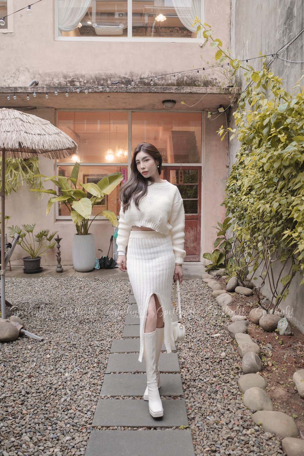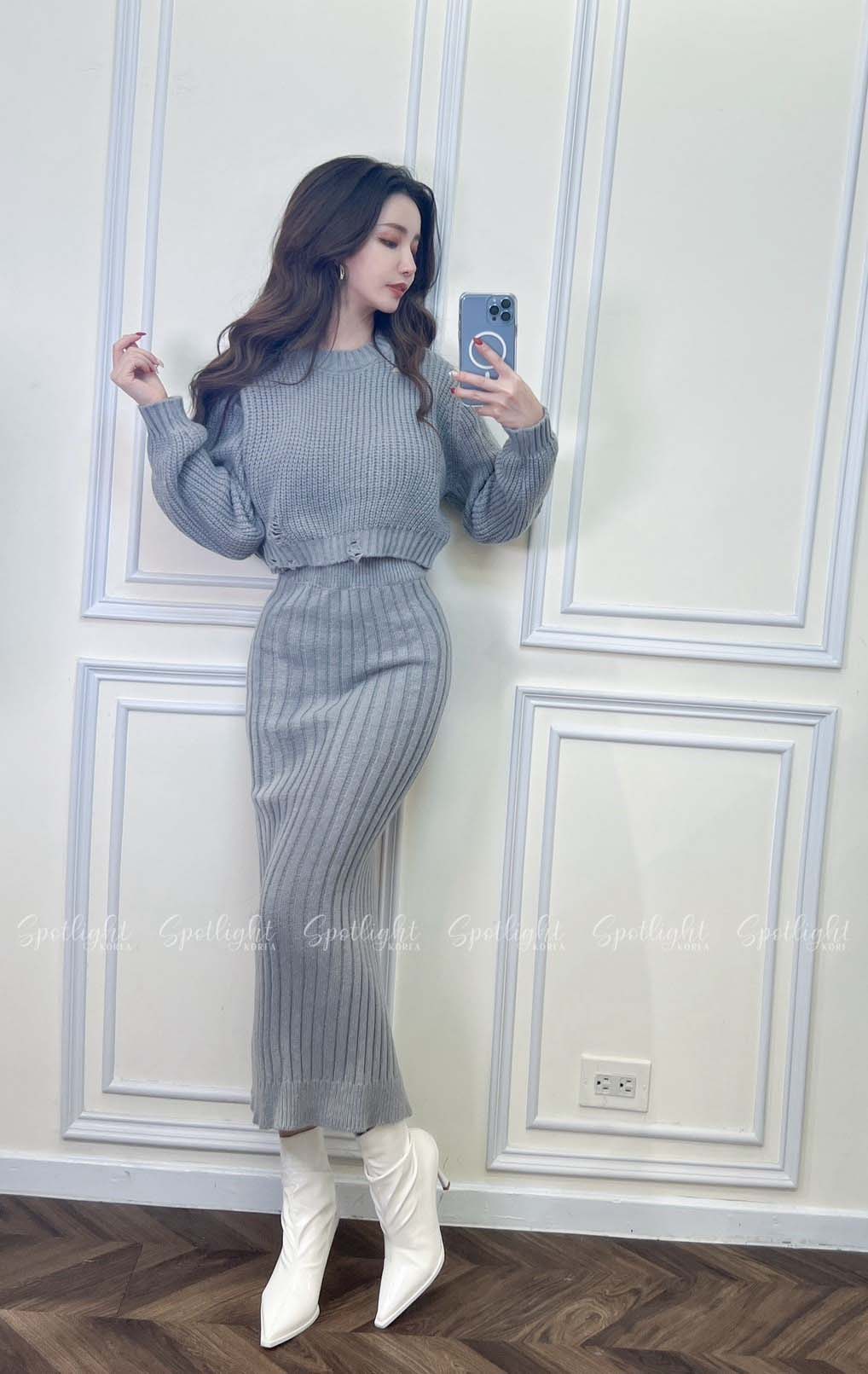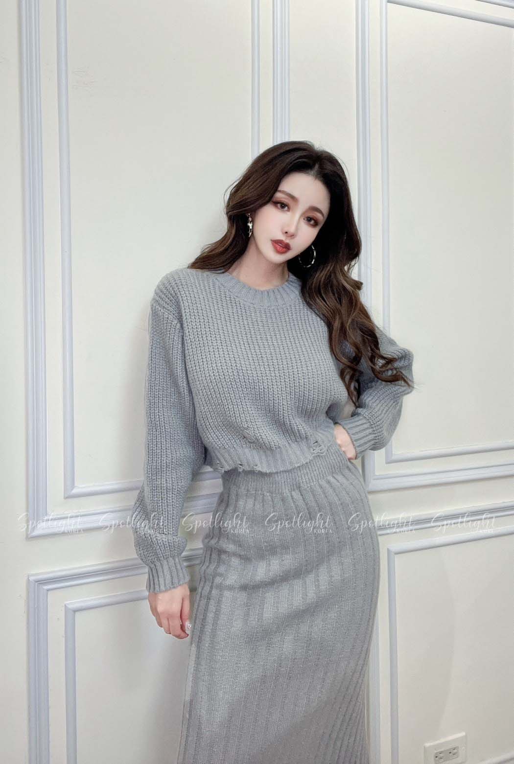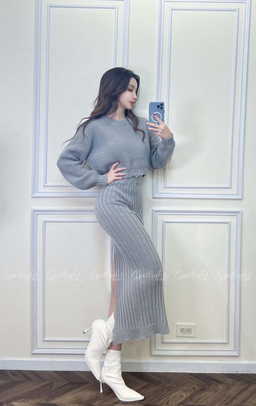 【SET】圓領造型洞洞毛衣+坑條開衩長裙