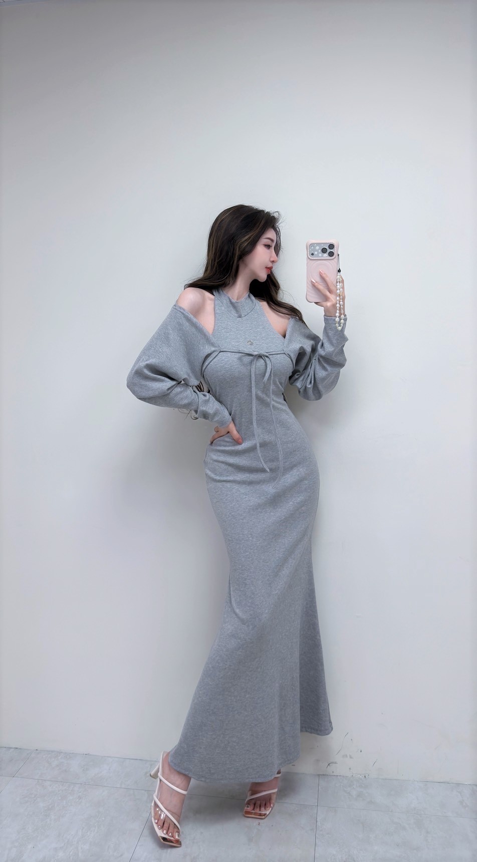 【SET】心動日常 韓國削肩美背羅紋長洋+綁繩罩衫