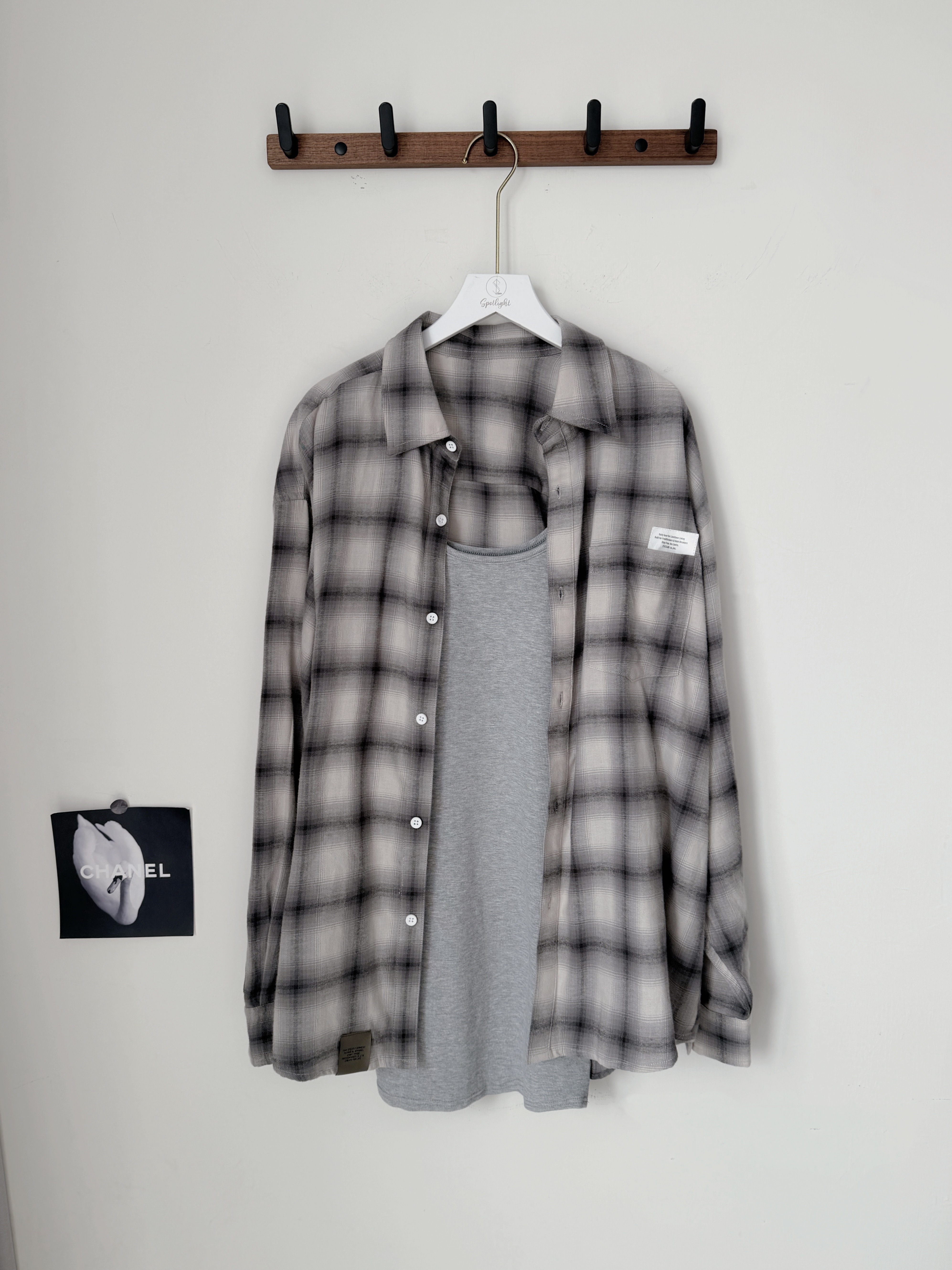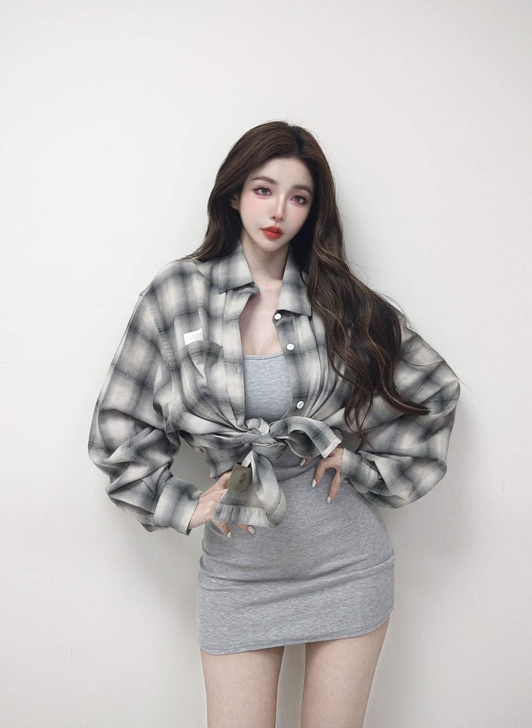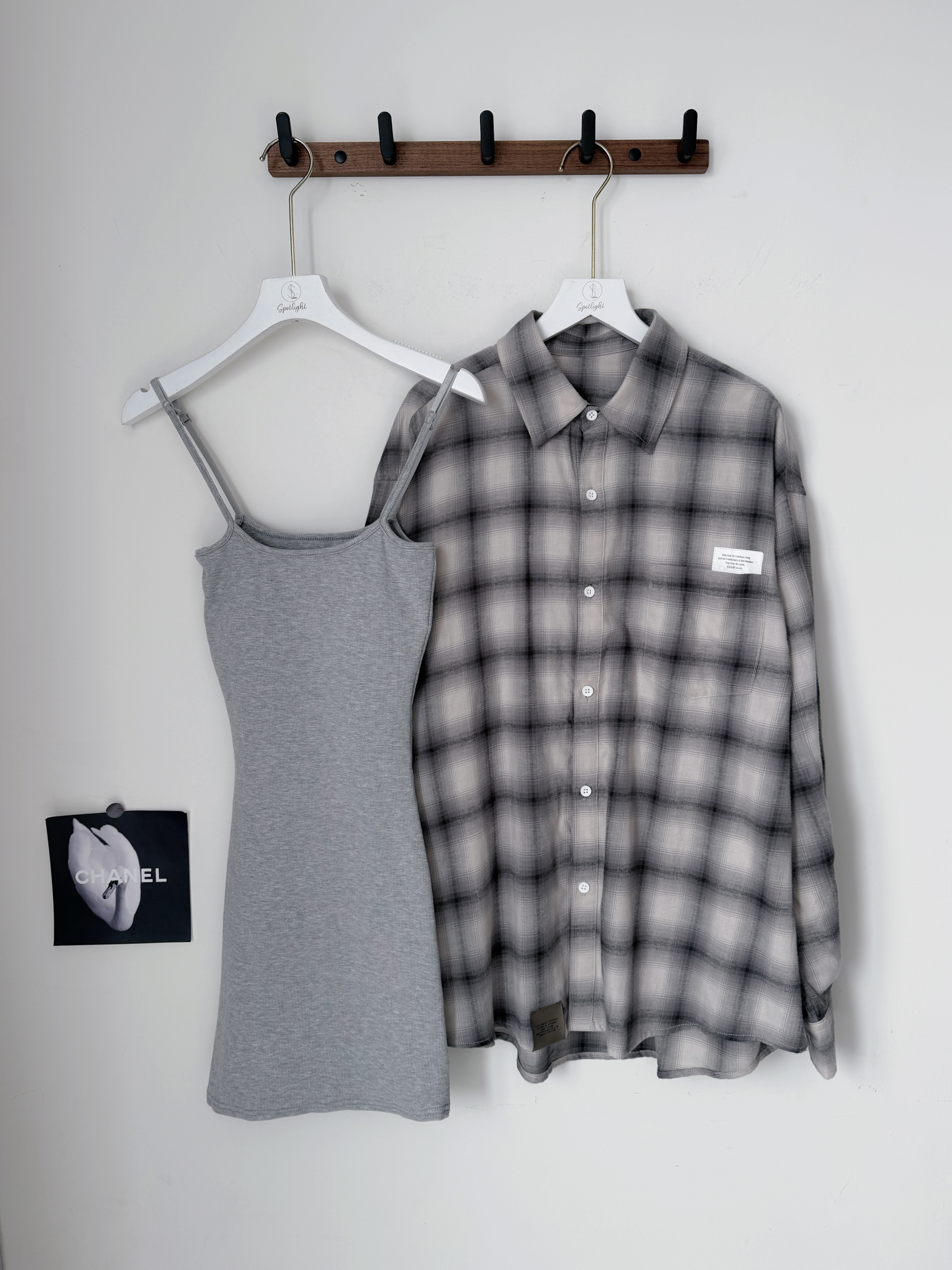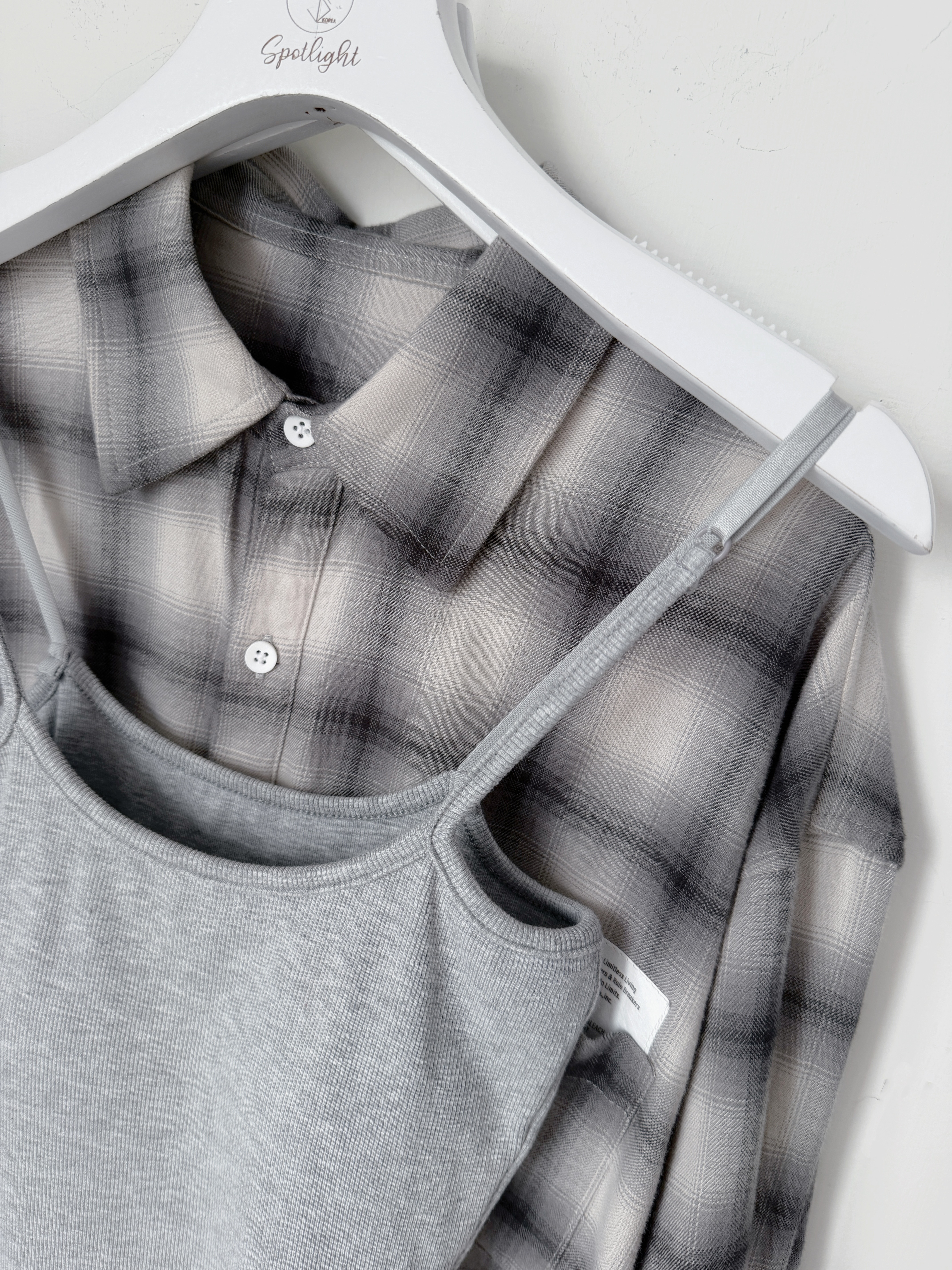 【SET】日常簡約 羅紋貼身素面短洋+格紋襯衫