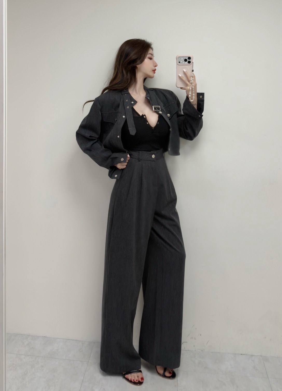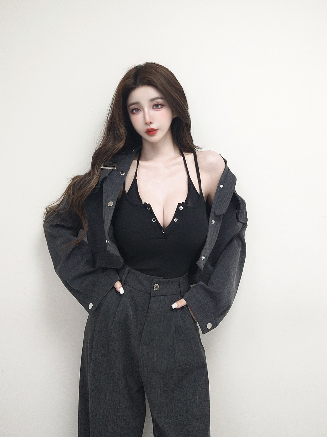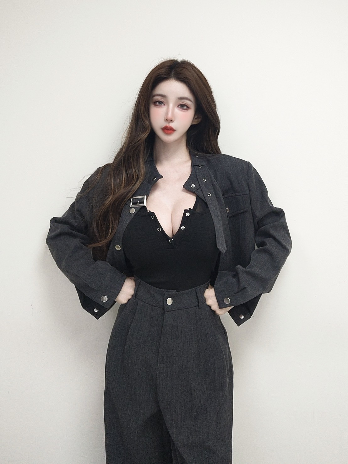 【SET】皮帶領口設計銀釦工裝套組