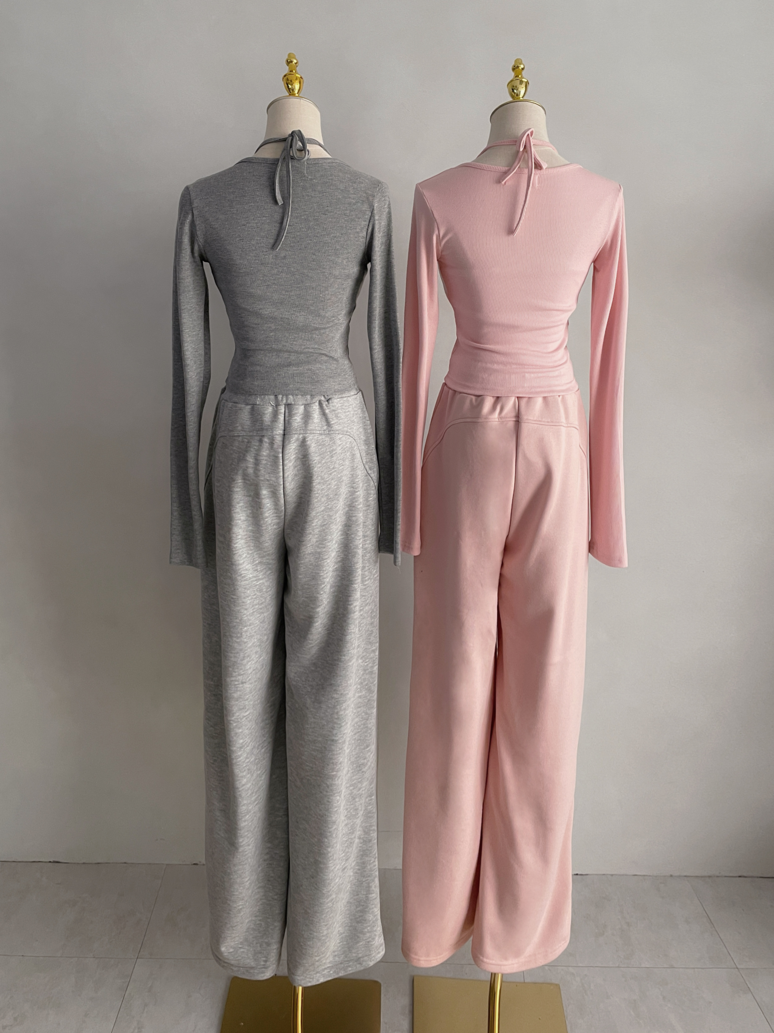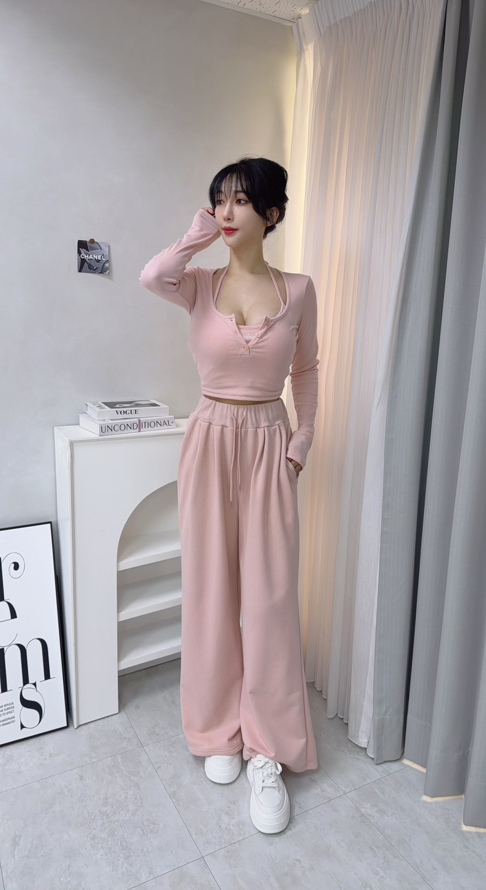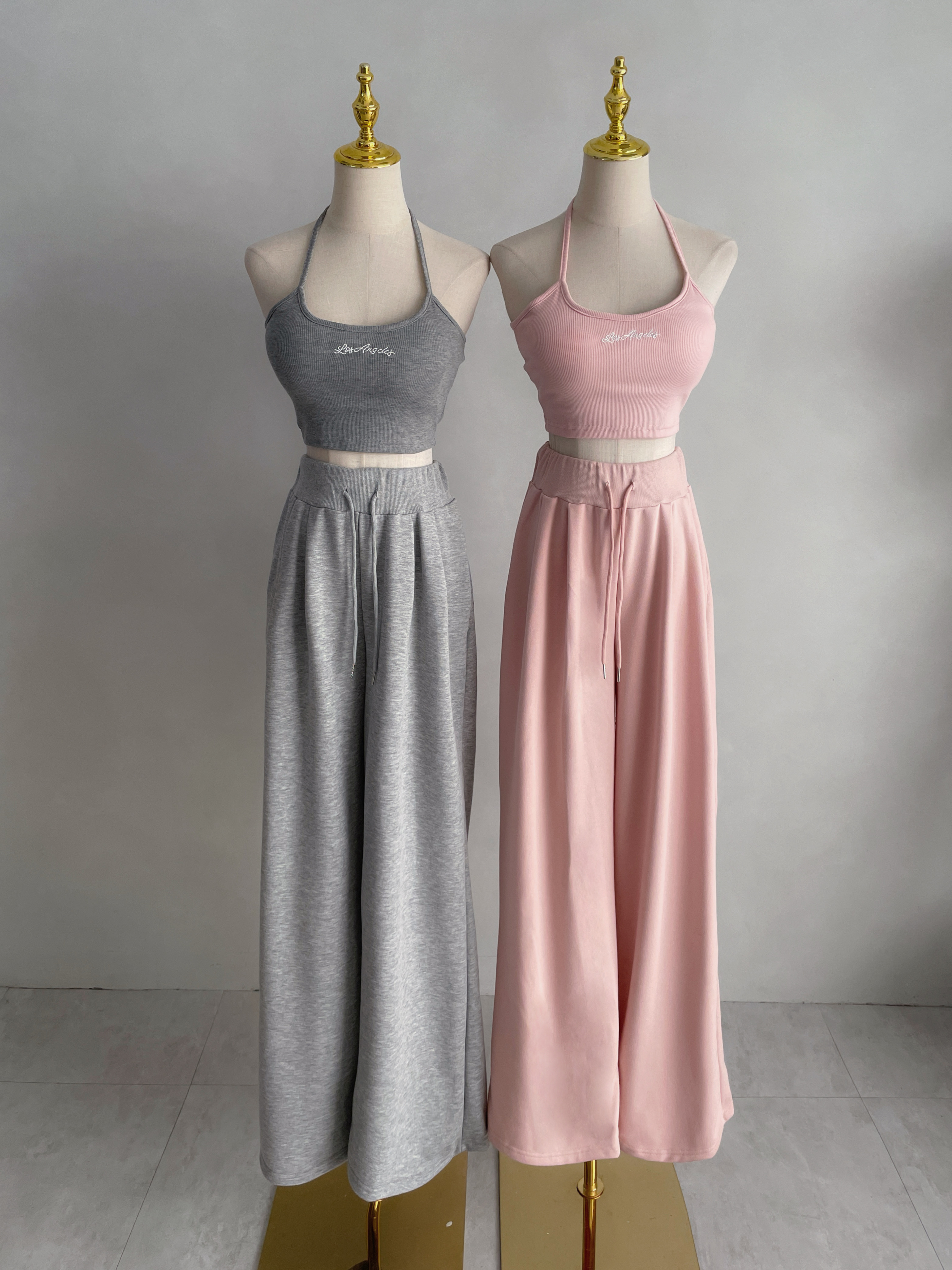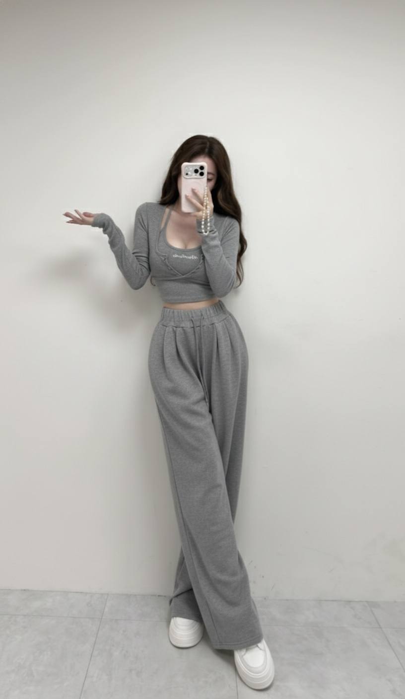 【SET】韓國羅紋繞脖刺繡字母背心+開釦衣+寬褲