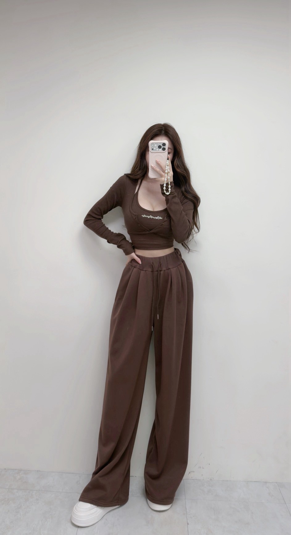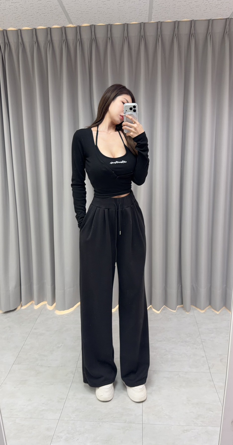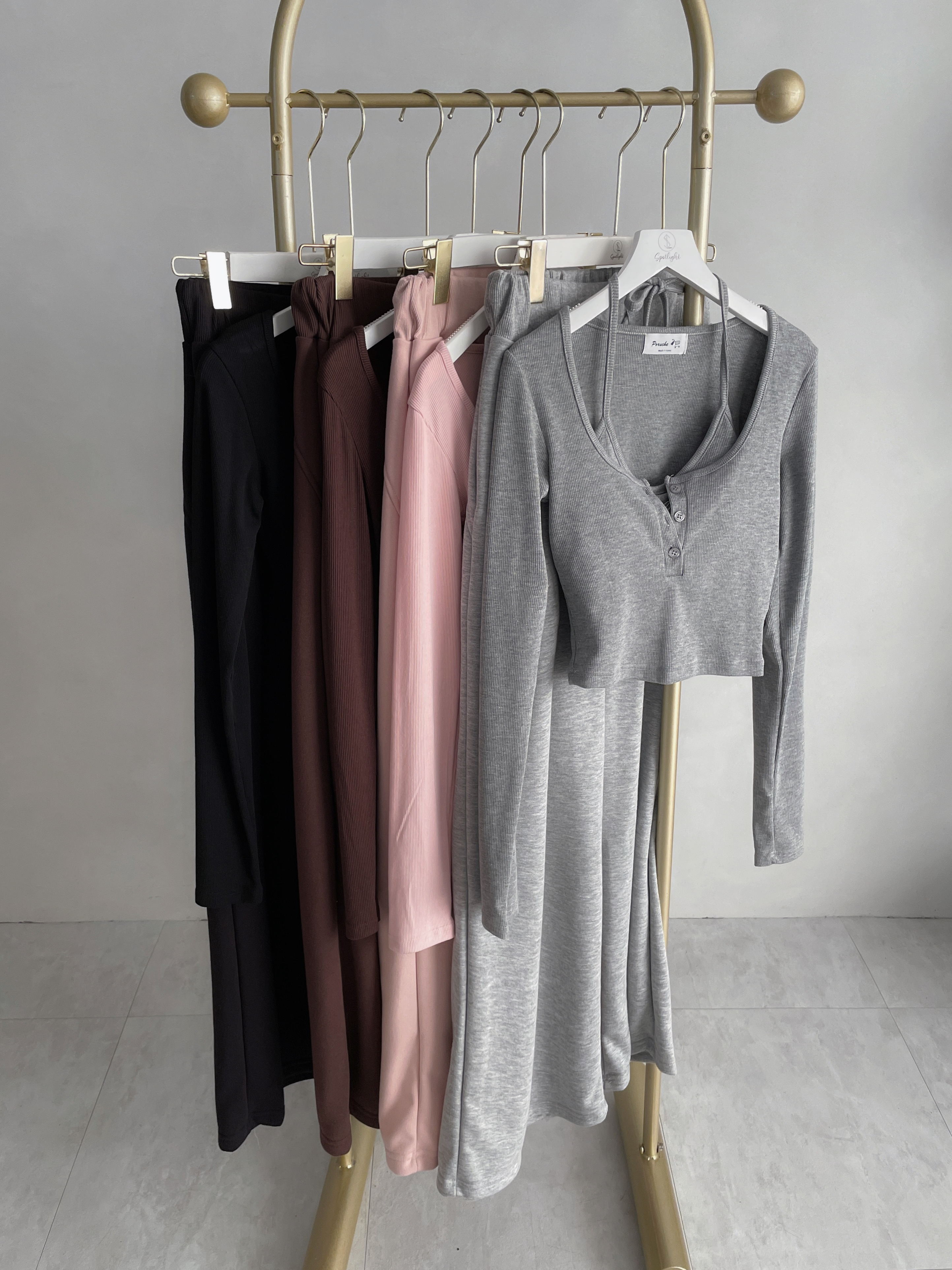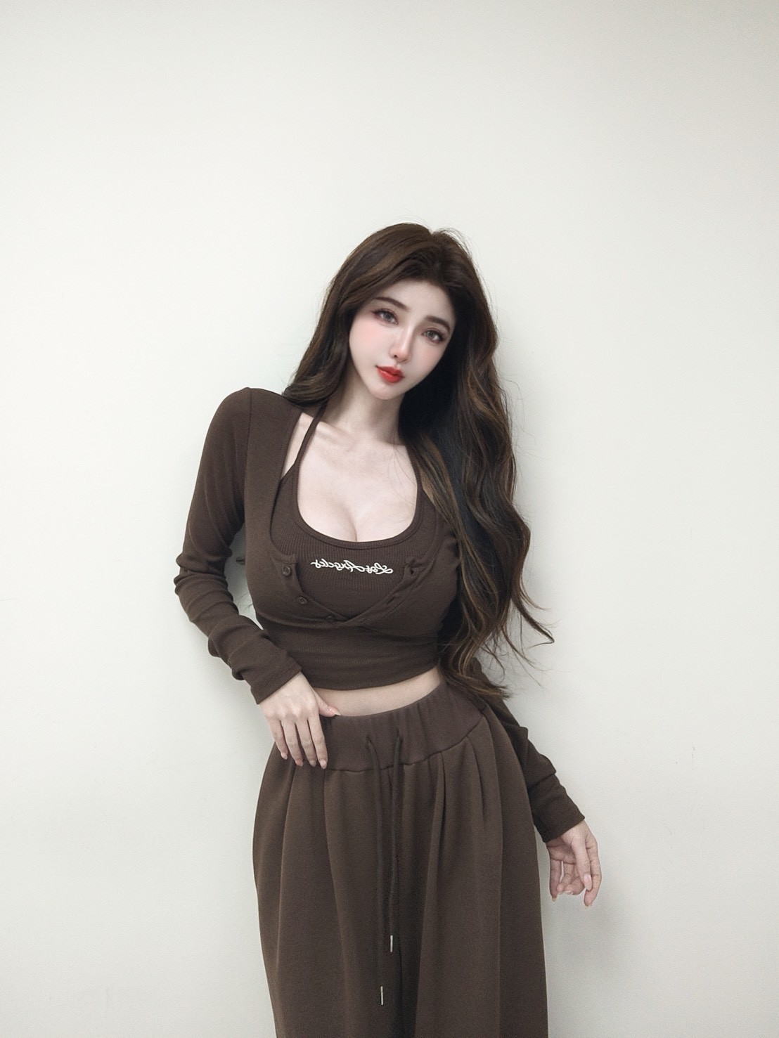 【SET】韓國羅紋繞脖刺繡字母背心+開釦衣+寬褲